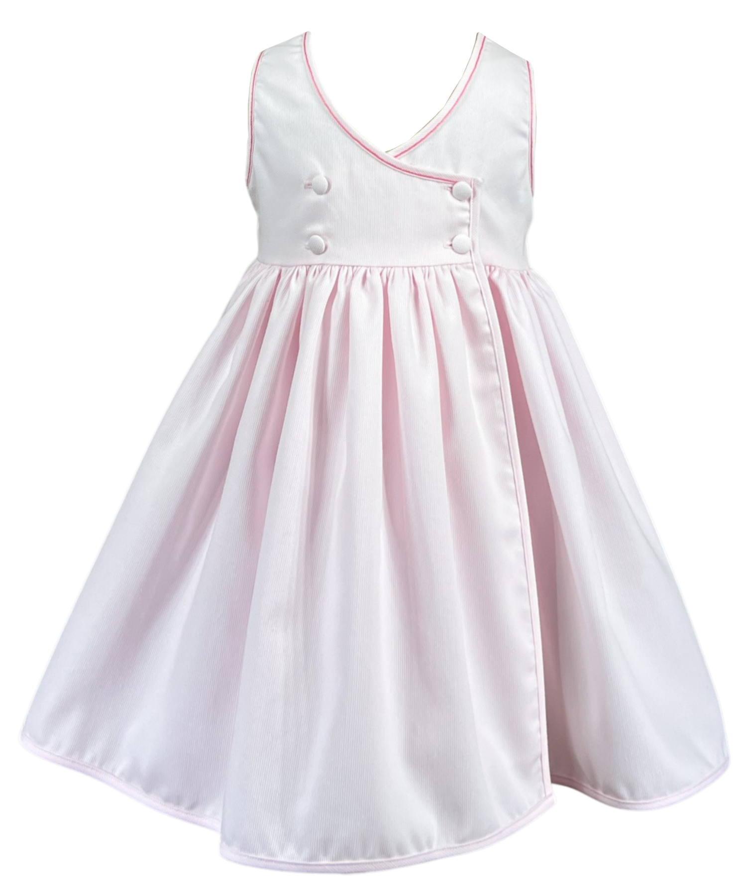 The round neckline is finished with soft pink piping and delicate threading. The back features our distinctive diagonal closure, fastened with self-covered buttons. Sleeveless, it is well suited to Spring and Summer.