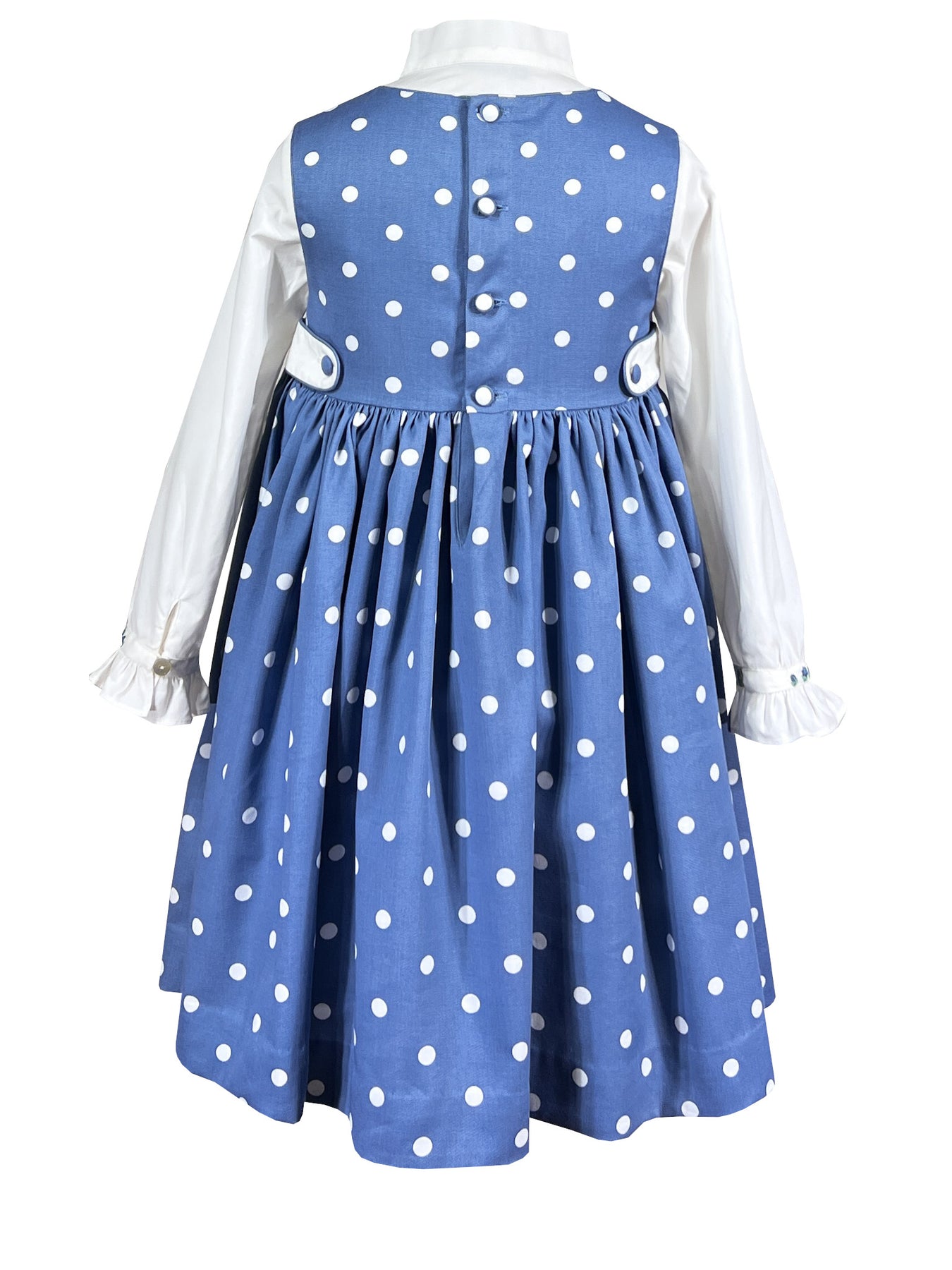 The Dot to Dot pinafore brings together heritage and whimsy in cornflower blue cotton scattered with white polka dots. The soft, supple fabric drapes beautifully, while the white smocked waistband features a delicate frieze of blue daisies with mint green foliage. Side belts and self covered buttons meticulously crafted from the white dots themselves blend in perfectly with the design.
