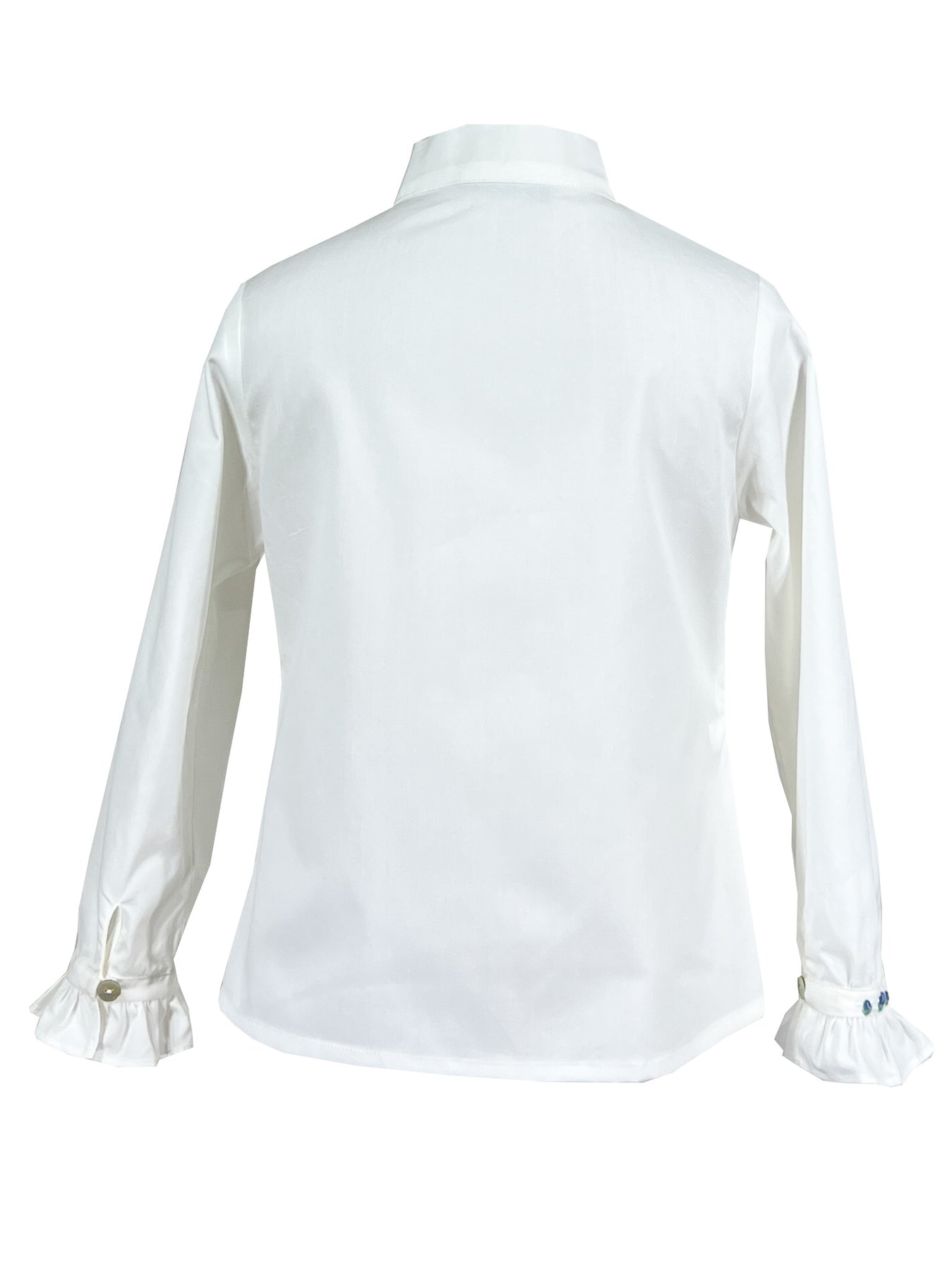The pinafore is designed to be worn over a crisp white cotton blouse with a distinctive Lavallière bow collar, a detail that traces back to the elegance of Versailles. The collar is finished with embroidery in blue and mint that echoes the smocking, while long sleeves with ruffled cuffs feature matching embroidered details. Together, the pieces create a refined ensemble that balances formality with playful charm.