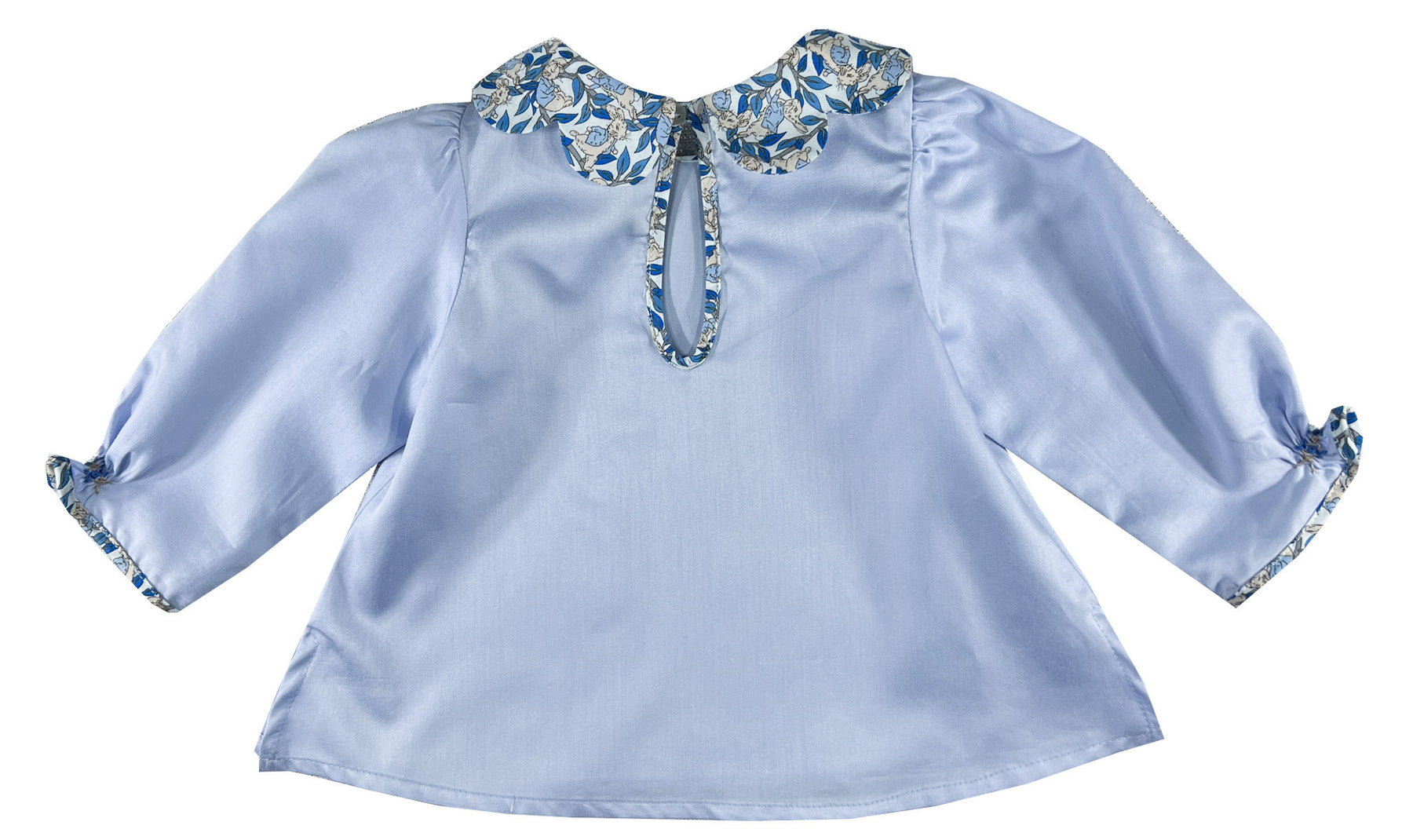 The Peter Rabbit style scallop baby girl blouse offers a charming interpretation of storybook dressing. The body is crafted in soft periwinkle blue, while the distinctive scallop petal collar and long sleeves piping showcase the enchanting Liberty print on white background, featuring gentle rabbits in soft beige with pale blue jackets nestled among delicate blue foliage.