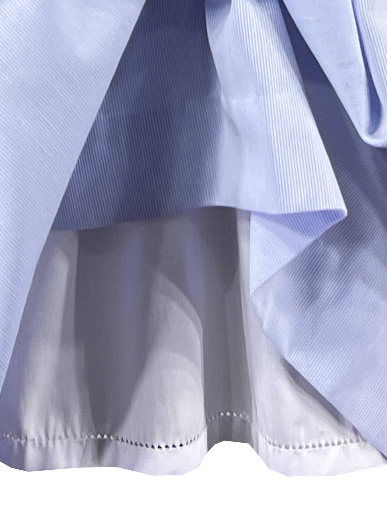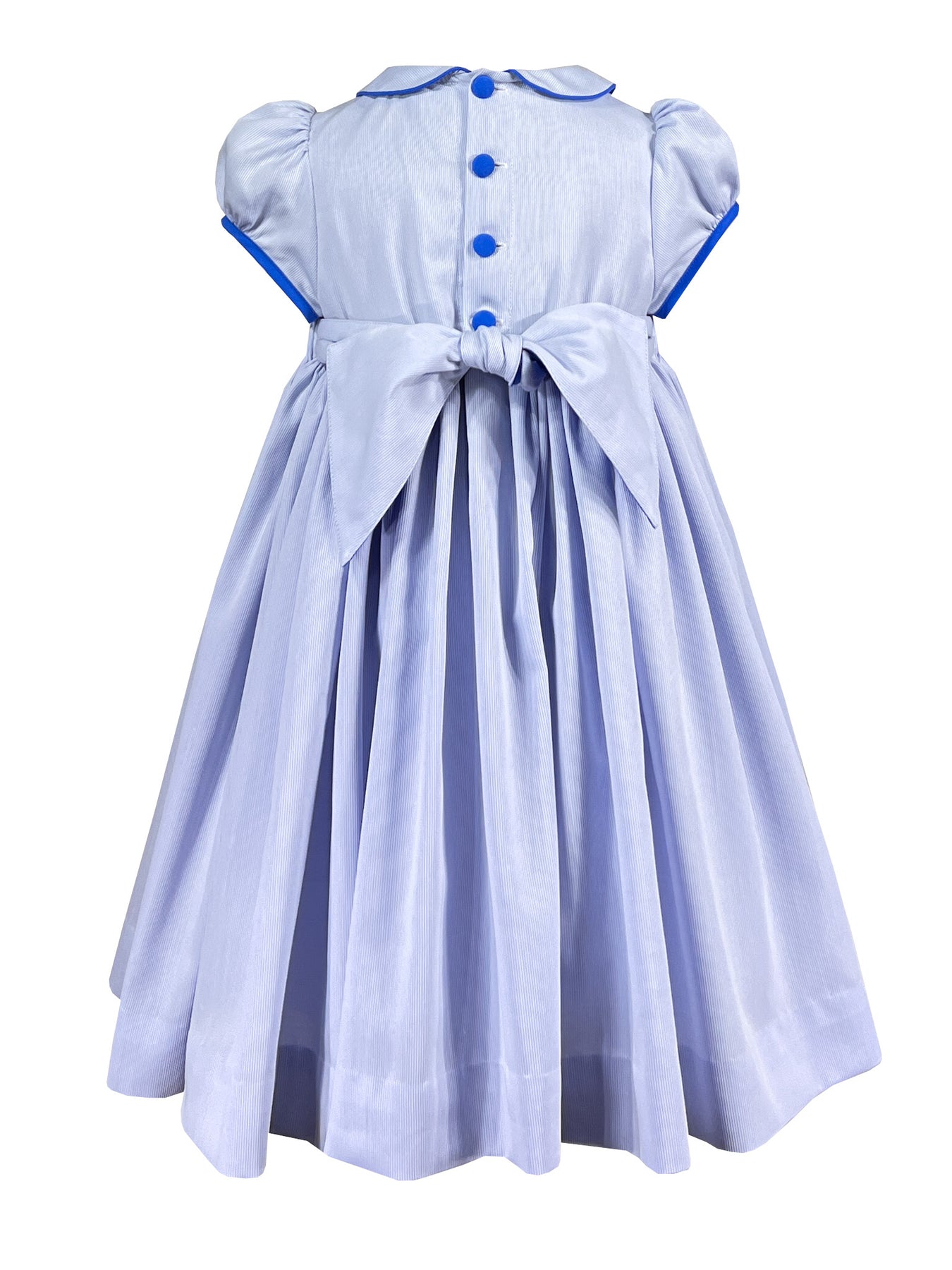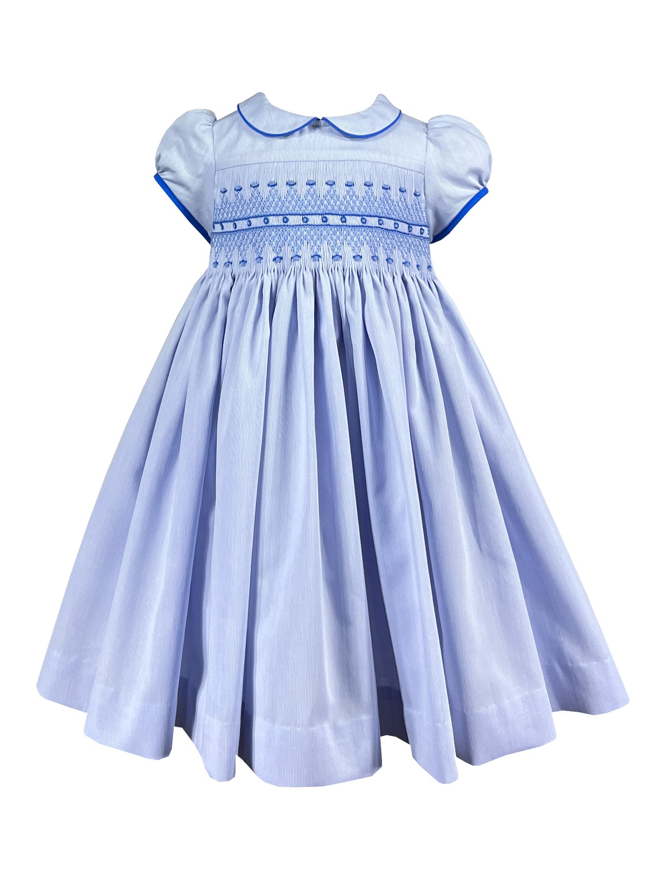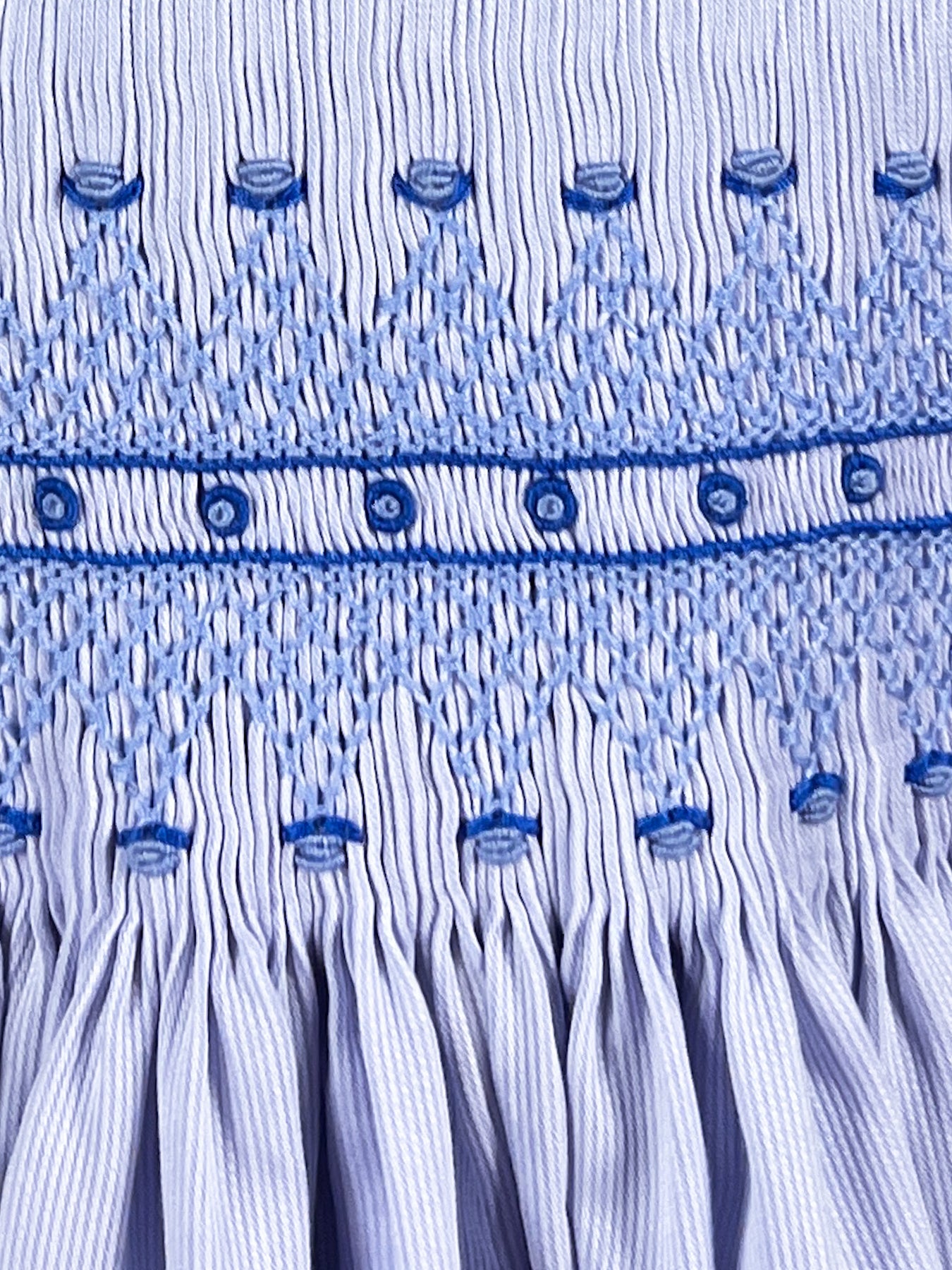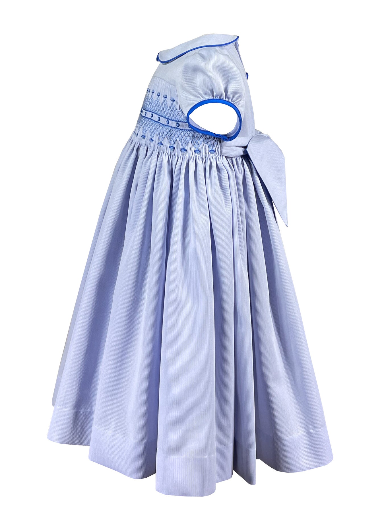 The Perpetual Blue dress is crafted in very fine blue and white thinly striped cotton that creates a subtle, sophisticated texture. The bodice features intricate geometric smocking that extends across the chest, showcasing the precision and artistry of traditional handwork. A Peter Pan collar trimmed with royal blue piping frames the neckline, while puffed sleeves echo the same crisp piping detail.