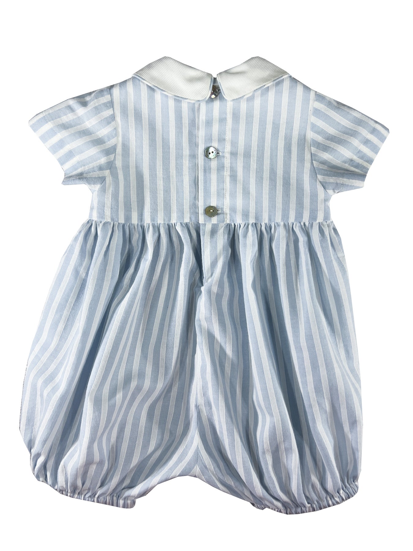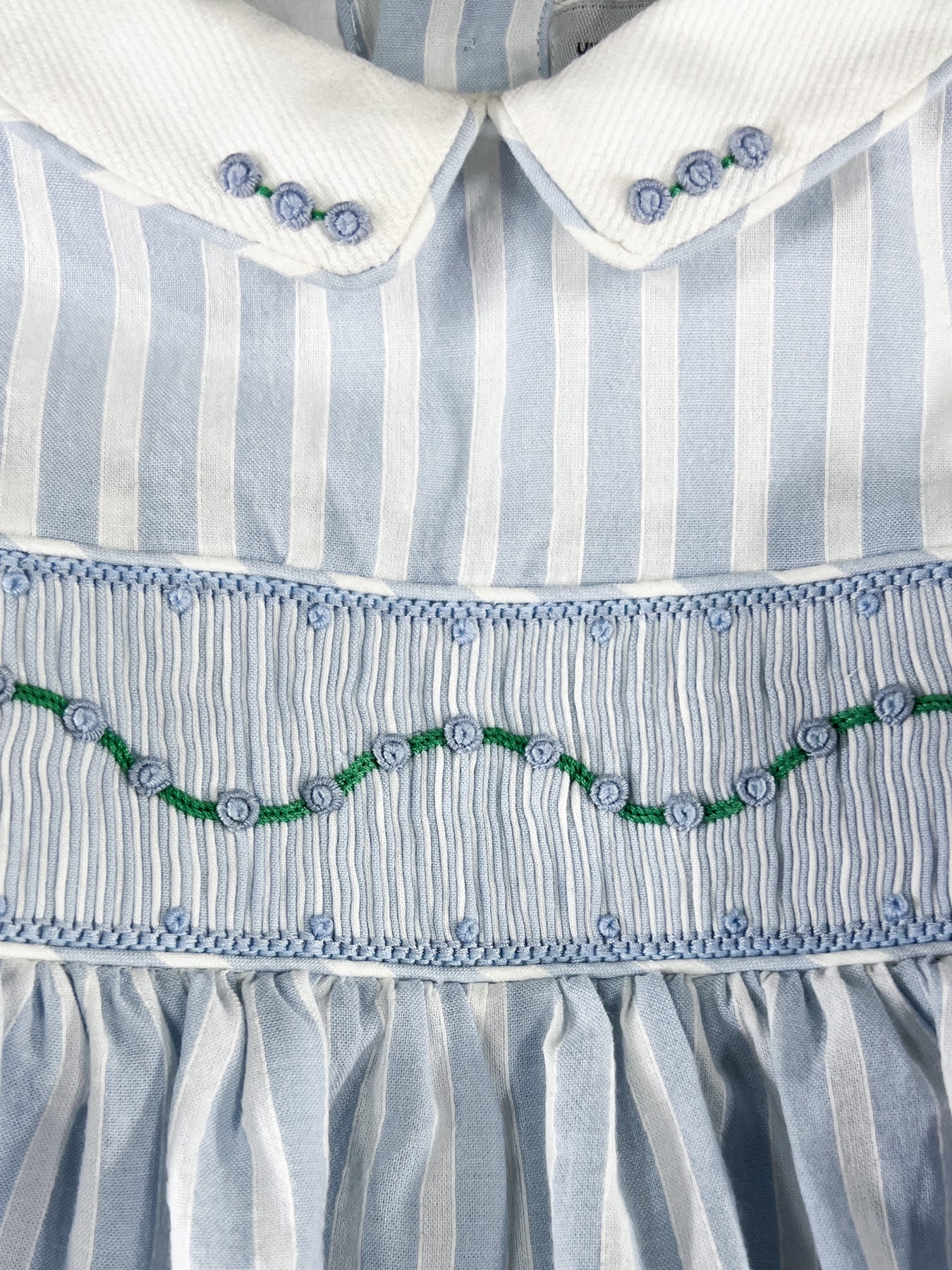 This blue striped bubble romper echoes the maritime elegance of the coordinated Riviera dress in a playful silhouette perfect for babies. Fine blue and white stripes create a crisp foundation for the smocked chest band, which features a charming wave pattern with blue and green accents that bring a touch of coastal garden romance.