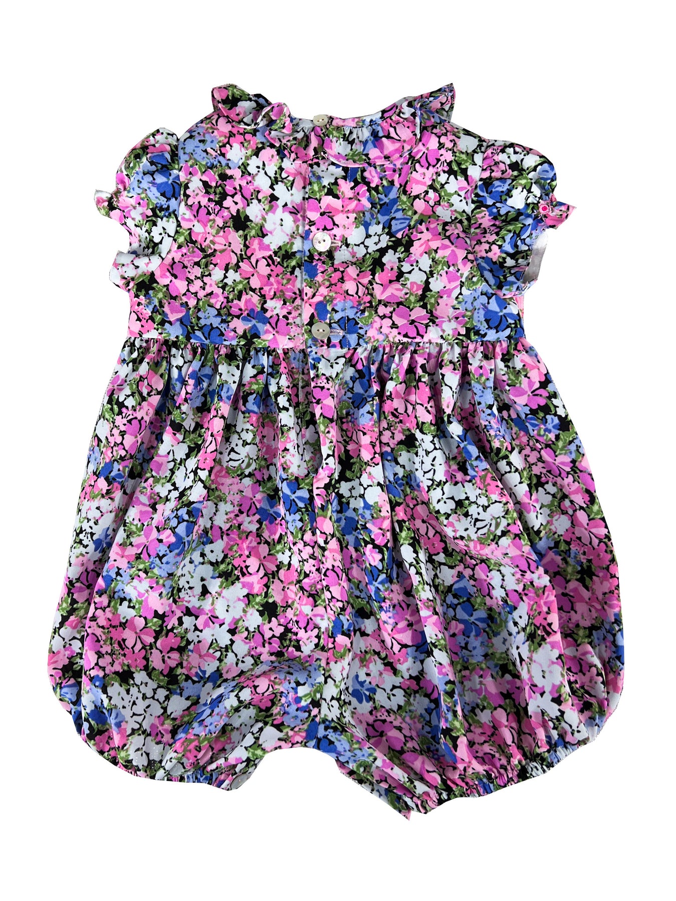 The Thousand Blooms bubble captures the same spirit of joyful abundance as the matching dress. The smocked band in bright pink features an intricate diamond pattern adorned with delicate rick rack lines and miniature rosebuds. The rest of the silhouette features a profusion of tiny multi-colored blooms scattered across black fabric creating a garden of endless discovery, where pink, blue, white, and green flowers dance together in cheerful harmony.