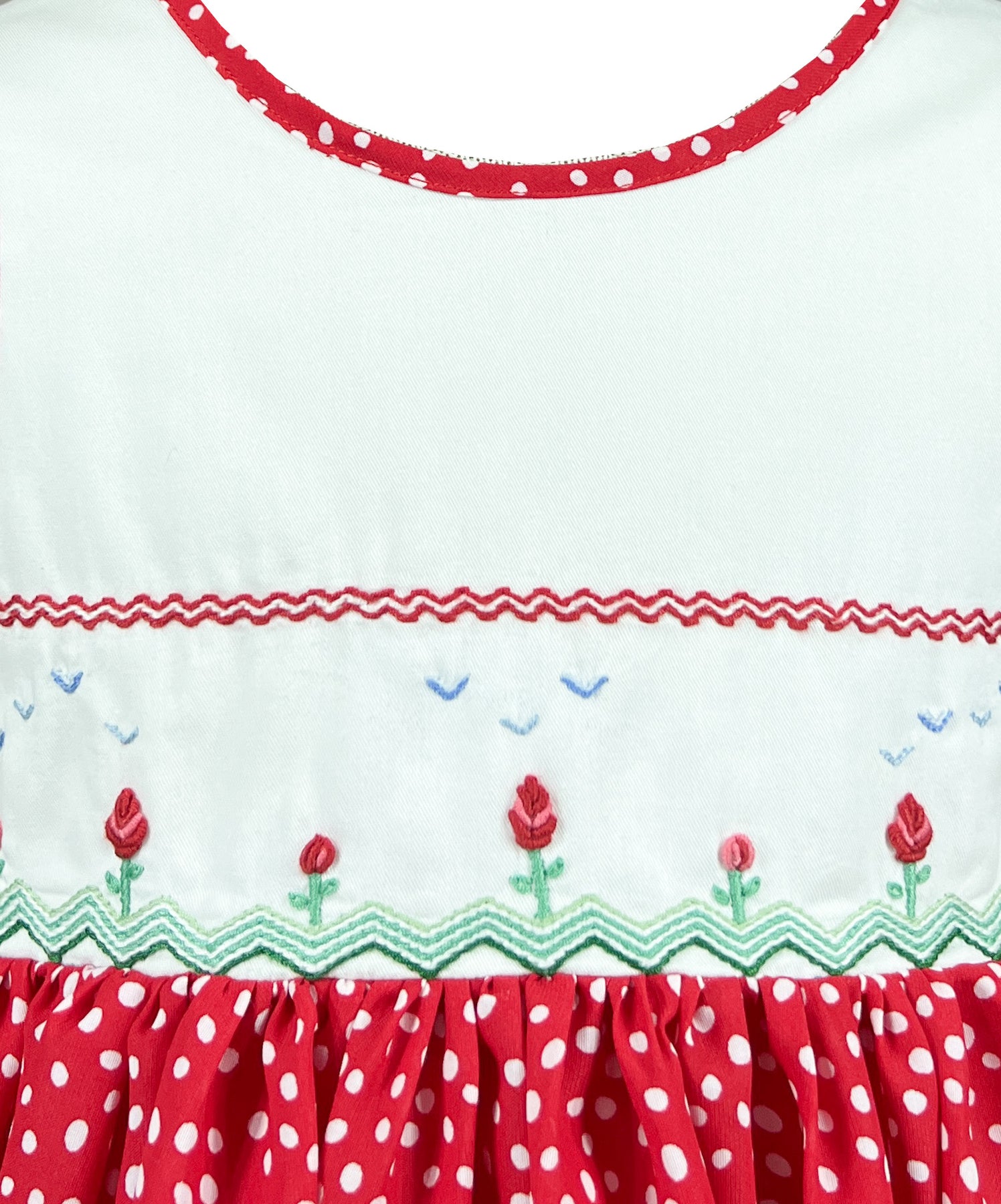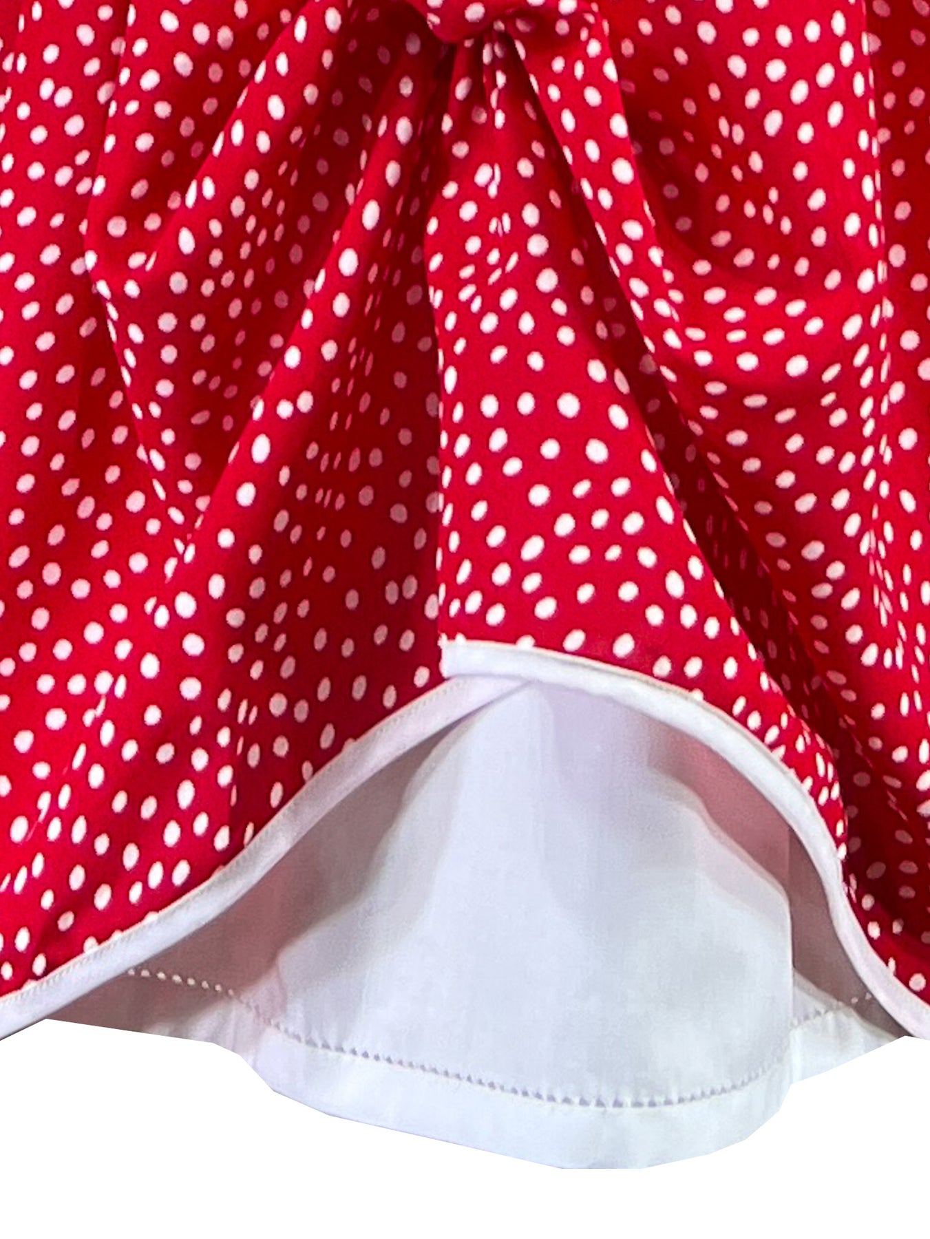 This delightful Spring Summer dress features a round neckline and sleeveless silhouette perfect for outdoor celebrations. The white chest panel is bordered with coordinating red polka dot trim, creating overall harmony.