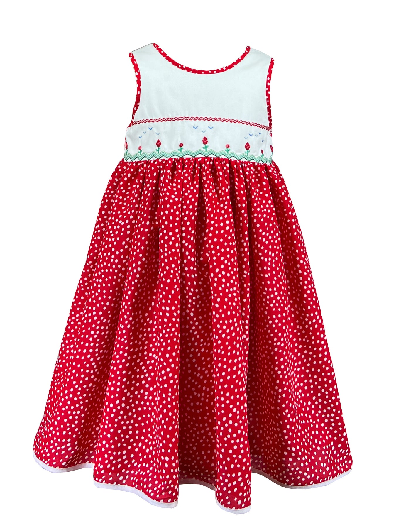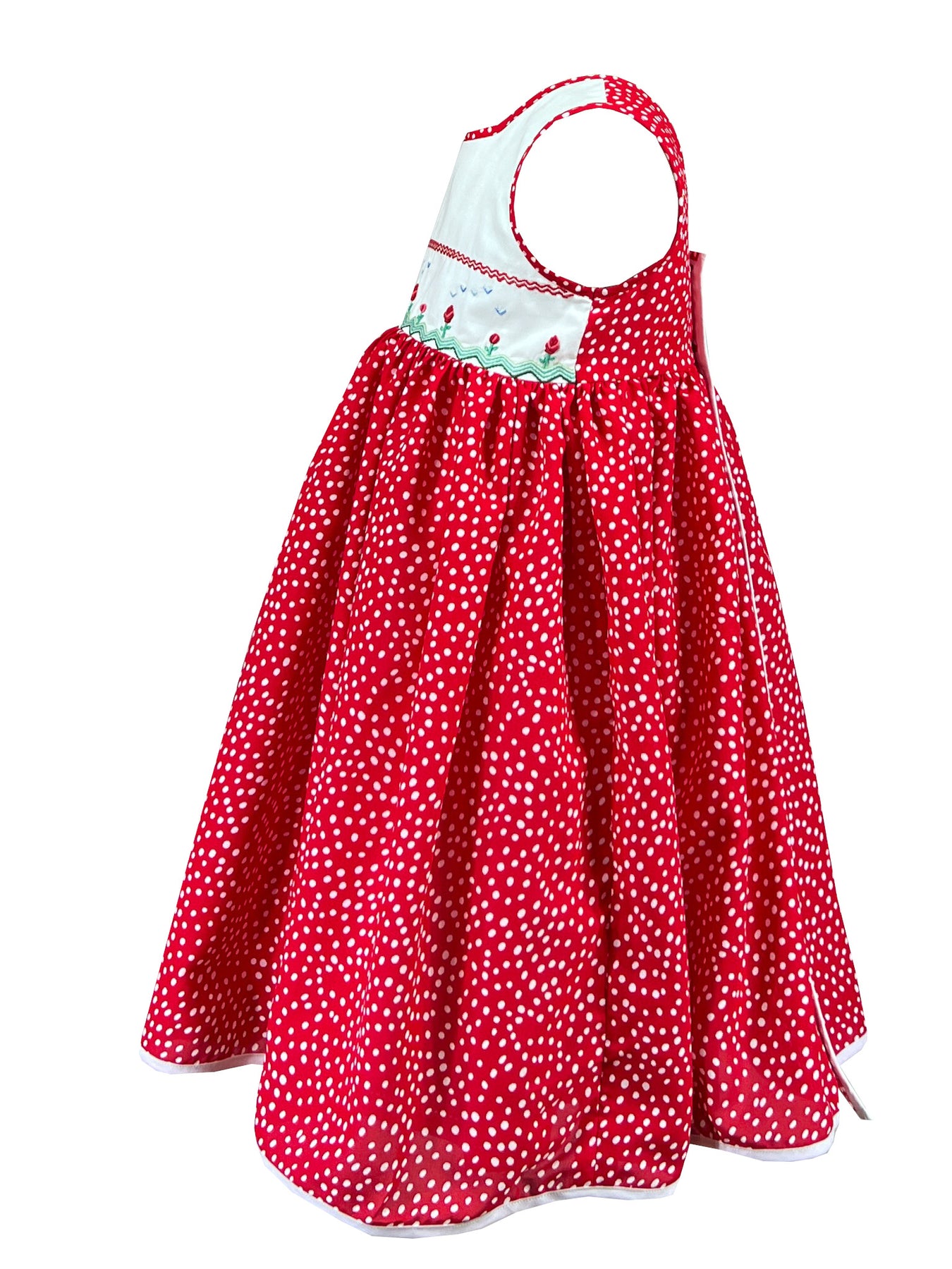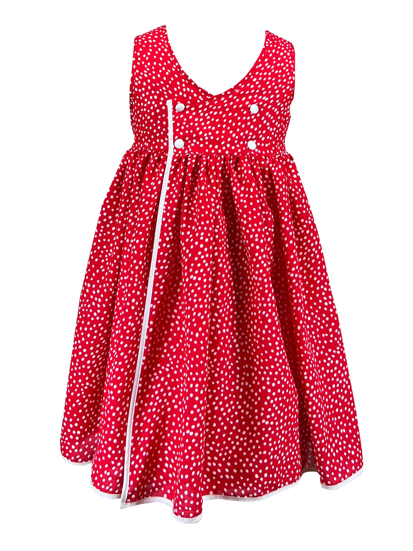 The bodice is secured with self-covered buttons and features crossback straps for comfortable wear. The skirt blooms in crimson red fabric scattered with playful white polka dots, while white trim accents the hem and back opening for a polished finish.
