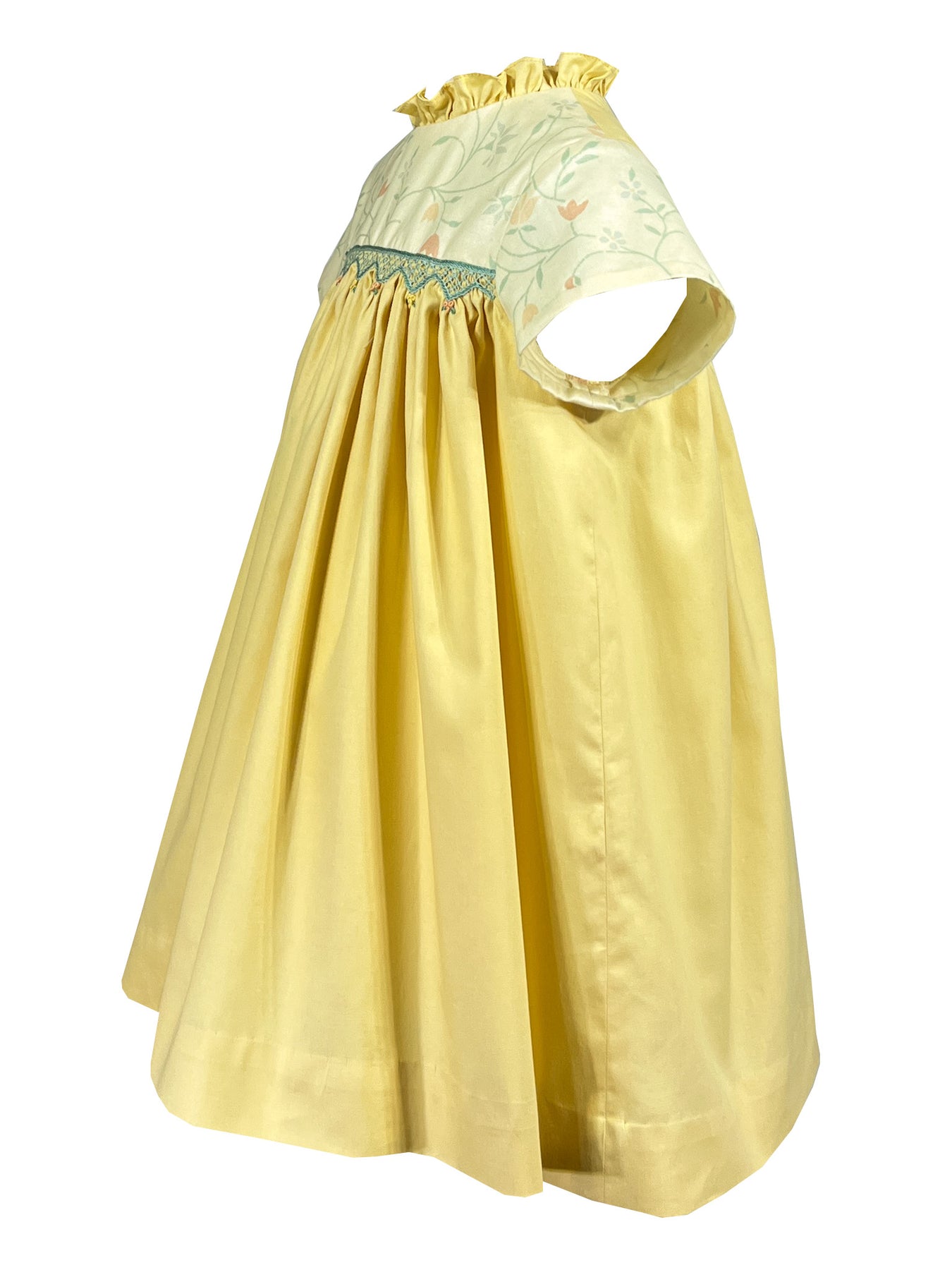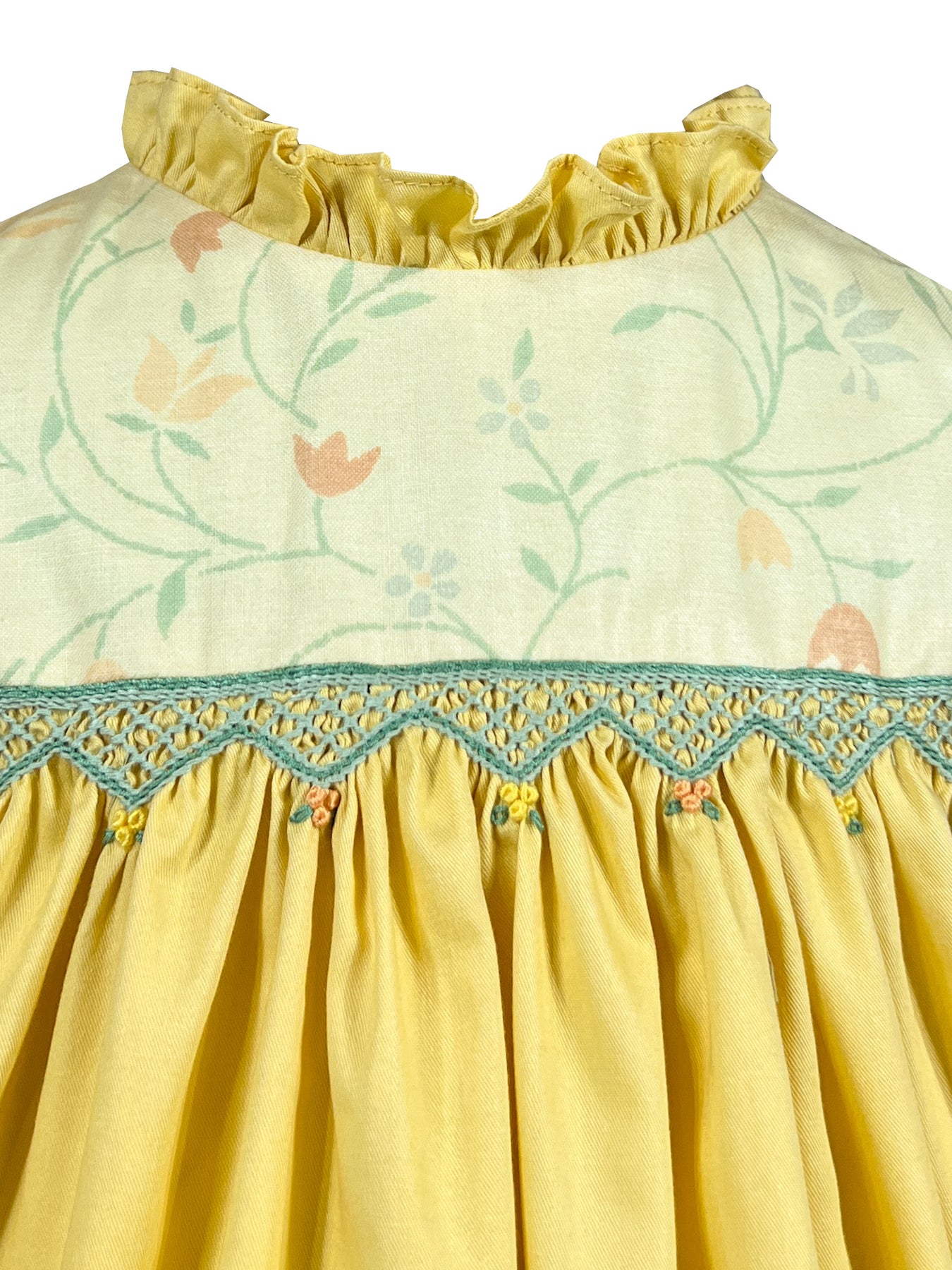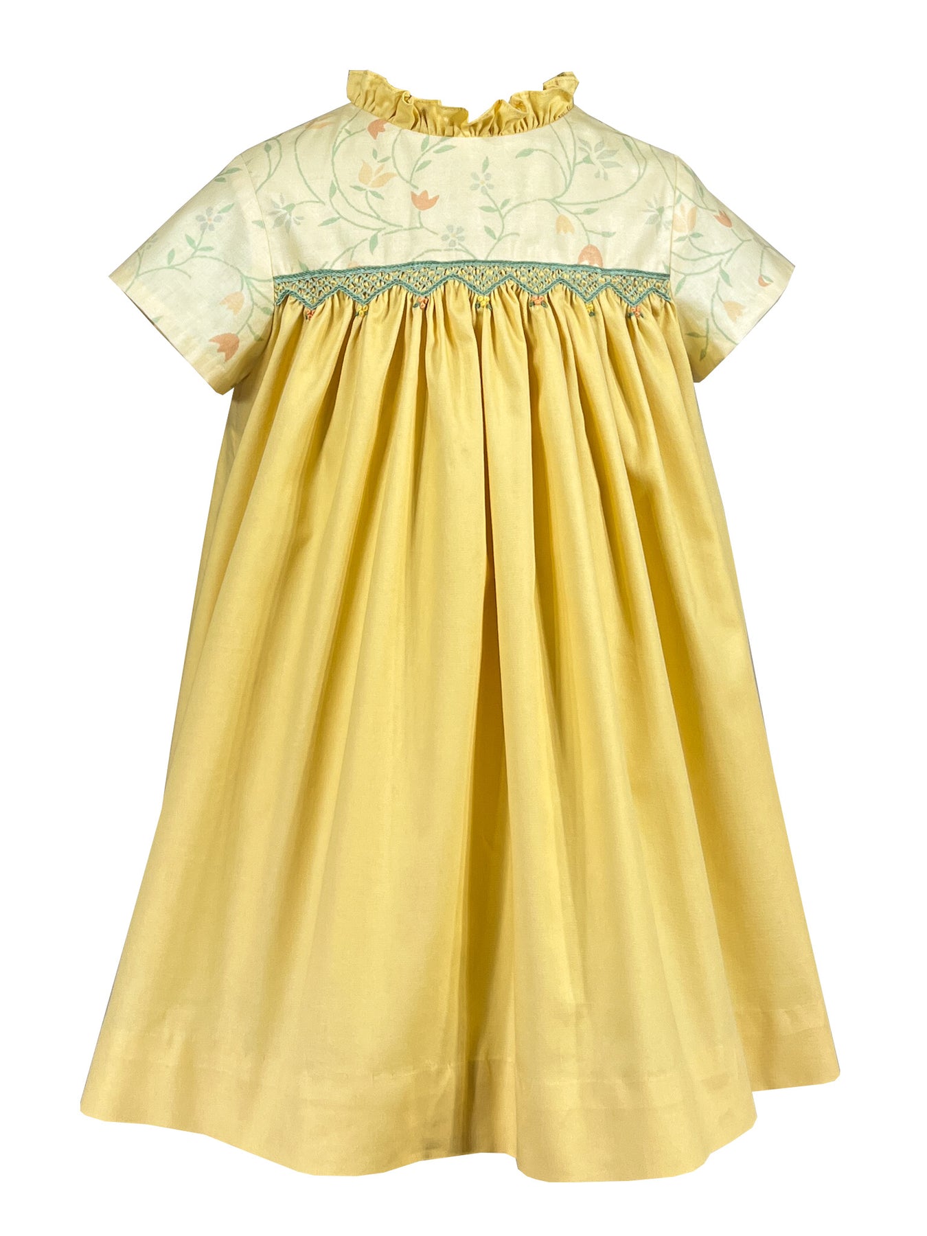 At the empire waist, exquisite hand-smocking creates a beautiful bridge between the floral bodice and sunny yellow skirt. Self-covered buttons complete the look.