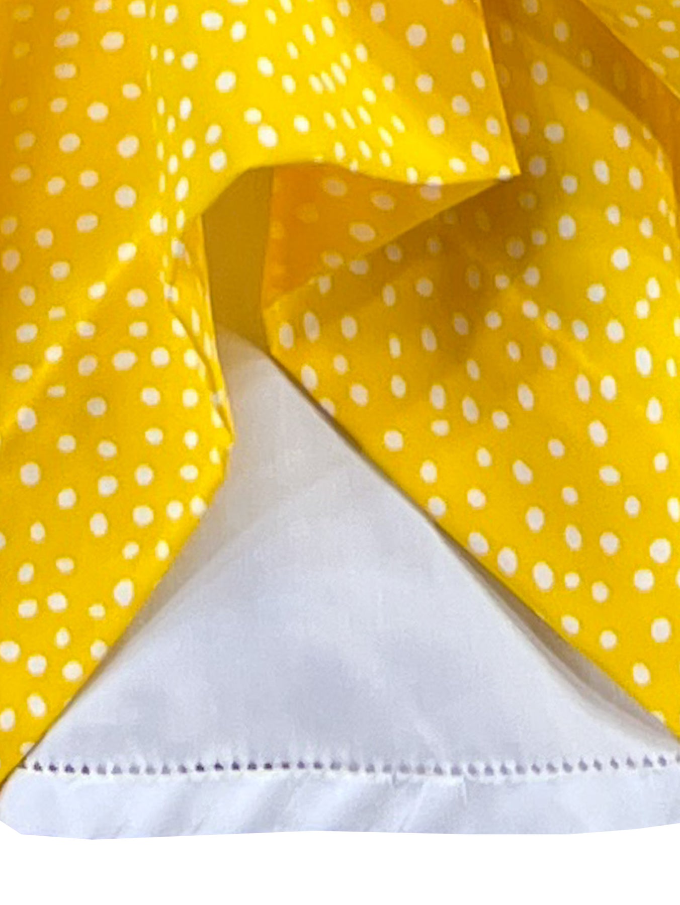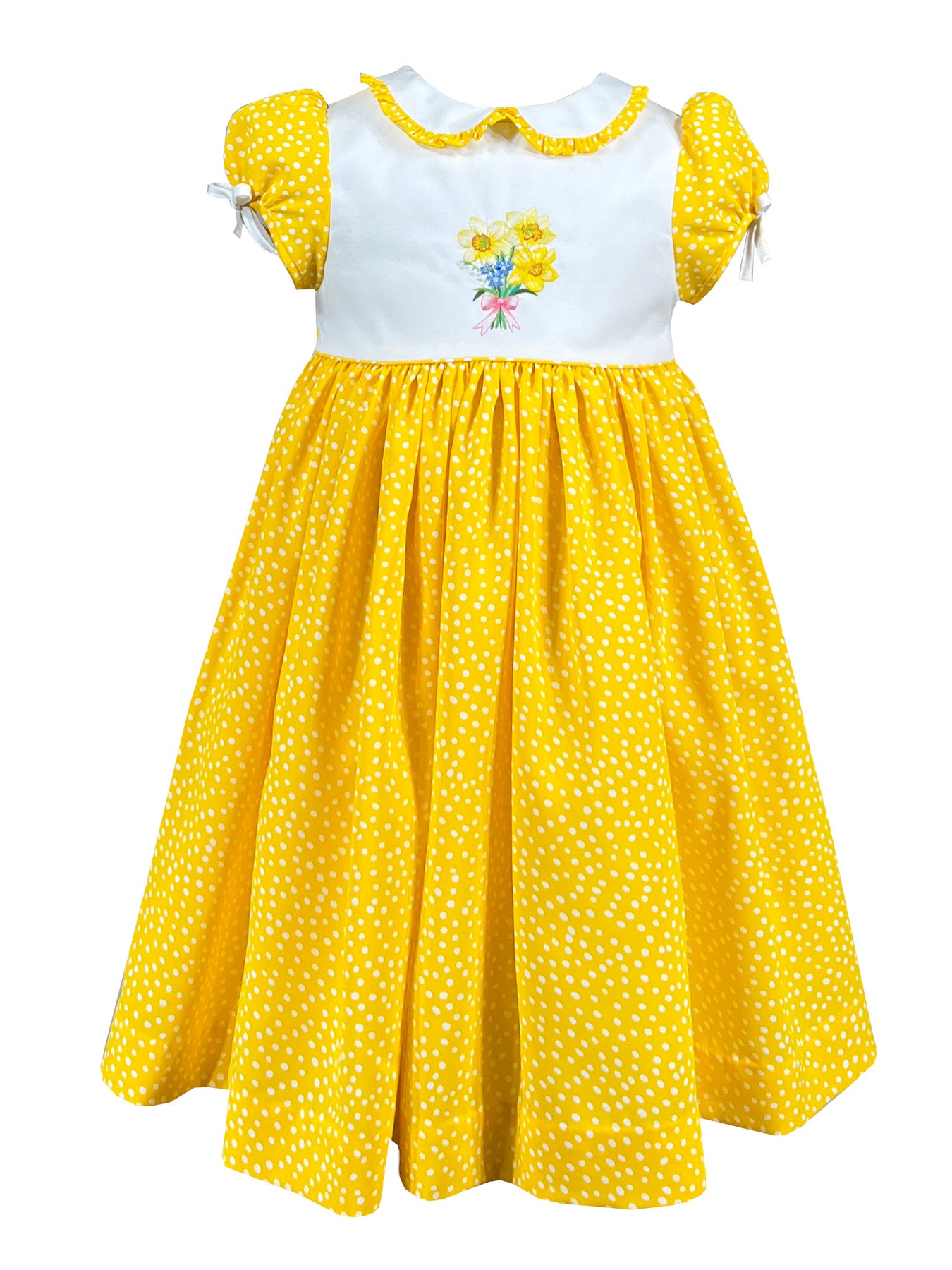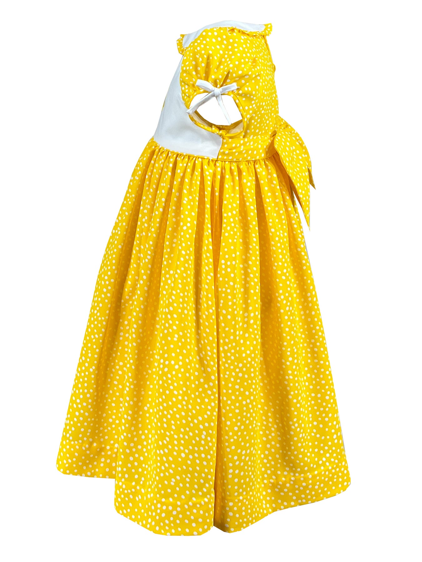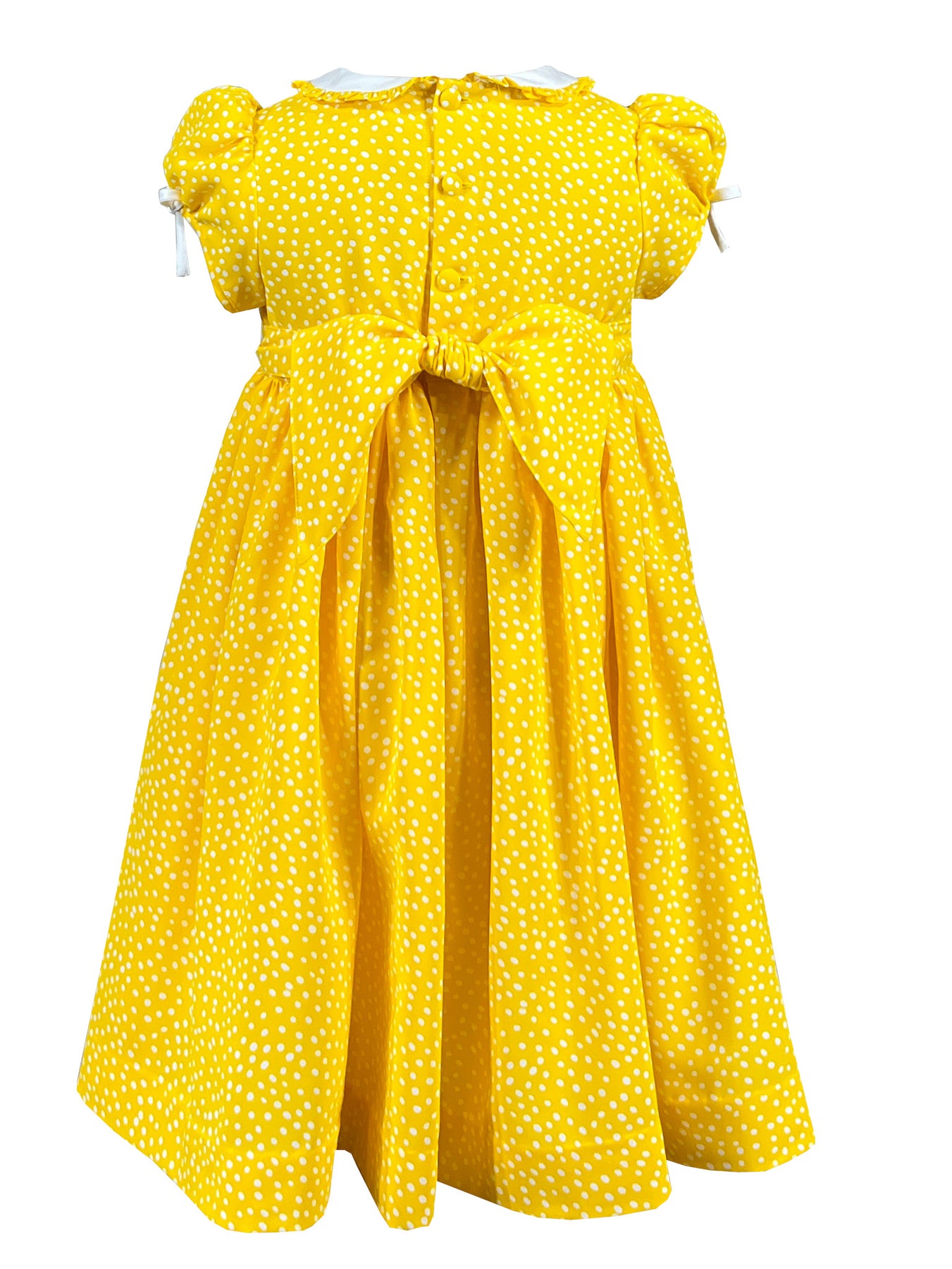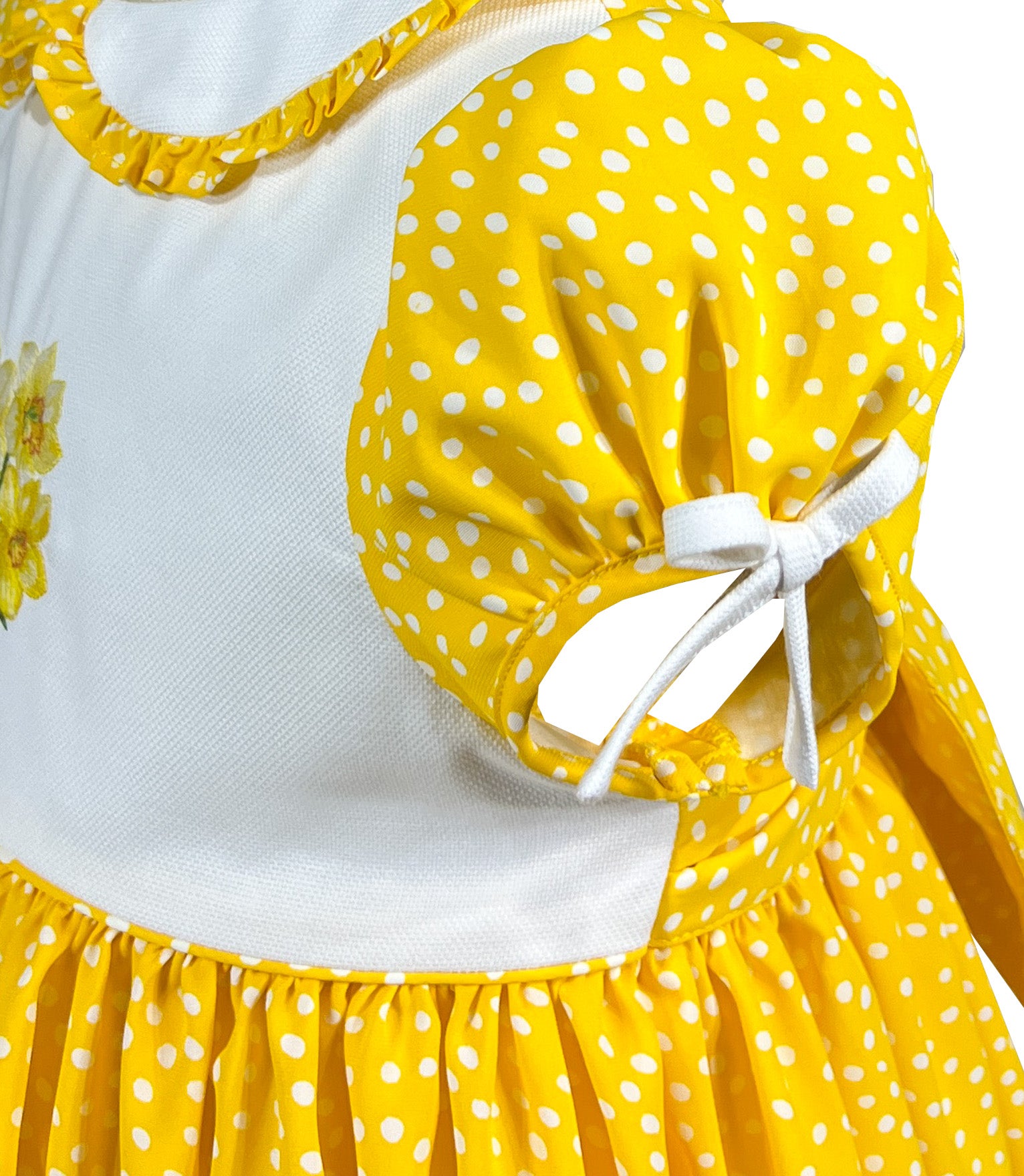 Radiating joy in cheerful yellow fabric adorned with white polka dots, it captures vintage charm with modern appeal. The crisp white Peter pan collar is trimmed with coordinating polka dot ruffles, while puffed sleeves feature delicate white bows for added sweetness.