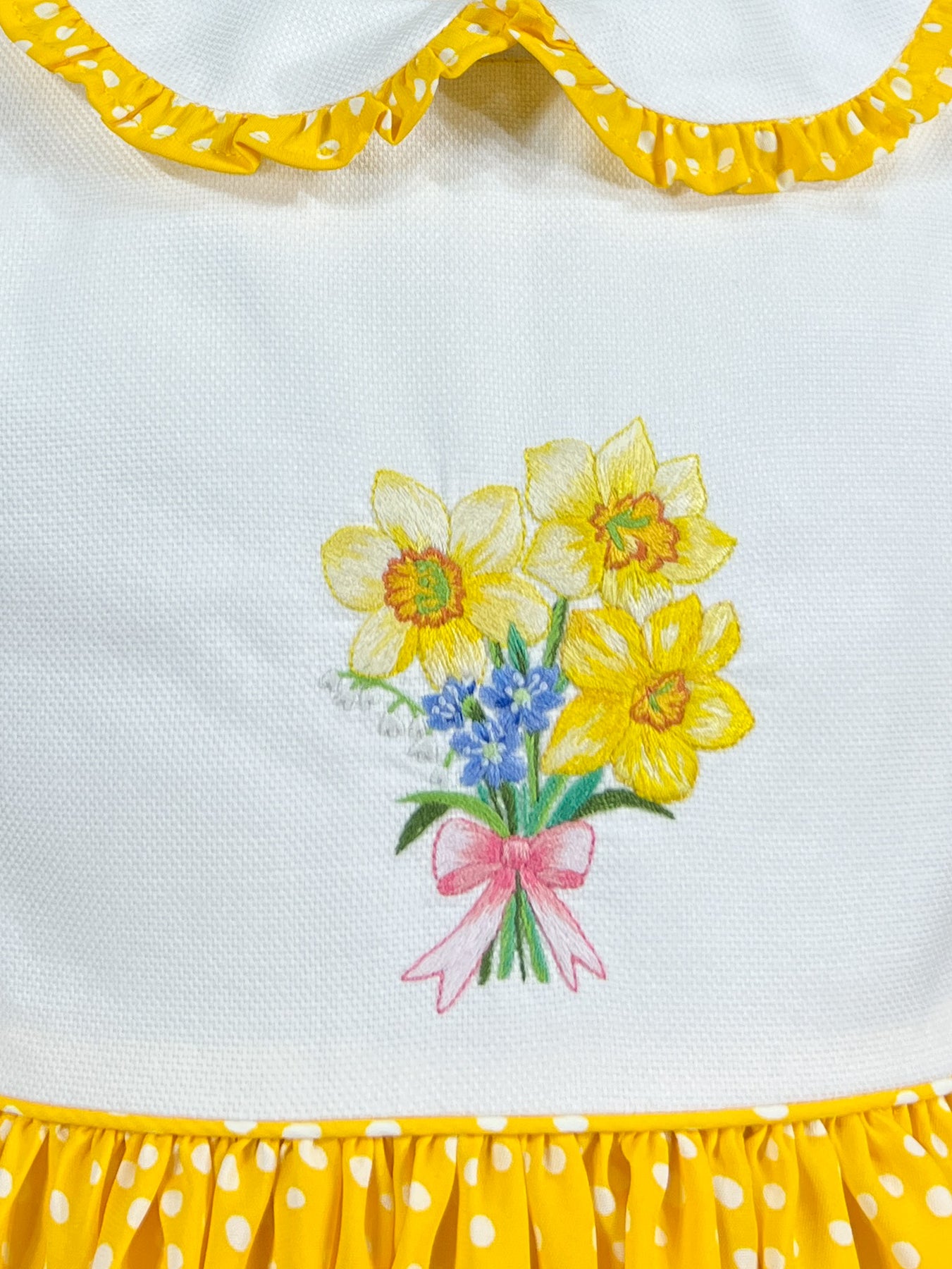 The centerpiece is an extraordinary hand-embroidered bouquet : a true work of art featuring three golden daffodils with dimensional petals in shades of yellow and cream, their centers stitched in vibrant orange and green. Nestled among them are delicate blue forget-me-nots and lilies of the Valley all bound together with a pink ribbon bow rendered entirely by hand. Each flower petal, each leaf, each ribbon fold represents hours of skilled needlework. A matching sash ties into a butterfly bow, and self-covered buttons complete the refined details.
