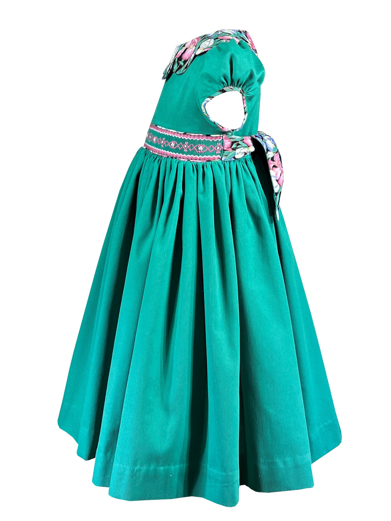 The bodice is adorned with meticulous handsmocking at the waistband, where perfectly matched thread tones echo the subtle hues within the floral print of the piping above and below.