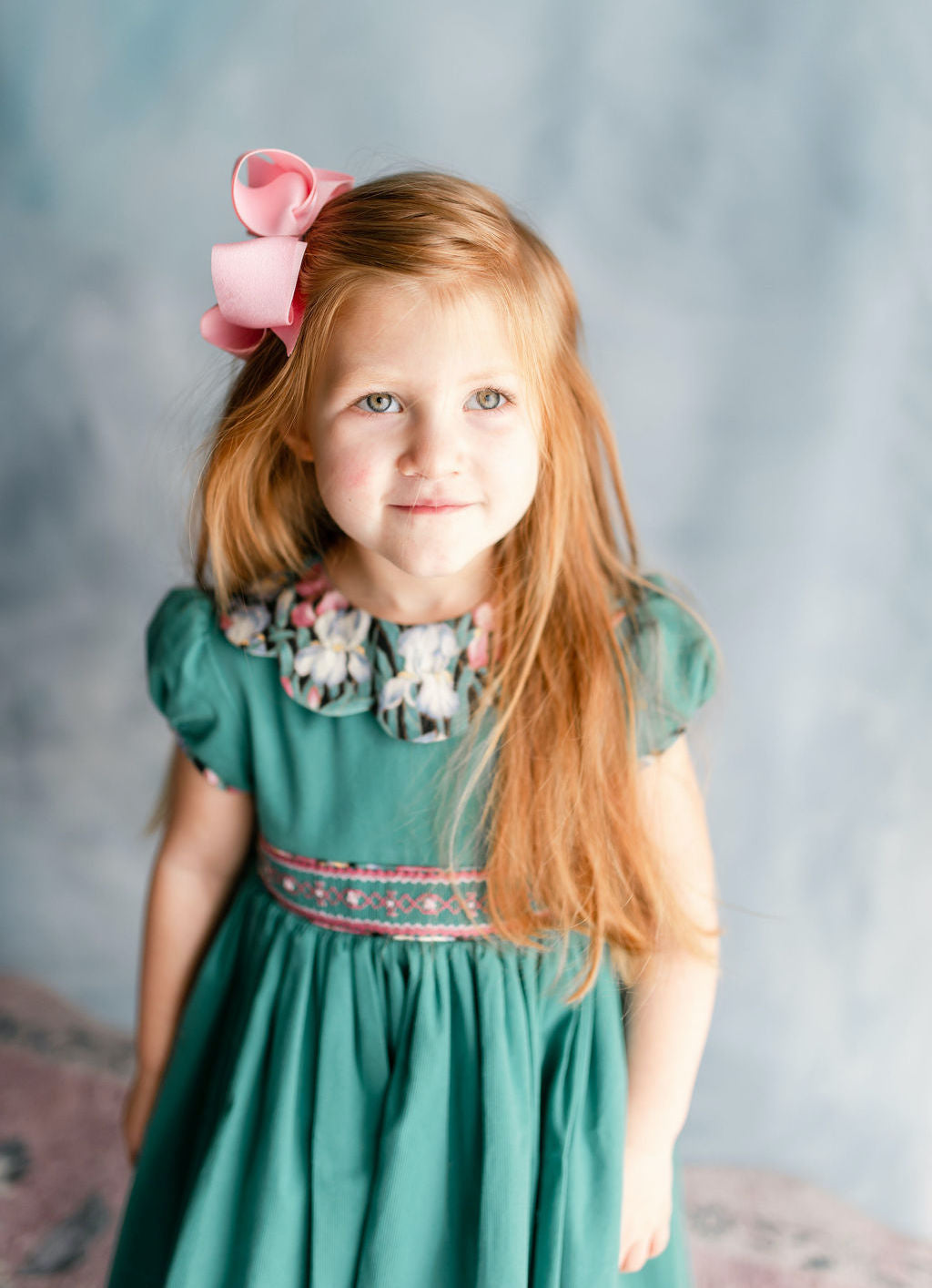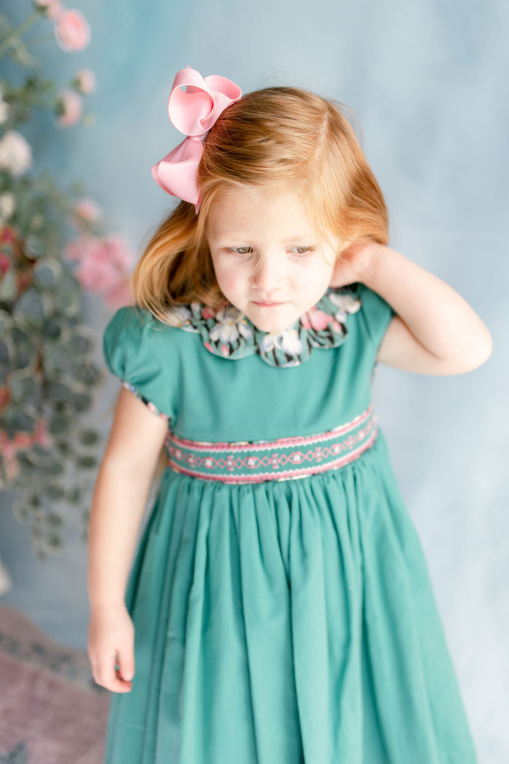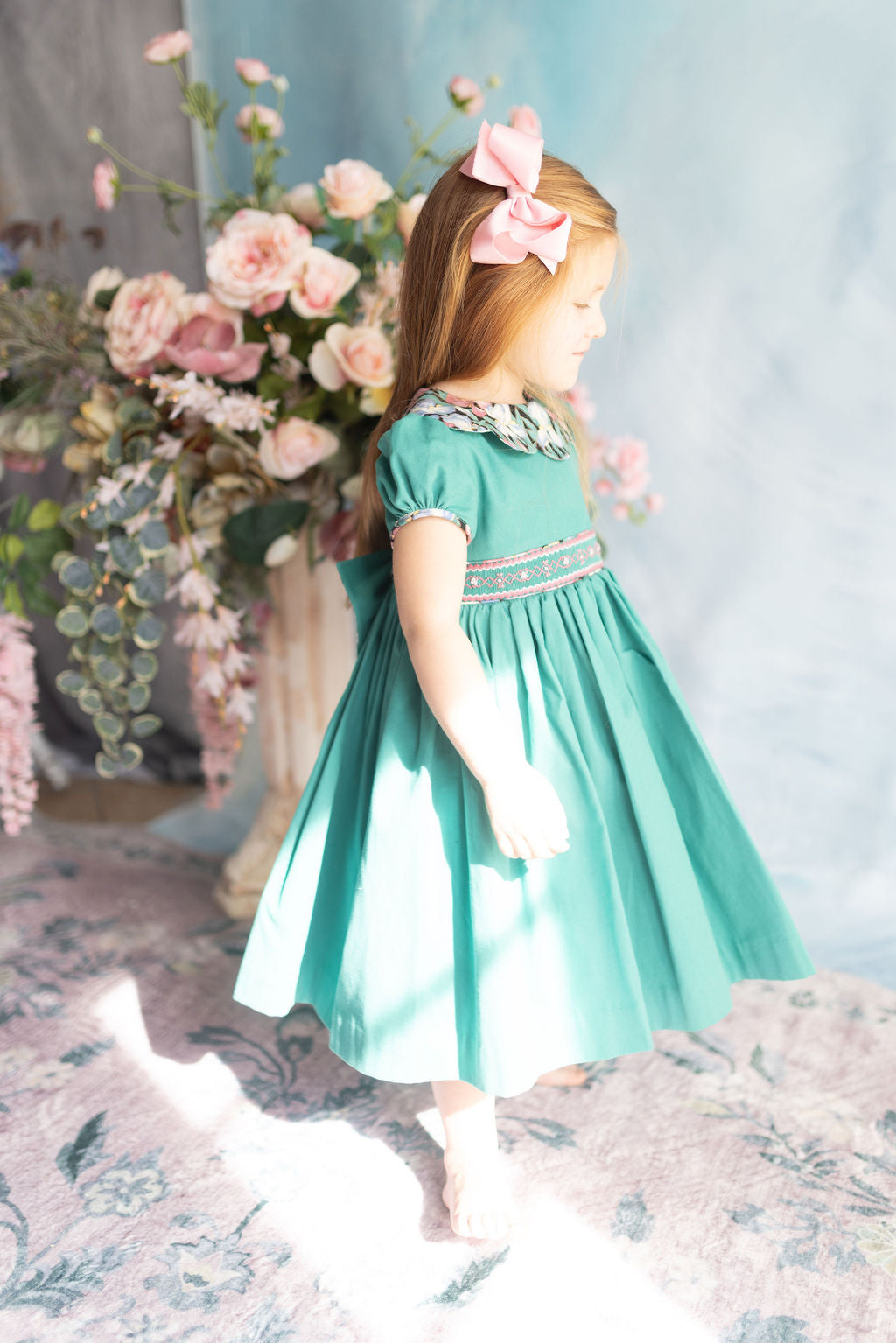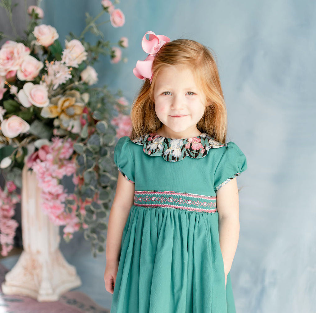 green teal heirloom smocked dress, petal collar, scallop details