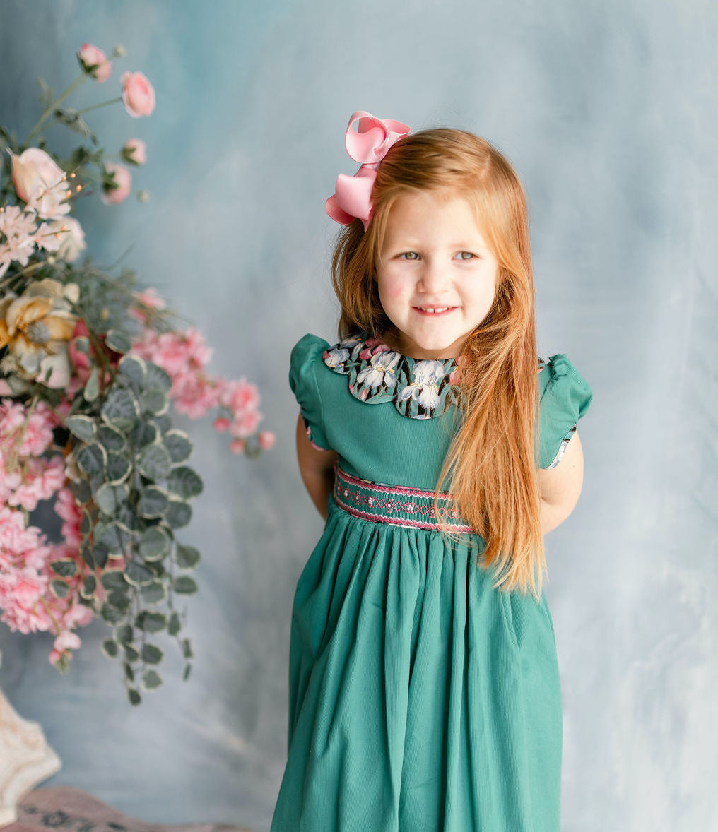 Persian green smocked bodice dress, petal collar girls dress, botanical print