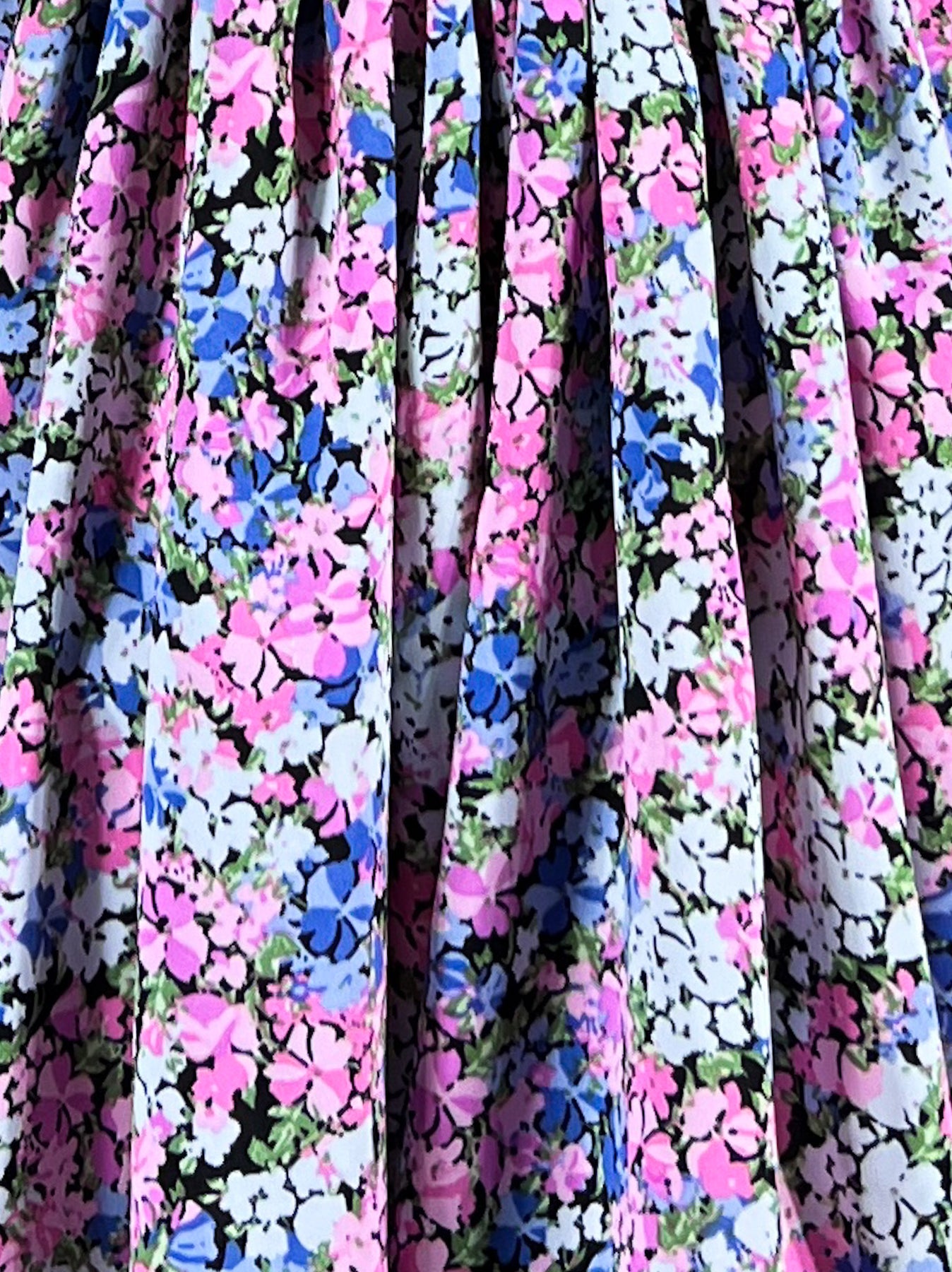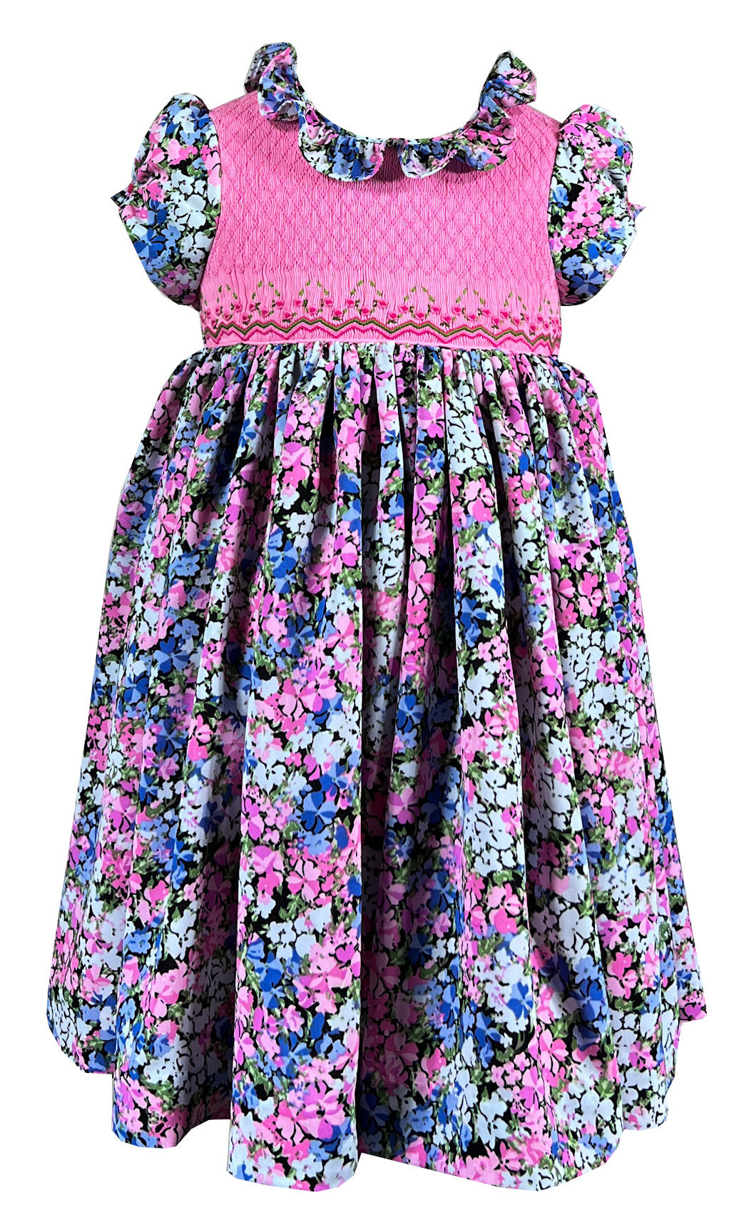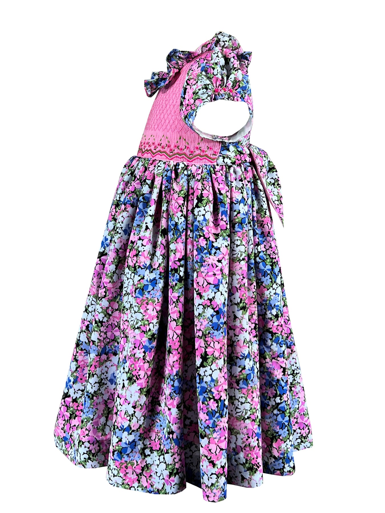 This dress celebrates nature's infinite variety. The fully smocked bodice in bright pink extends from neckline to shoulder, featuring an intricate diamond pattern adorned with delicate rick rack lines and miniature florals. The rest of the silhouette features a profusion of tiny multi-colored blooms scattered across black fabric creating a garden of endless discovery, where pink, blue, white, and green flowers dance together in cheerful harmony.