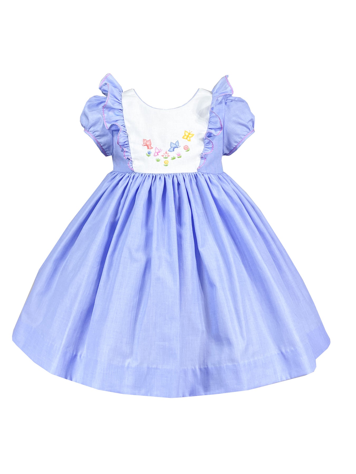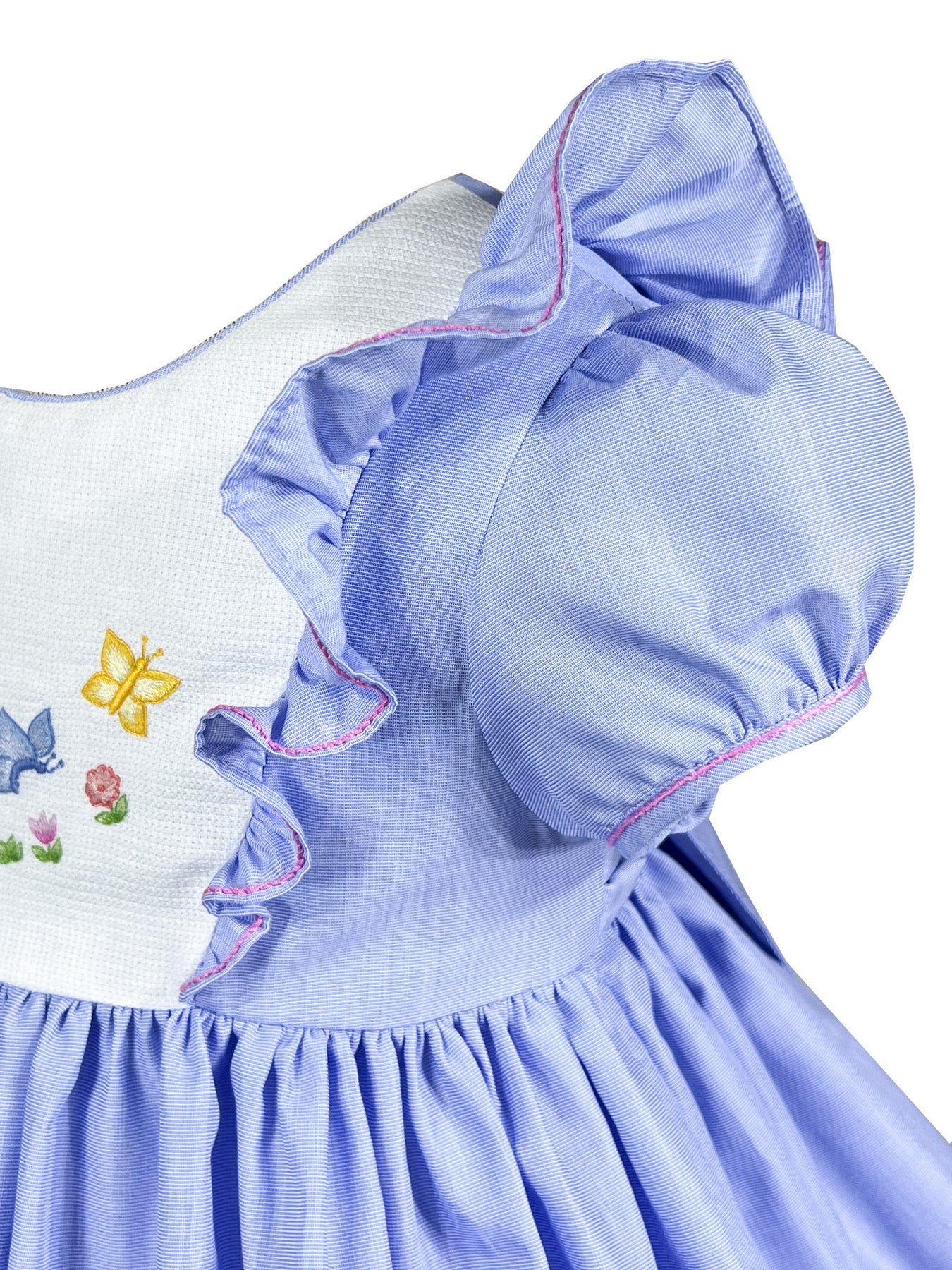 Cut from soft periwinkle blue cotton with a generous, full-gathered skirt, the Butterfly Wingbeat Netti Dress is built around a white cotton piqué bib bodice. It serves as a pristine canvas for its most extraordinary feature: a hand-embroidered butterfly garden of pure, joyful colour. Four butterflies have been stitched entirely by hand : coral, rose pink, periwinkle blue and bright golden yellow. Each one is caught mid-flight above a scattering of hand-embroidered wildflowers in pink, yellow and blue, their green stems anchoring the whole composition in a most enchanting scene.