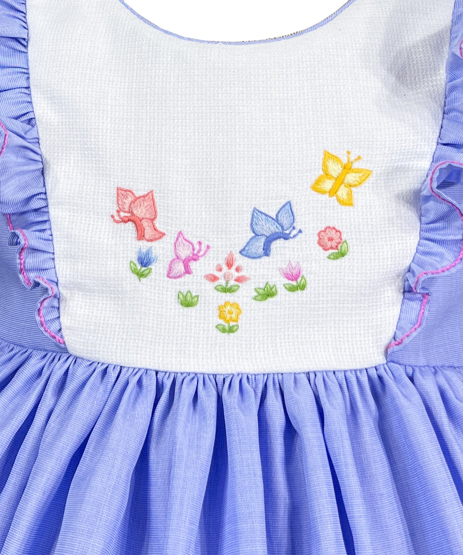 The puffed sleeves and ruffles finished with the finest pink thread frame the bib and bring delicate volume. Beneath the skirt, a tulle underlayer gives the cotton a beautiful, crinoline-like fullness that makes every step feel like a wing beat. The back closes with fabric-covered buttons, and a butterfly-shaped sash ties at the waist for a perfectly flattering fit.