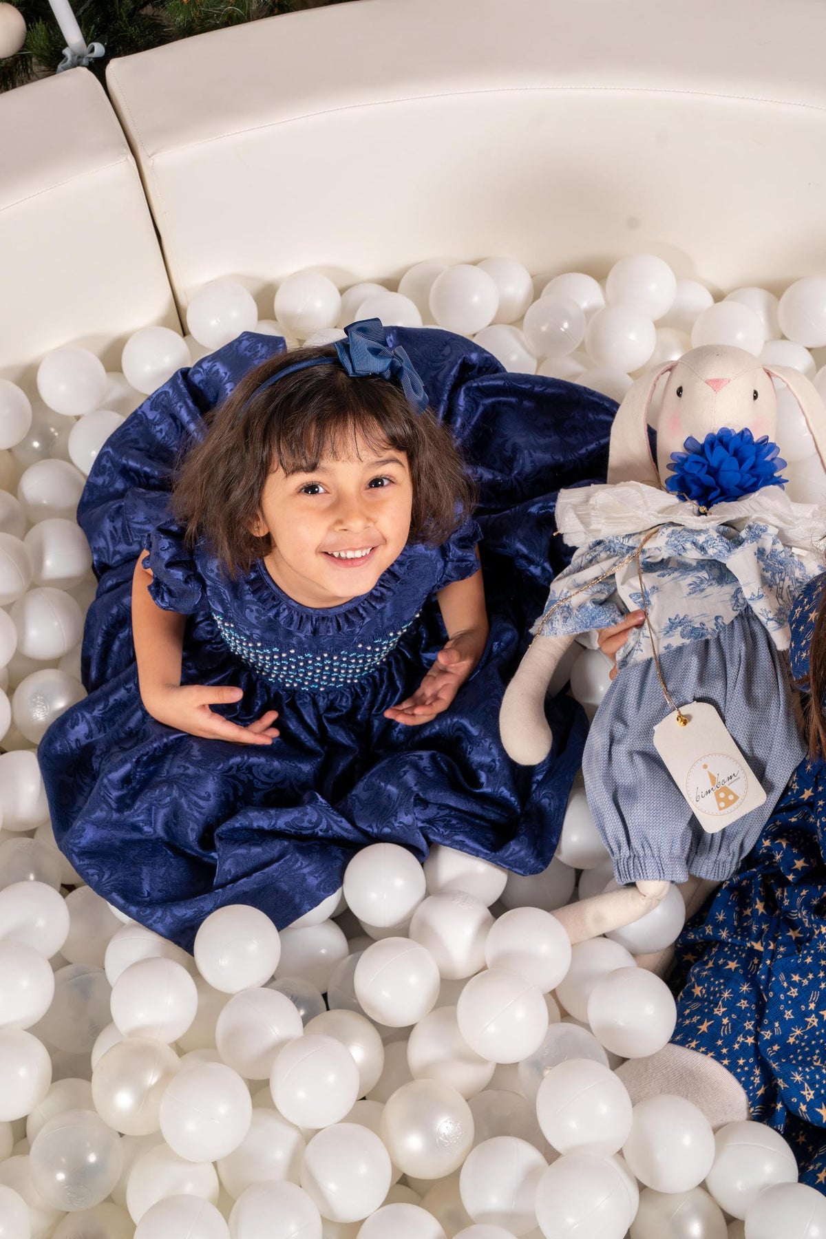 Open the doors of our enchanted wardrobe and step into a world where elegance reigns in the deepest navy, touched with pearls like stars against the midnight skies. In this sophisticated kingdom, grand damask ballrooms echo with music and princesses dressed in fine gowns and sparkling jewels twirl endlessly under crystal chandeliers.