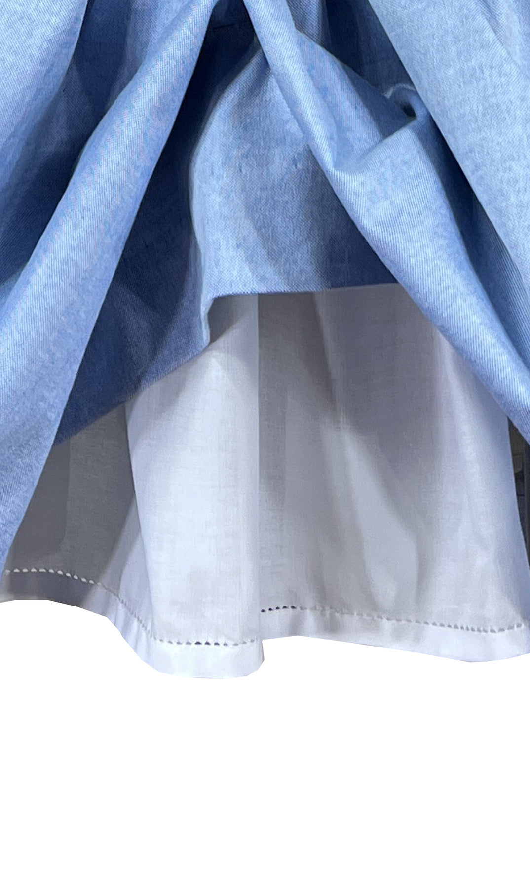 Laissant le tissu raconter sa propre histoire à travers profondeur et légèreté, cette robe est un jeu sur les différentes personnalités du bleu au sein d'un seul vêtement. Selon la lumière et le moment de la journée, les couleurs et les ombres se refléteront différemment sur le coton. Cette robe est imaginée pour l'enfant qui trouve l'émerveillement dans les moments quotidiens, qui s'arrête pour regarder les nuages dériver.