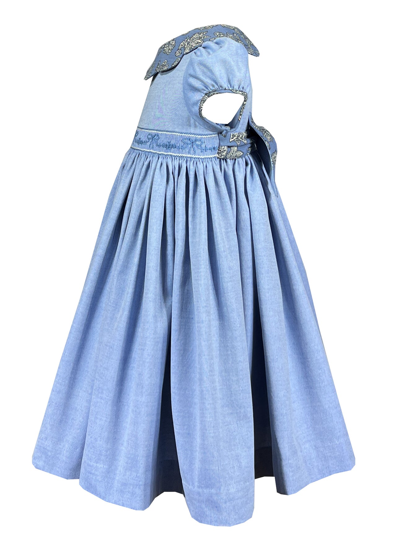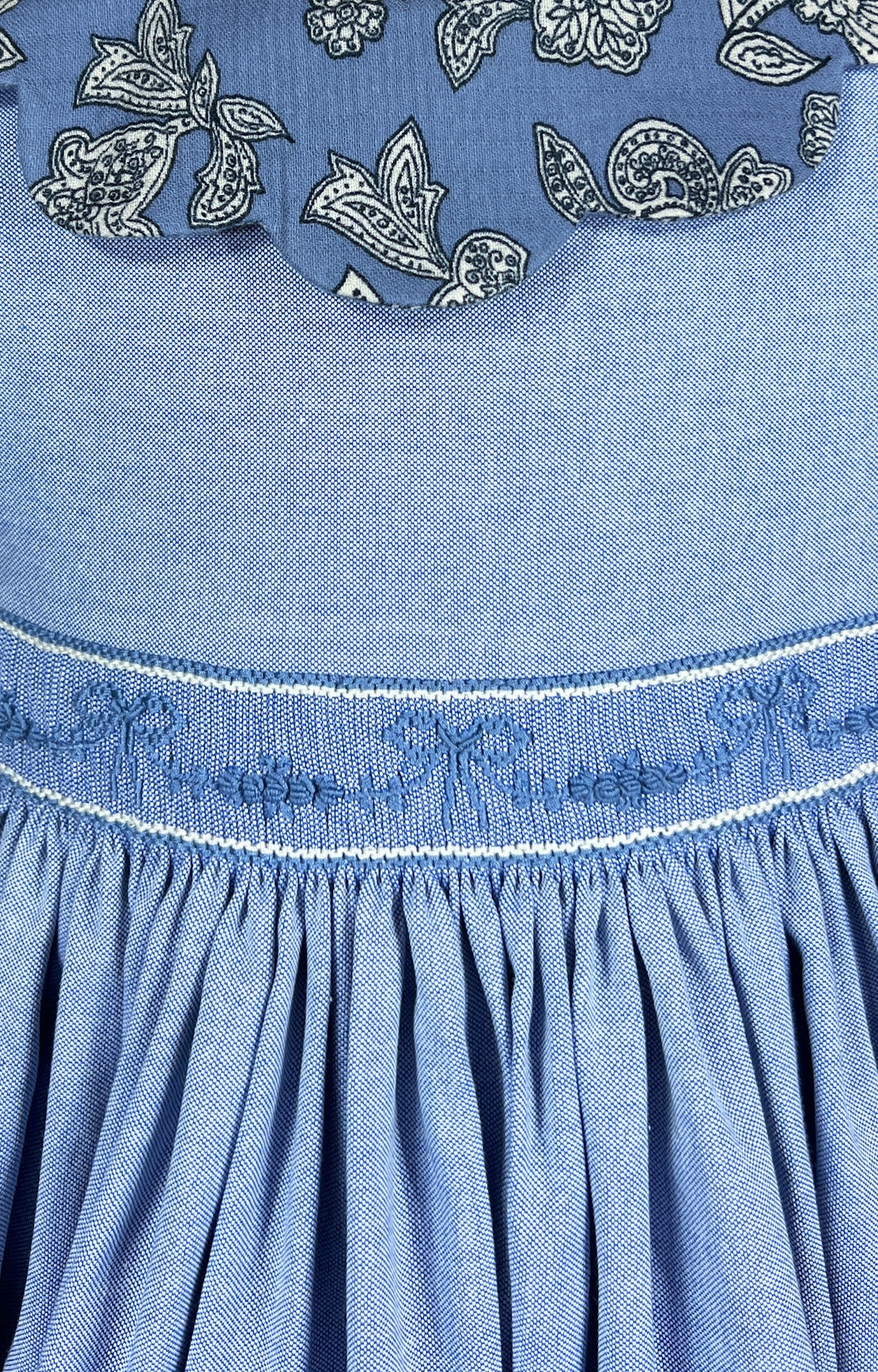 Le buste est confectionné en chambray clair tandis que le col pétale et la ceinture nœud papillon sont ornées d'un exquis imprimé perse paisley dans un bleu plus foncé.
