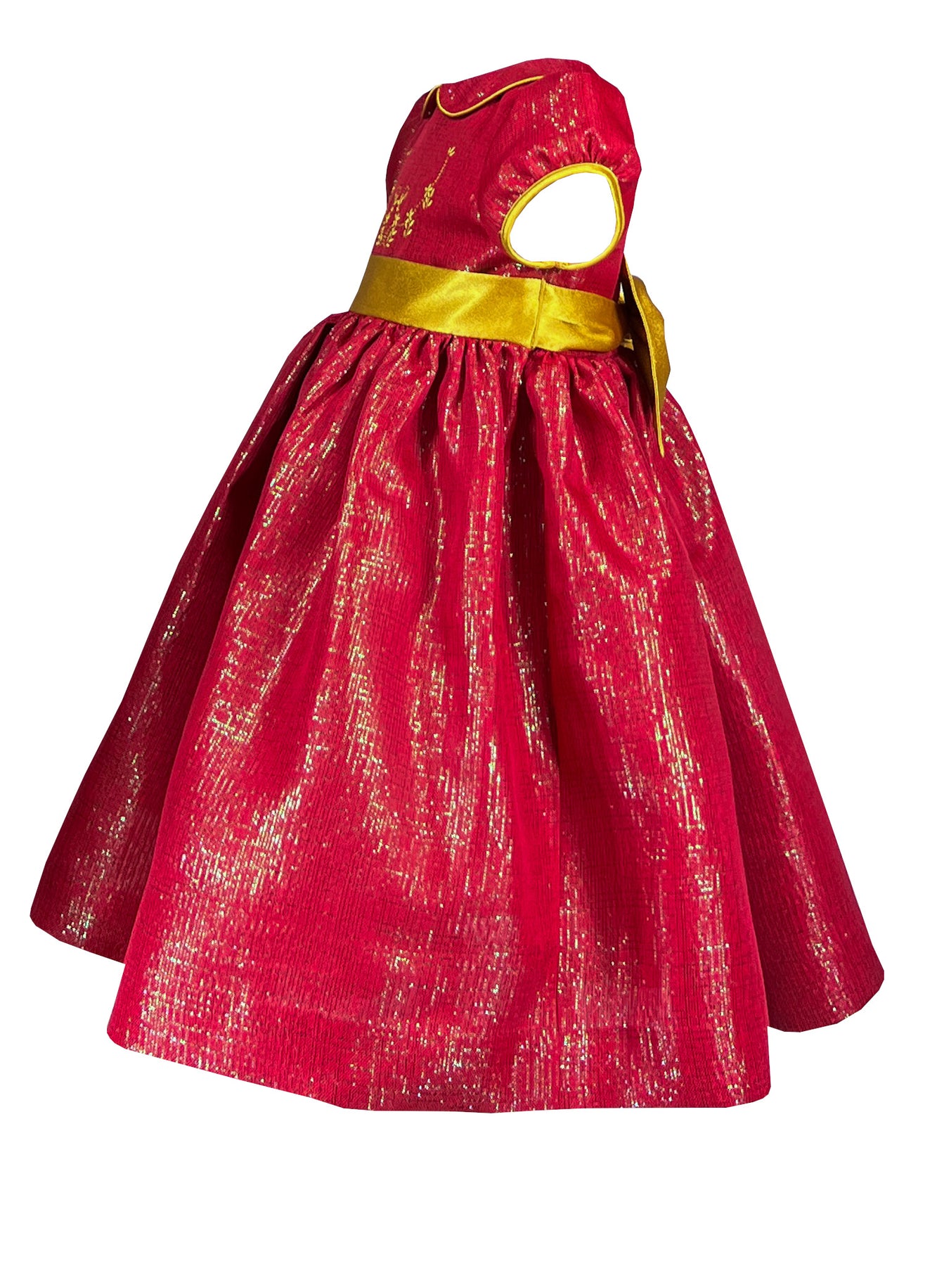 Inspirée par les magnifiques tomes reliés en cuir trouvés dans les bibliothèques de grands châteaux, cette robe royale capture l'élégance intemporelle des dos de livres dorés alignés sur des étagères en acajou. Le riche tissu rouge scintille de délicats fils dorés tissés en chaîne et trame espacé, créant une texture qui capte la lumière comme un précieux rayon de soleil sur des volumes anciens.