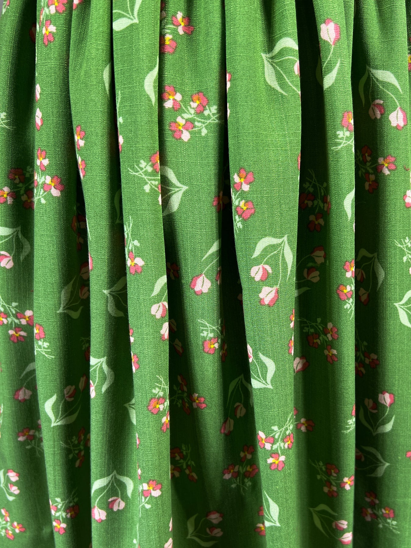 Un large col à volants et des manches ballons ajoutent une structure délicate. L'association du vert printemps frais et du rouge corail offre une élégance inattendue, tandis que le jeu entre la précision géométrique des smocks et le flux de l'imprimé crée un équilibre harmonieux. Une ceinture papillon à l'arrière et des boutons recouverts complètent ce design soigné. C'est une robe qui nous invite à ralentir et à remarquer la beauté dans chaque détail.