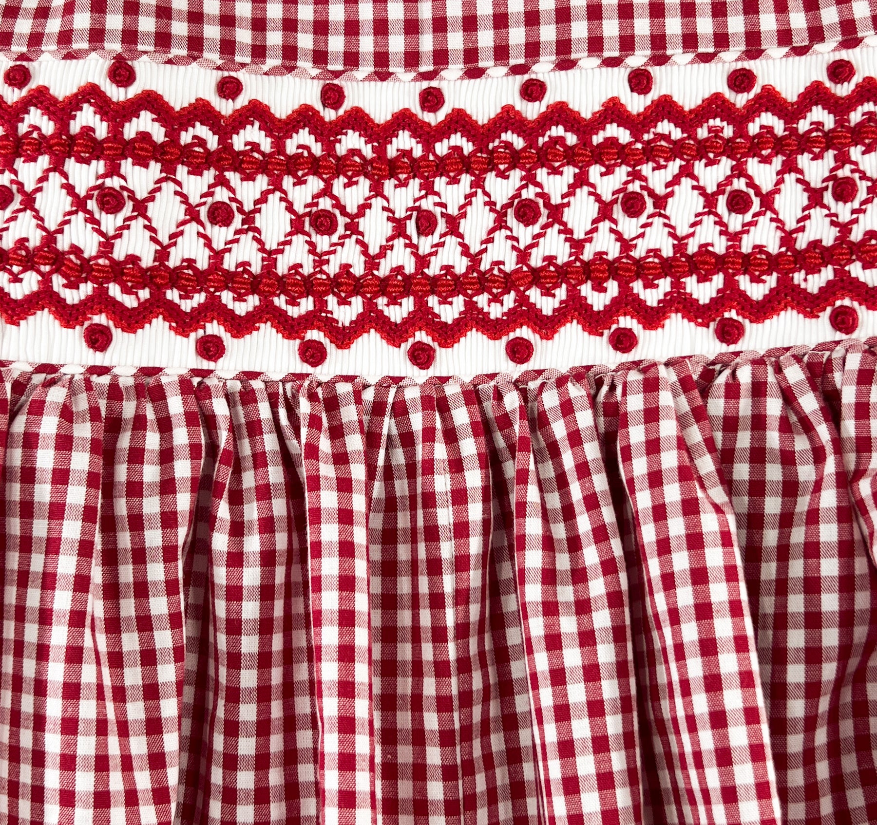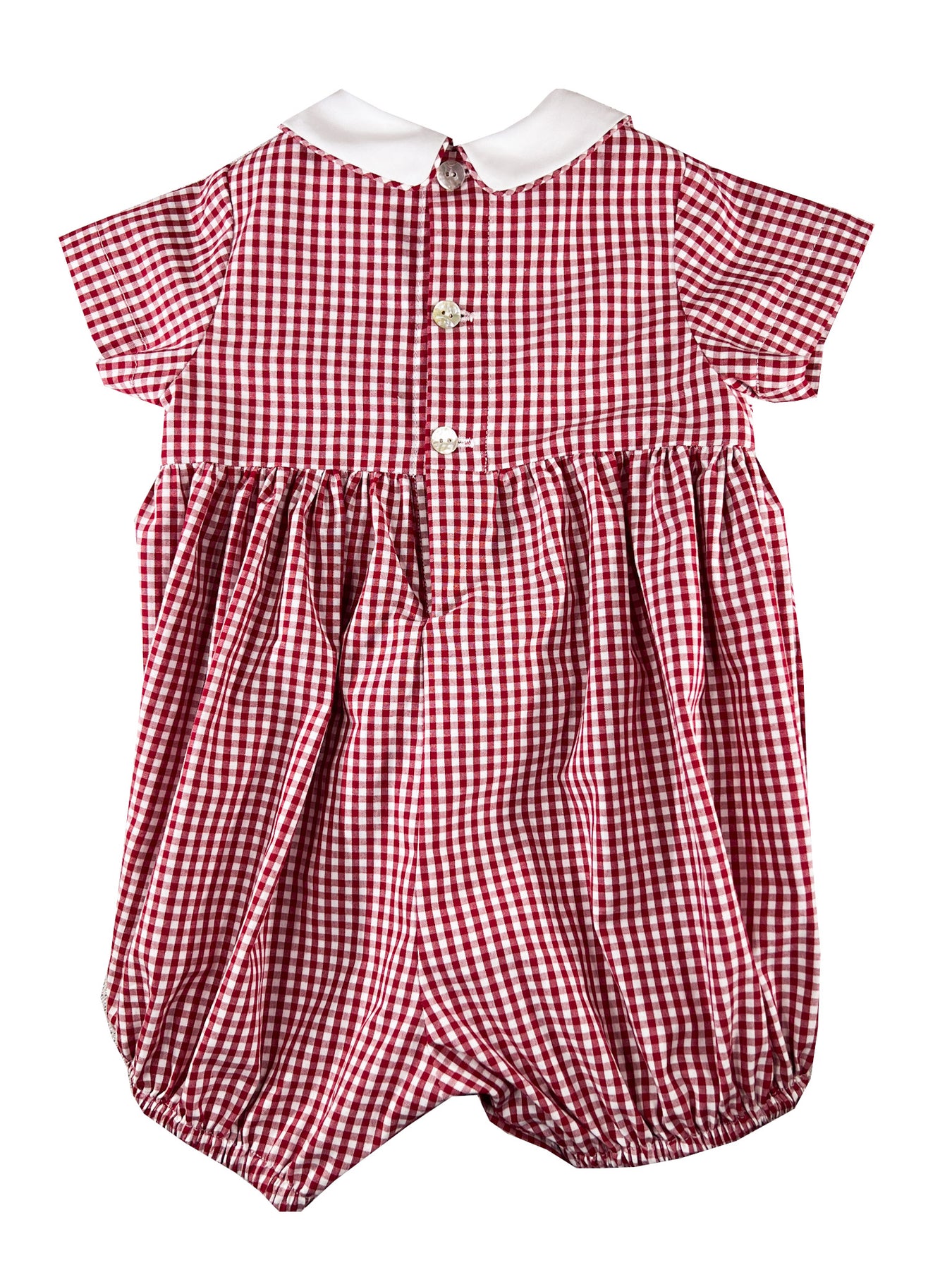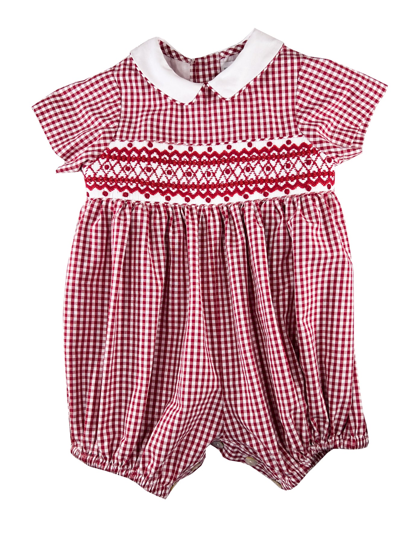 A celebration of joy in cheerful red and white gingham, the Berries baby boy romper brings joy all year long. The classic checked pattern creates timeless charm, while the bodice features beautiful hand smocking in coordinating tones. The expert smocking provides both decorative beauty and practical comfort, creating a flexible fit that adapts to your child's movements.