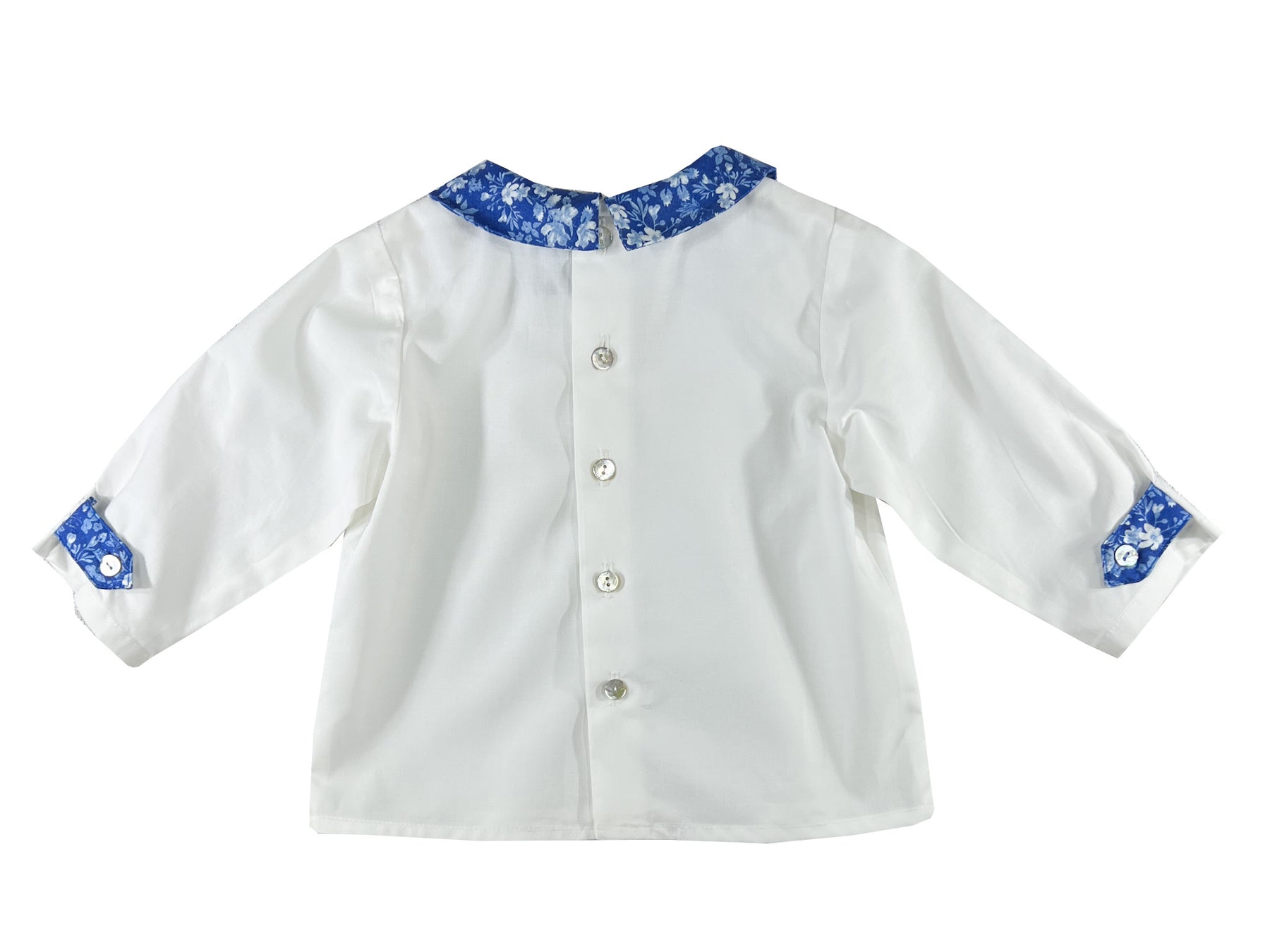 The classic shirt silhouette is timeless and versatile, while the botanical print adds a refined finishing detail. The shirt fastens at the back with flat mother of pearl buttons for easy dressing. The combination of white body with blue garden print creates a fresh, elegant look ideal for baby's early wardrobe.