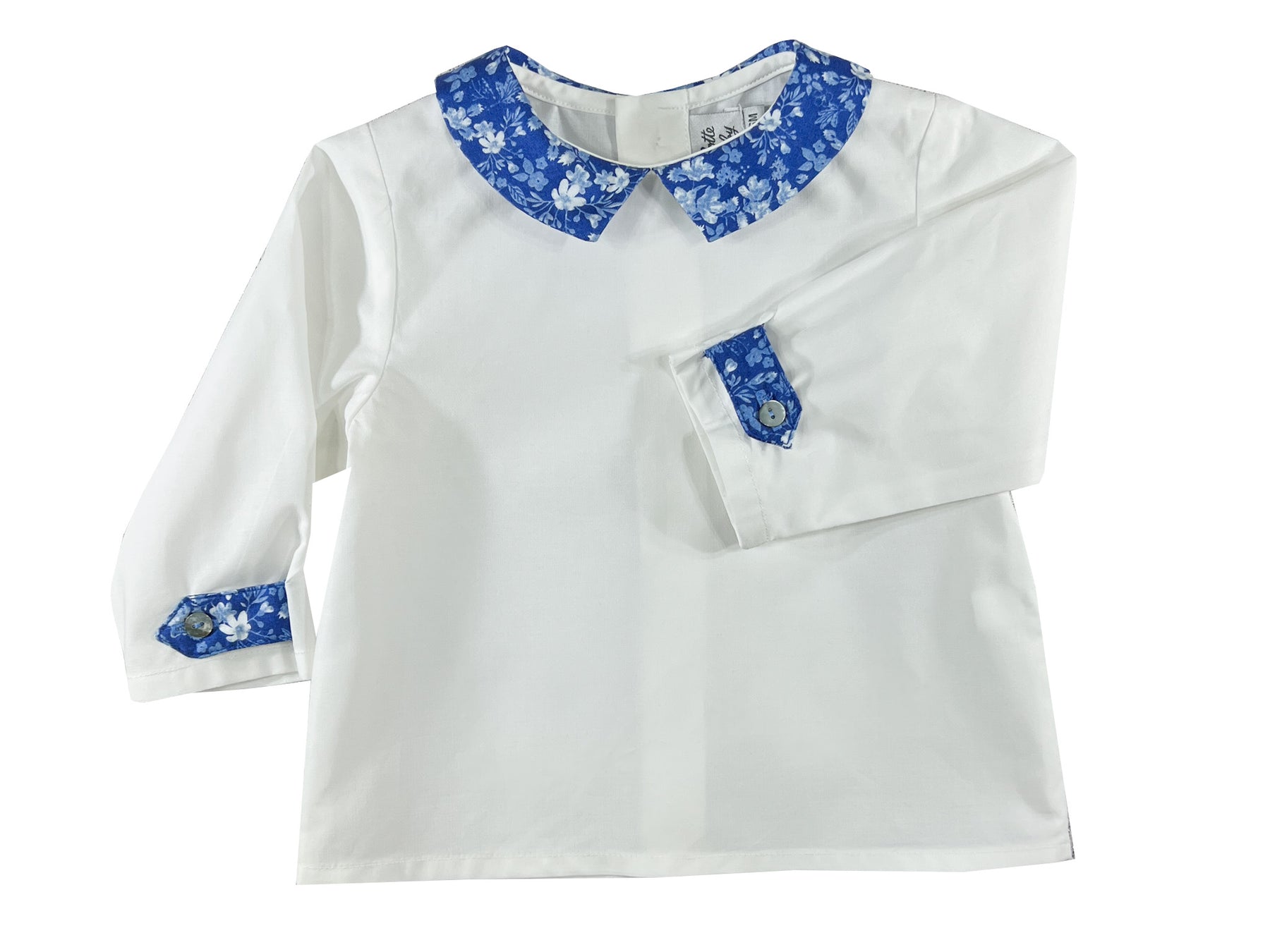 Timeless white shirt with botanical collar, blue foliage baby girls top, garden children's wear