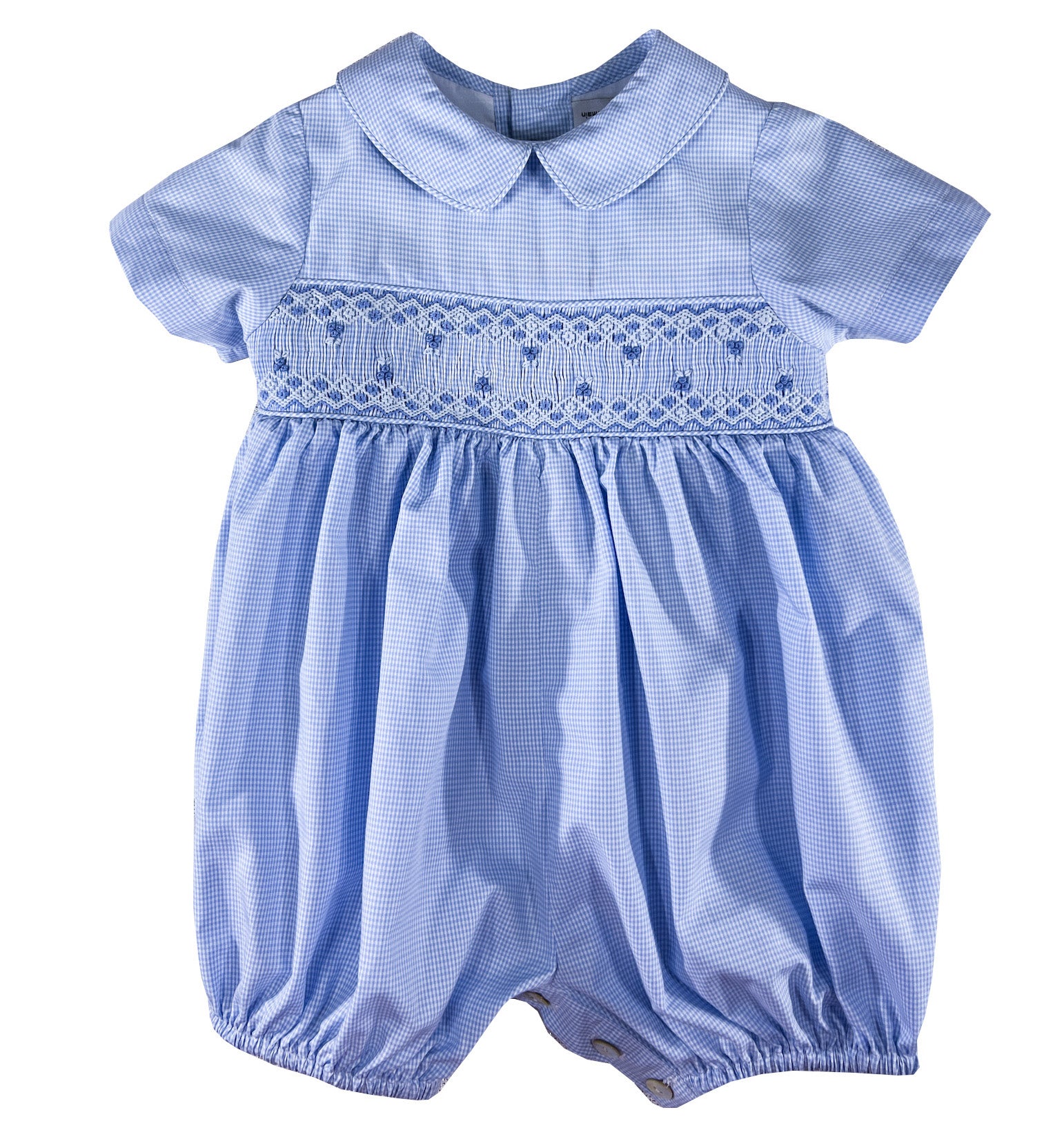This blue bubble romper coordinates beautifully with its dress counterpart, featuring the same gentle mini checked blue and white satin cotton which recalls the freshness of early hours. The smocked chest band showcases intricate geometric patterns in blue tones, while the collar and short sleeves maintain the classic silhouette in miniature.
