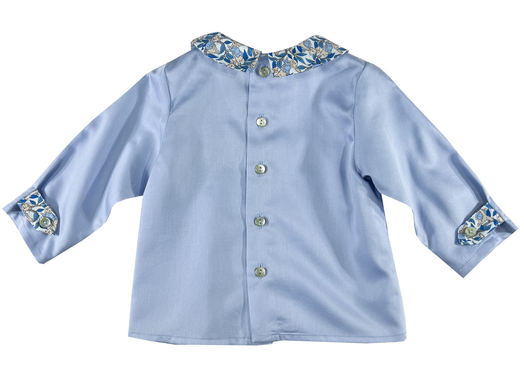 This baby blue shirt brings classic tailoring to the whimsical world of Beatrix Potter. The delightful Liberty print details on white background feature gentle rabbits in soft beige with pale blue jackets wandering among delicate blue foliage, capturing the charm of those beloved garden adventures.