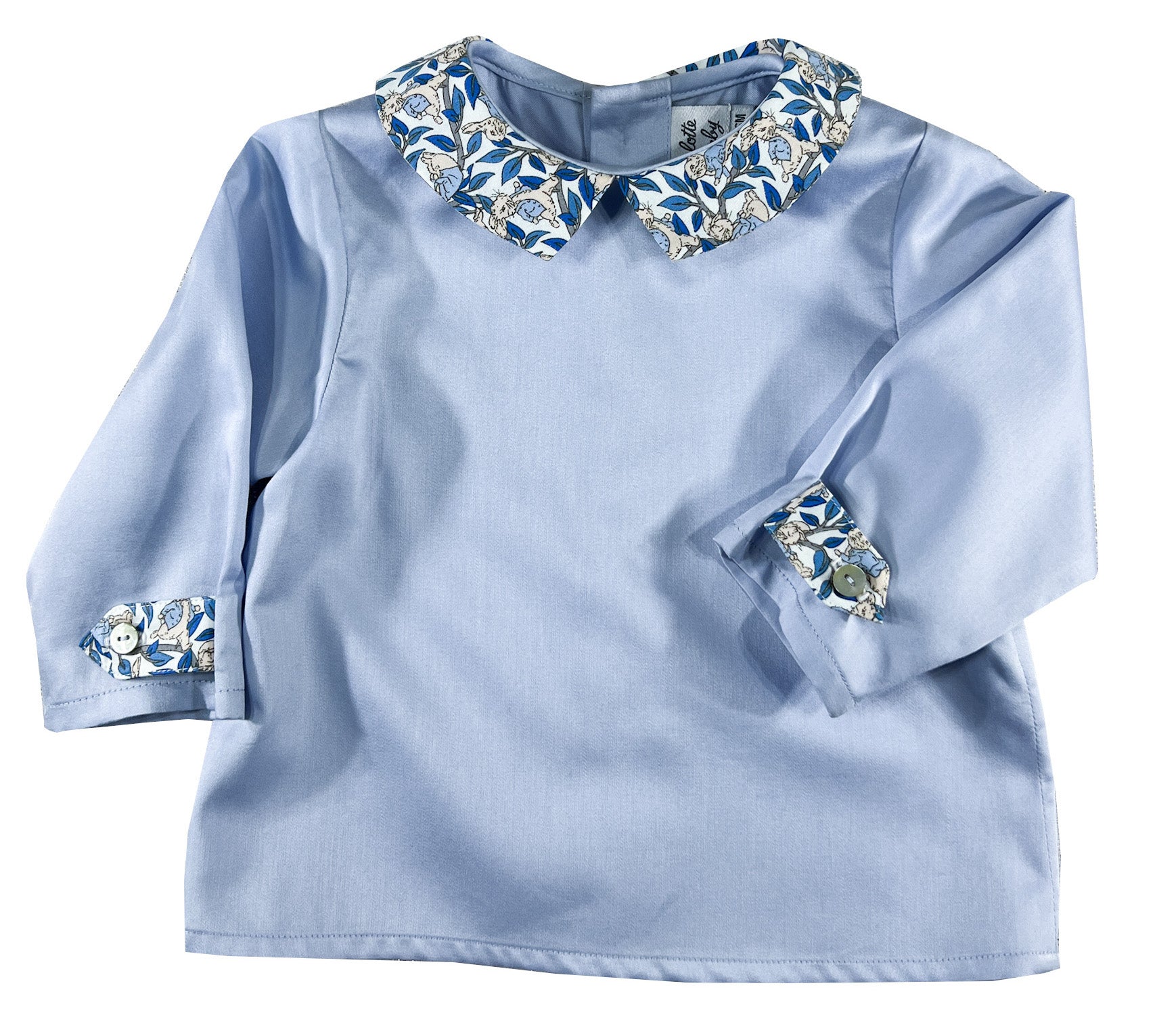 This classic top features a crisp pointed collar and long sleeves with tabs which had a refined detail. The traditional silhouette is refined and versatile, fastening at the back with flat mother of pearl buttons. The sweet print paired with gentle blue creates a piece which feels both fresh and timeless.