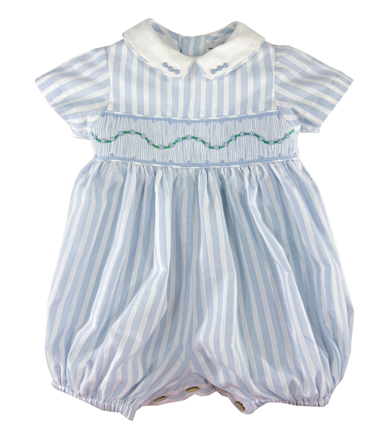 This blue striped bubble romper echoes the maritime elegance of the coordinated Riviera dress in a playful silhouette perfect for babies. Fine blue and white stripes create a crisp foundation for the smocked chest band, which features a charming wave pattern with blue and green accents that bring a touch of coastal garden romance.