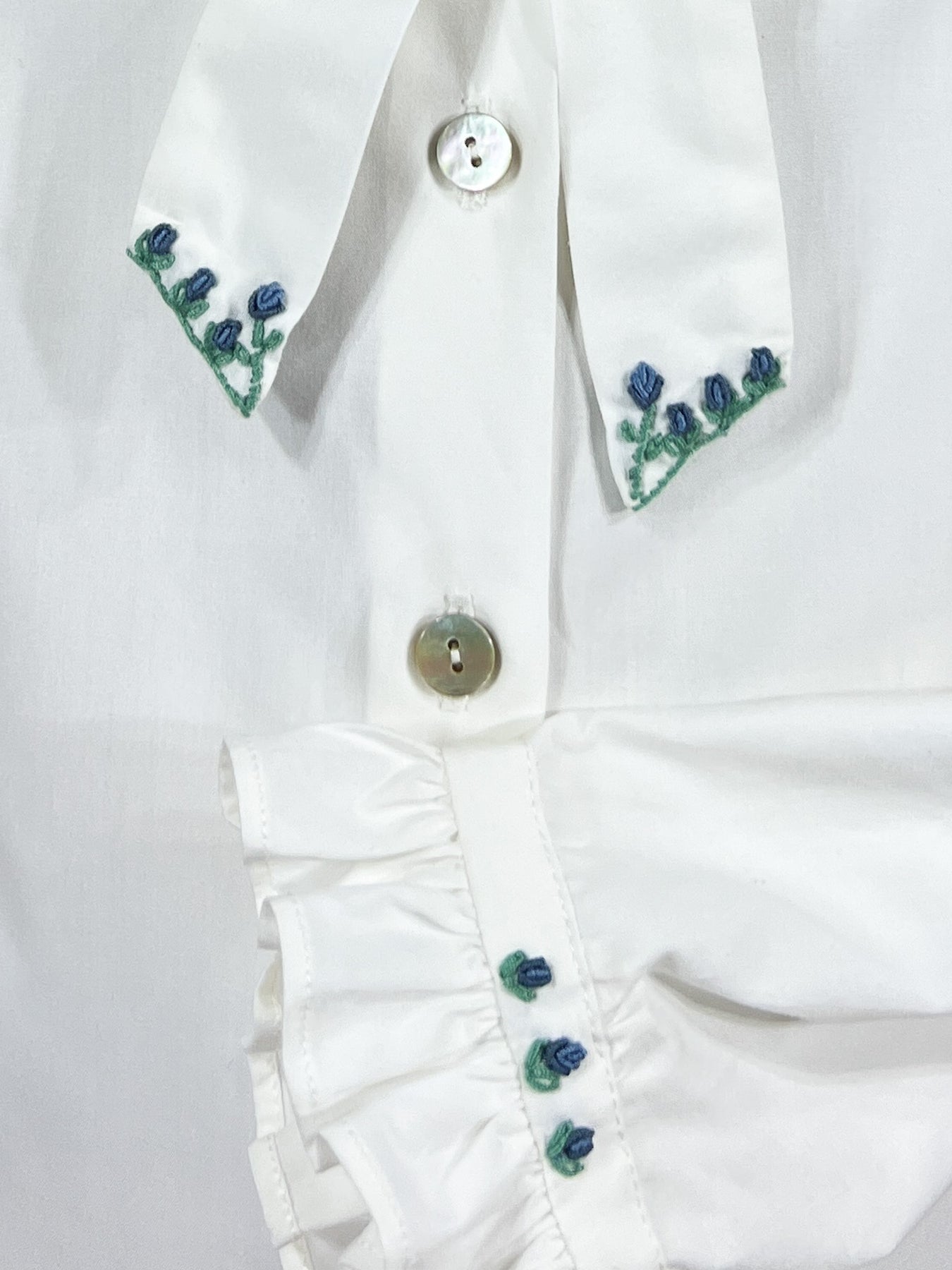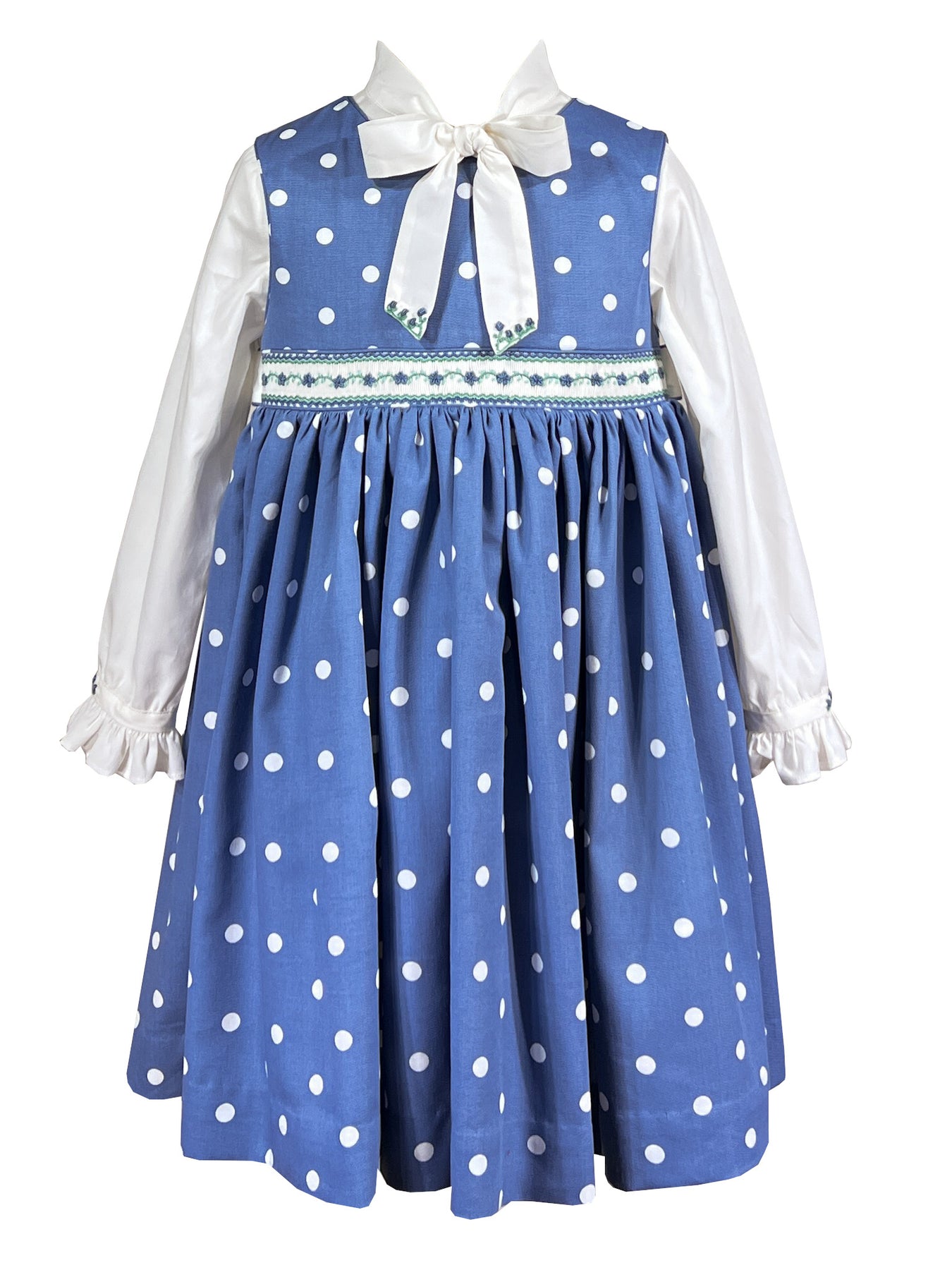 The pinafore is designed to be worn over a crisp white cotton blouse with a distinctive Lavallière bow collar, a detail that traces back to the elegance of Versailles. The collar is finished with embroidery in blue and mint that echoes the smocking, while long sleeves with ruffled cuffs feature matching embroidered details. Together, the pieces create a refined ensemble that balances formality with playful charm.