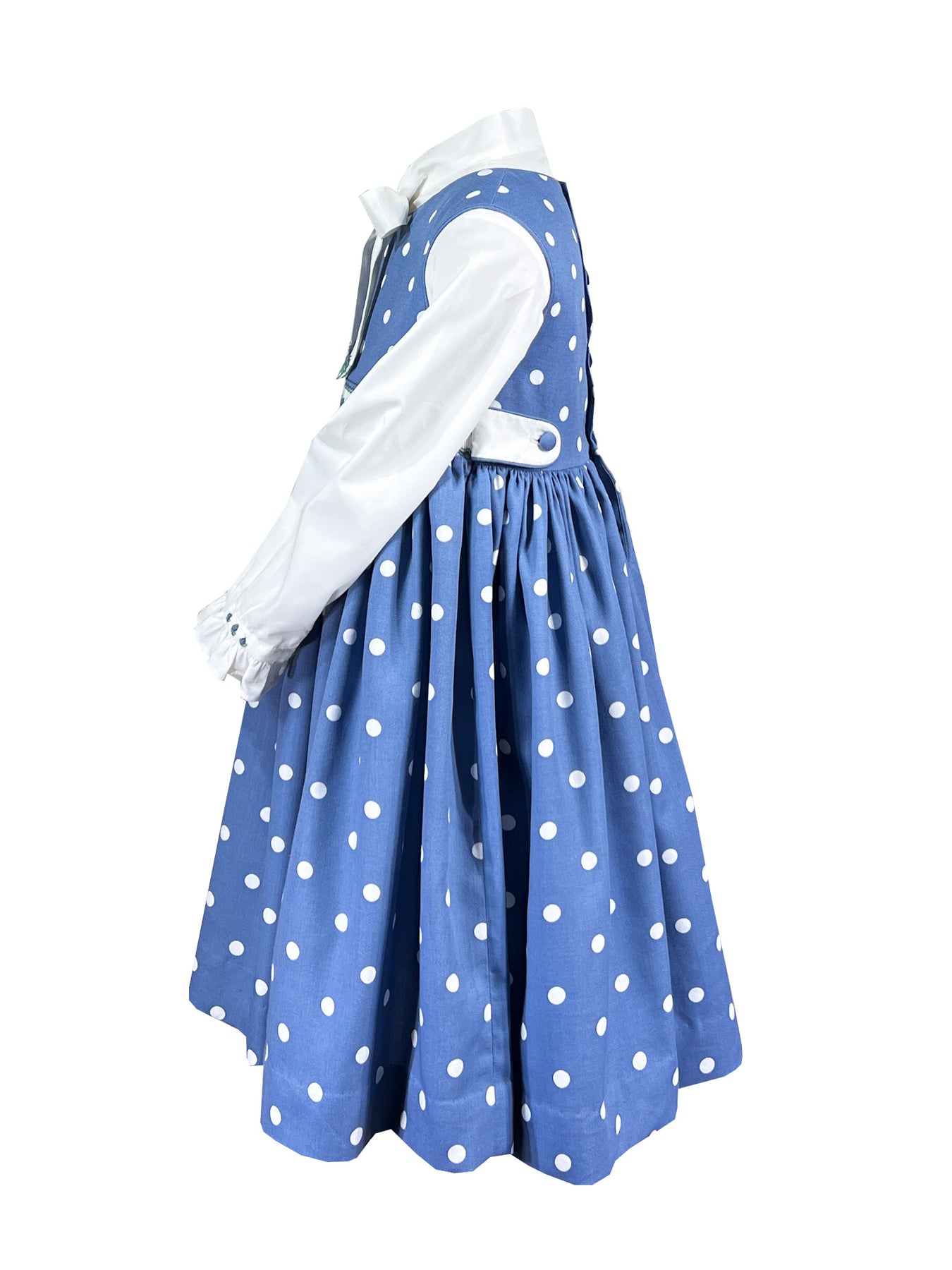 The Dot to Dot pinafore brings together heritage and whimsy in cornflower blue cotton scattered with white polka dots. The soft, supple fabric drapes beautifully, while the white smocked waistband features a delicate frieze of blue daisies with mint green foliage. Side belts and self covered buttons meticulously crafted from the white dots themselves blend in perfectly with the design.