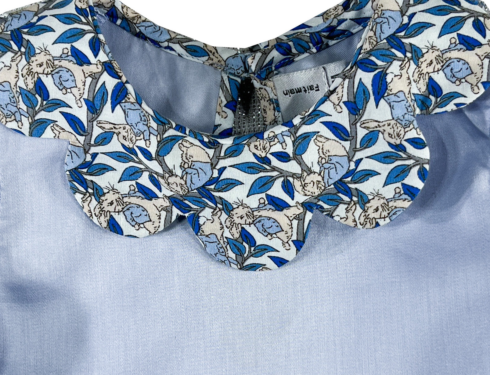 The Peter Rabbit style scallop baby girl blouse offers a charming interpretation of storybook dressing. The body is crafted in soft periwinkle blue, while the distinctive scallop petal collar and long sleeves piping showcase the enchanting Liberty print on white background, featuring gentle rabbits in soft beige with pale blue jackets nestled among delicate blue foliage.