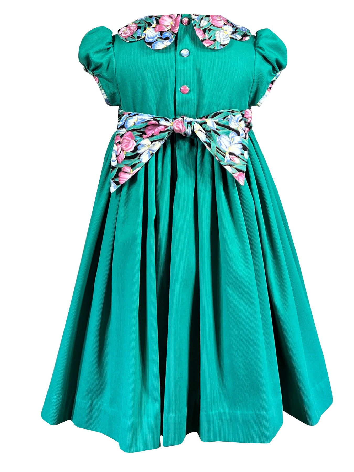 The bodice is adorned with meticulous handsmocking at the waistband, where perfectly matched thread tones echo the subtle hues within the floral print of the piping above and below.