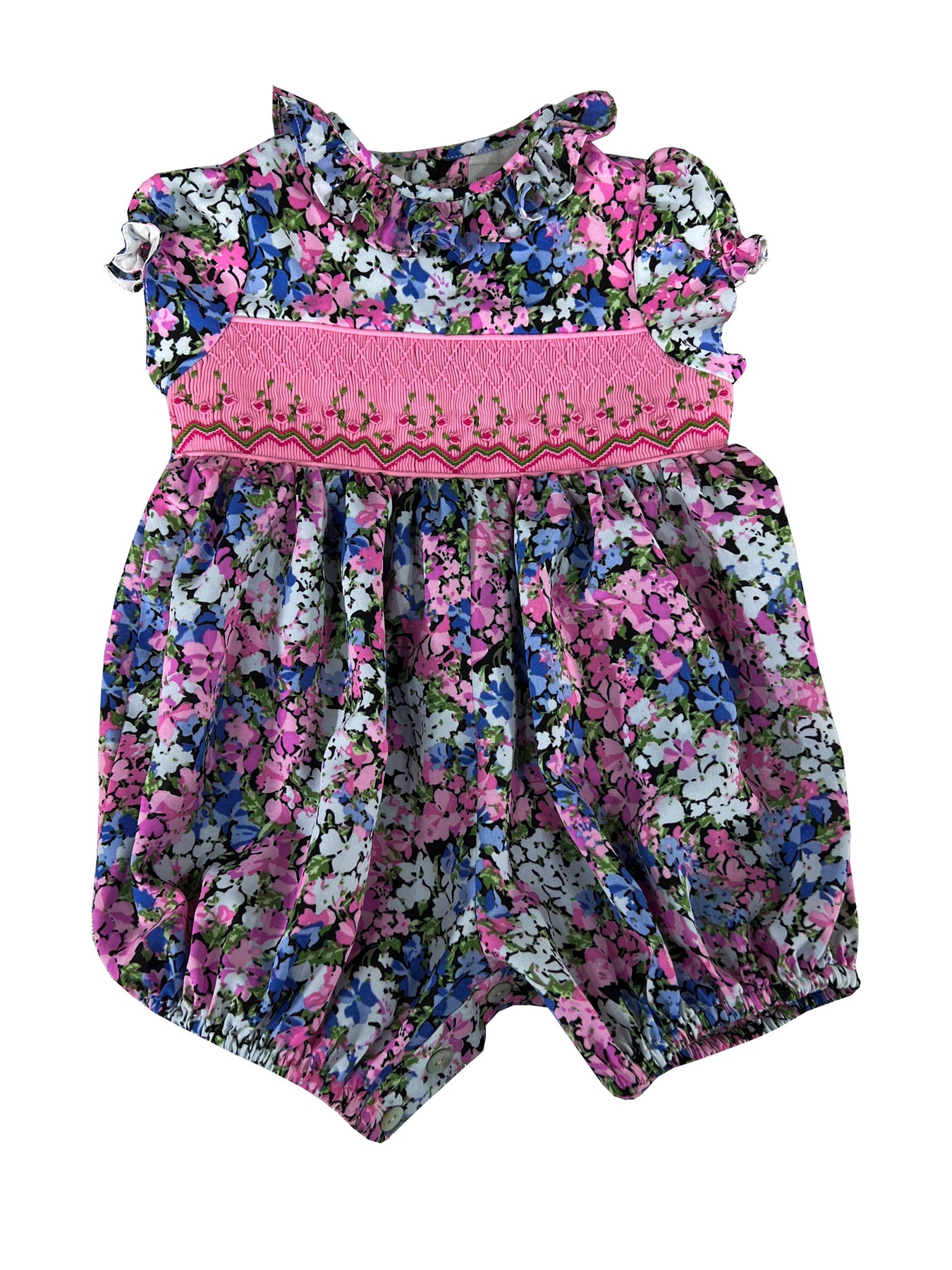 The Thousand Blooms bubble captures the same spirit of joyful abundance as the matching dress. The smocked band in bright pink features an intricate diamond pattern adorned with delicate rick rack lines and miniature rosebuds. The rest of the silhouette features a profusion of tiny multi-colored blooms scattered across black fabric creating a garden of endless discovery, where pink, blue, white, and green flowers dance together in cheerful harmony.