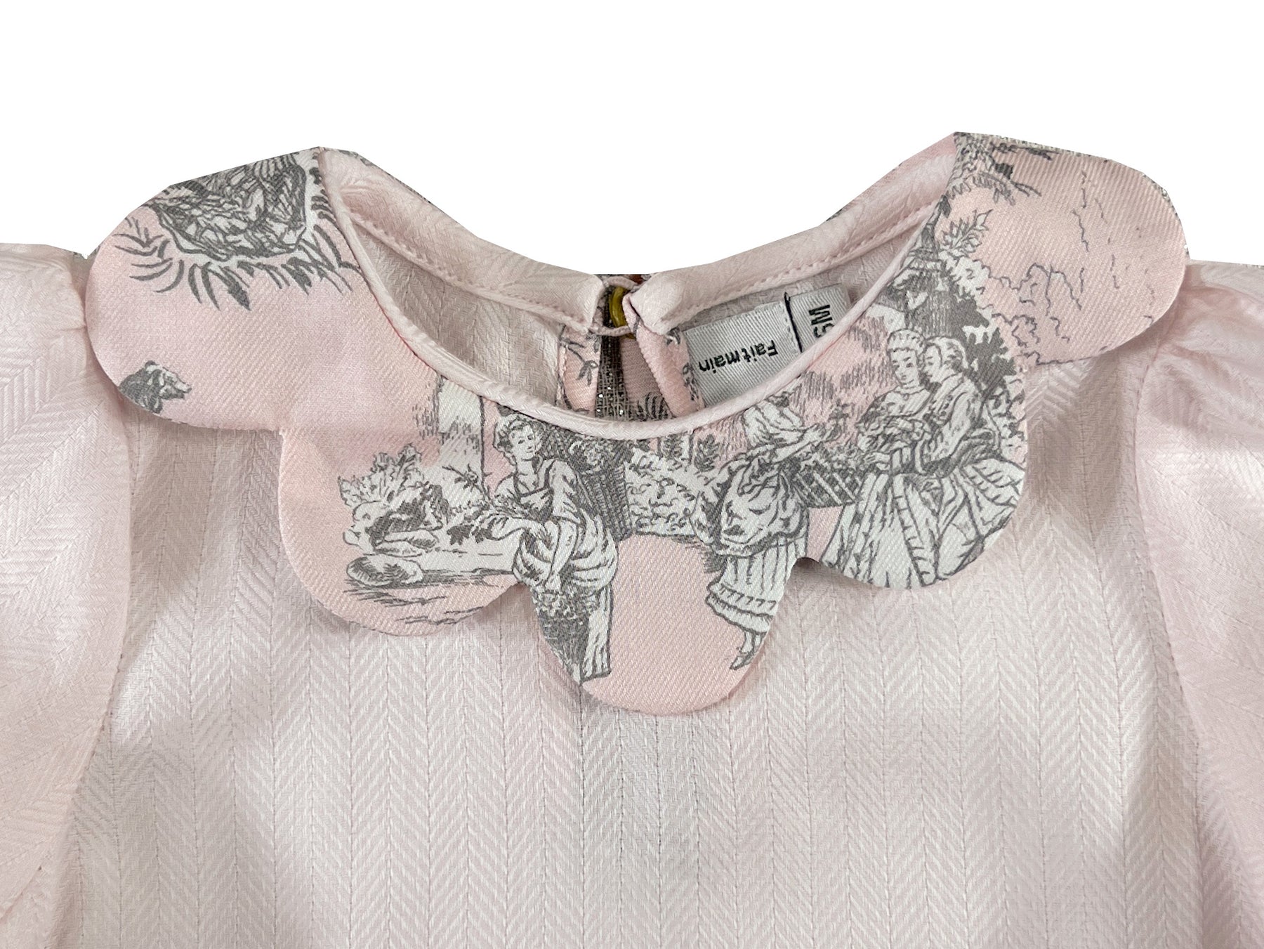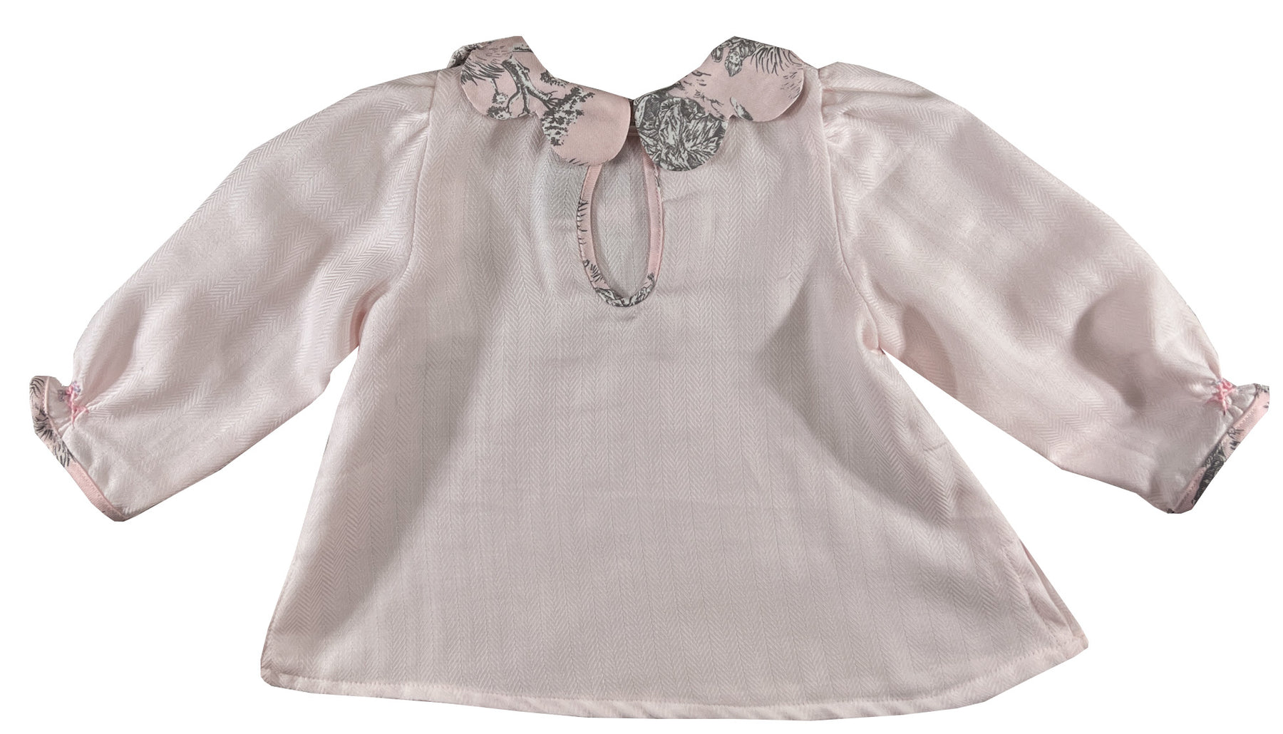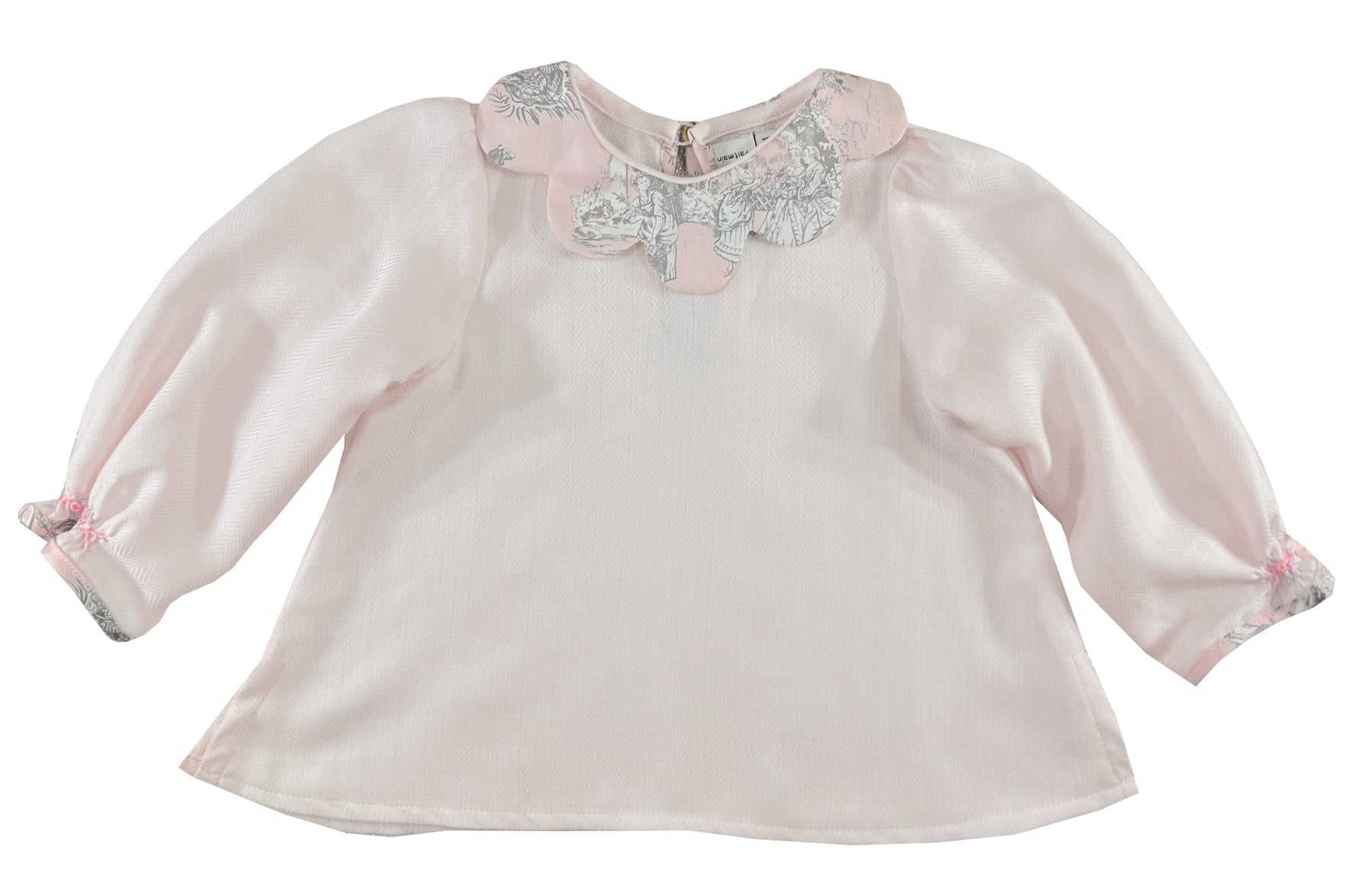 This newborn and baby blouse brings French elegance to the nursery with its distinctive petal shaped collar. The body is crafted in soft pastel pink, while the scallop collar features a classic French toile de Jouy print in grey and pink tones, depicting charming pastoral scenes.