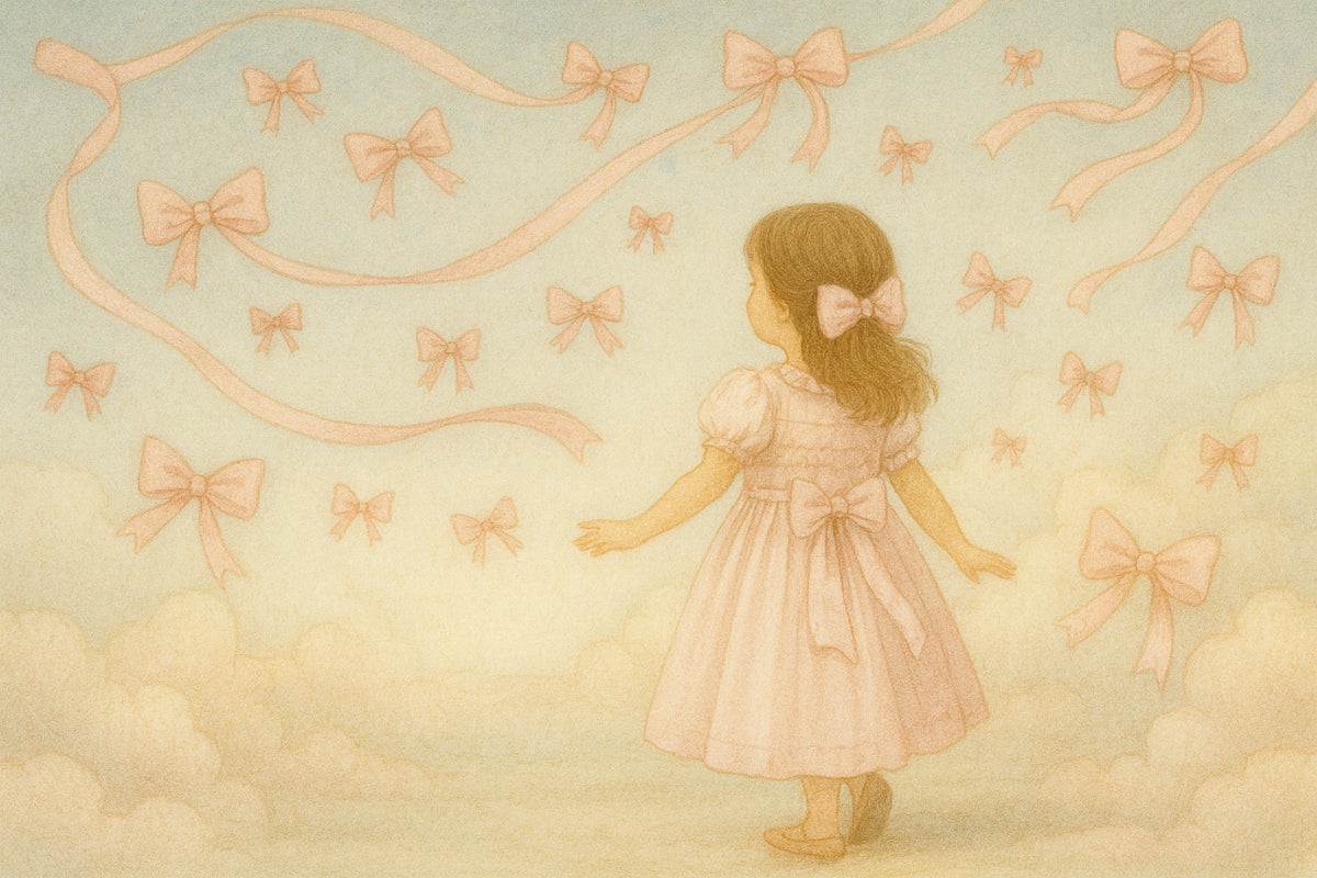 Open the doors of our enchanted wardrobe and step into a world where bows flutter like delicate butterflies and ribbons fly like soft petals blown by the wind above fields of softest pastel. This kingdom knows no gravity, only grace. Everything floats with elegance and little girls dance in perfect, pristine beauty.