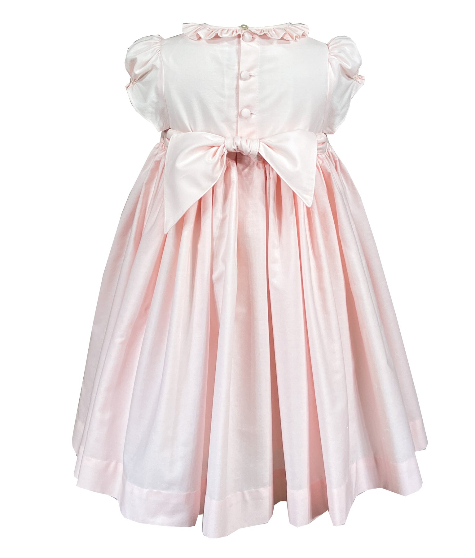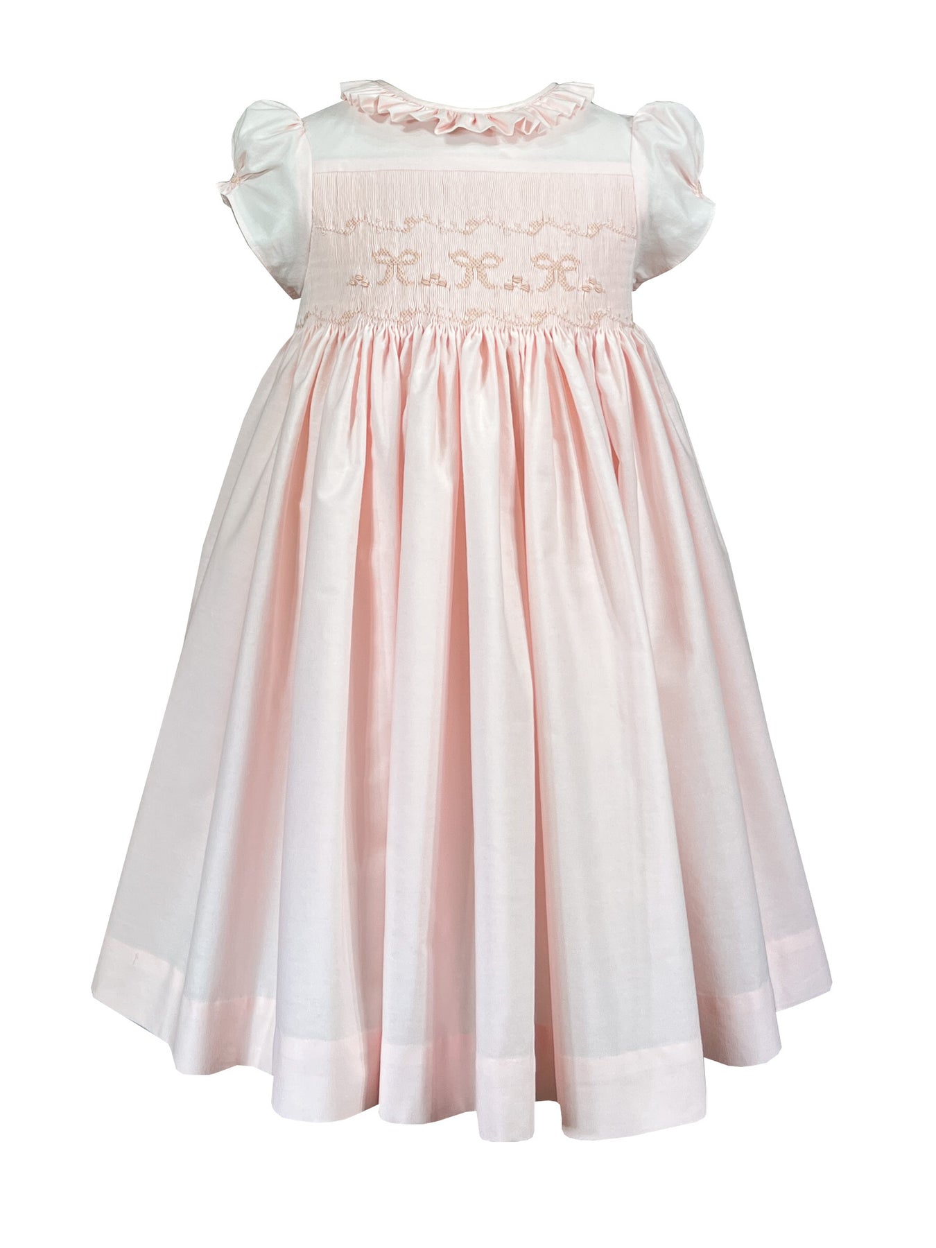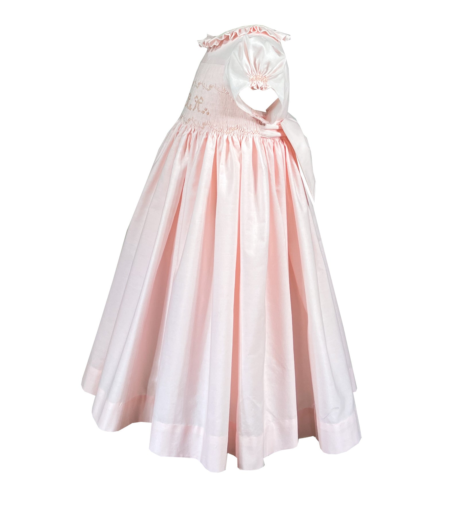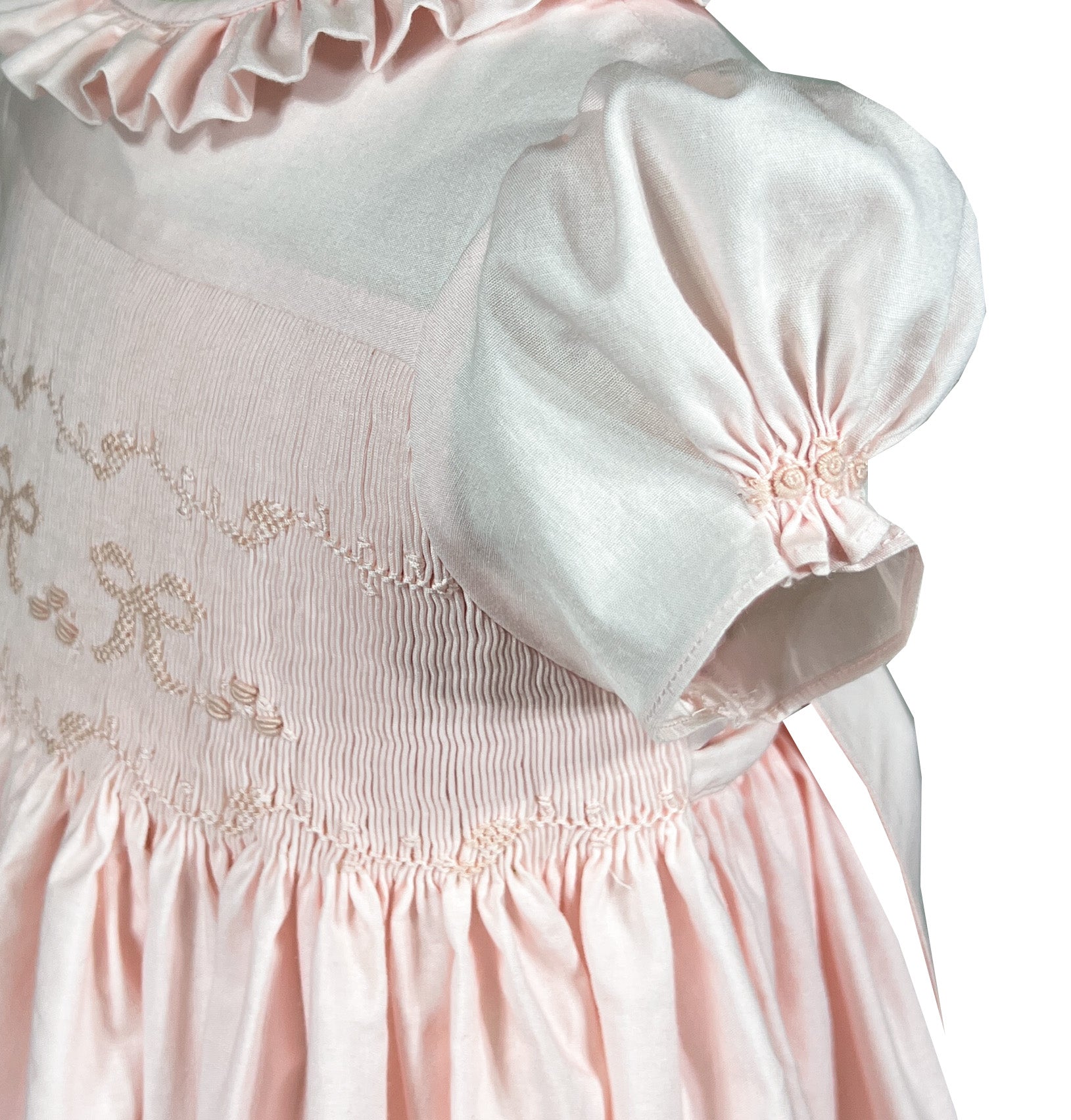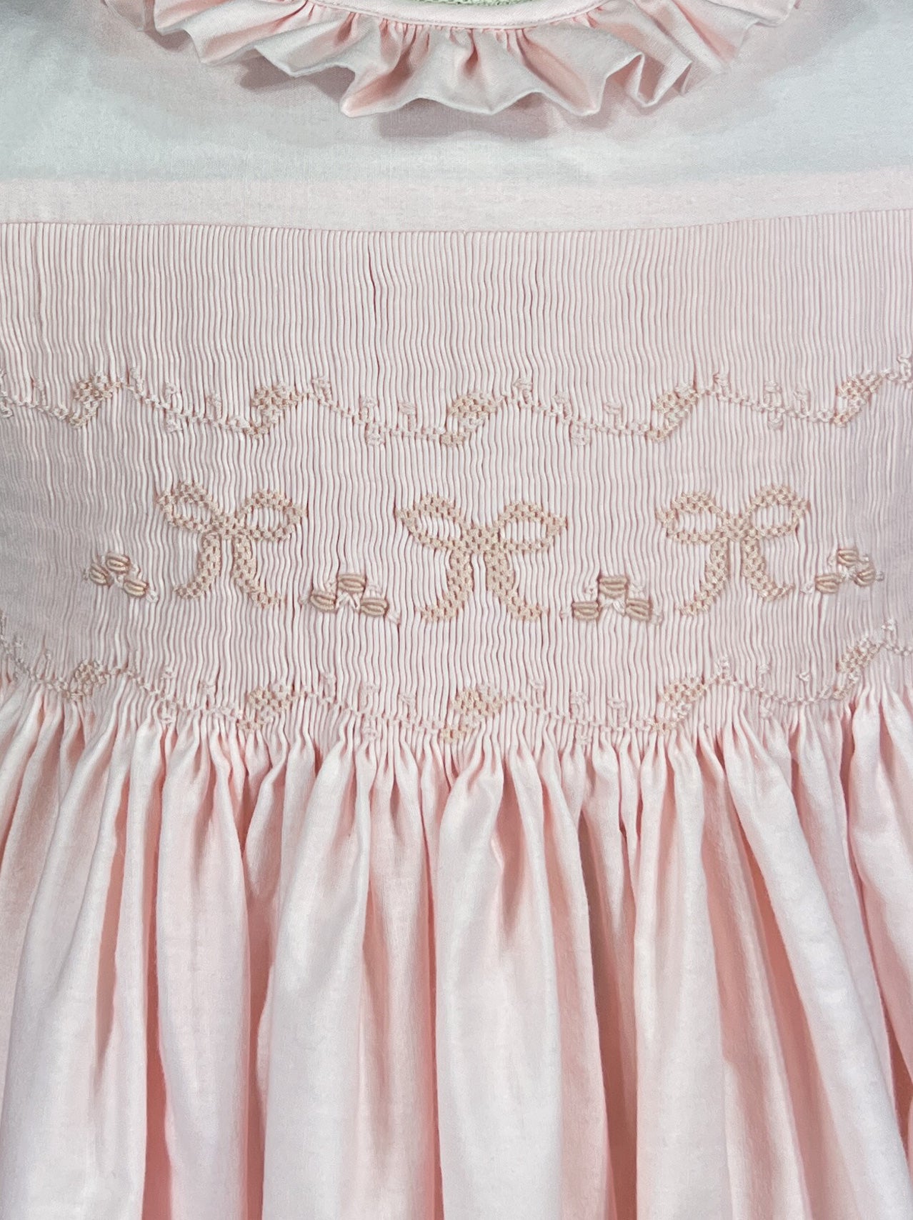 A vision of sweetness in the softest pastel pink with a hint of peach, this dress celebrates tenderness. The bodice features exquisite hand smocking adorned with cascading bows in coordinating shades, each one meticulously stitched to create a three-dimensional garden of ribbons.
