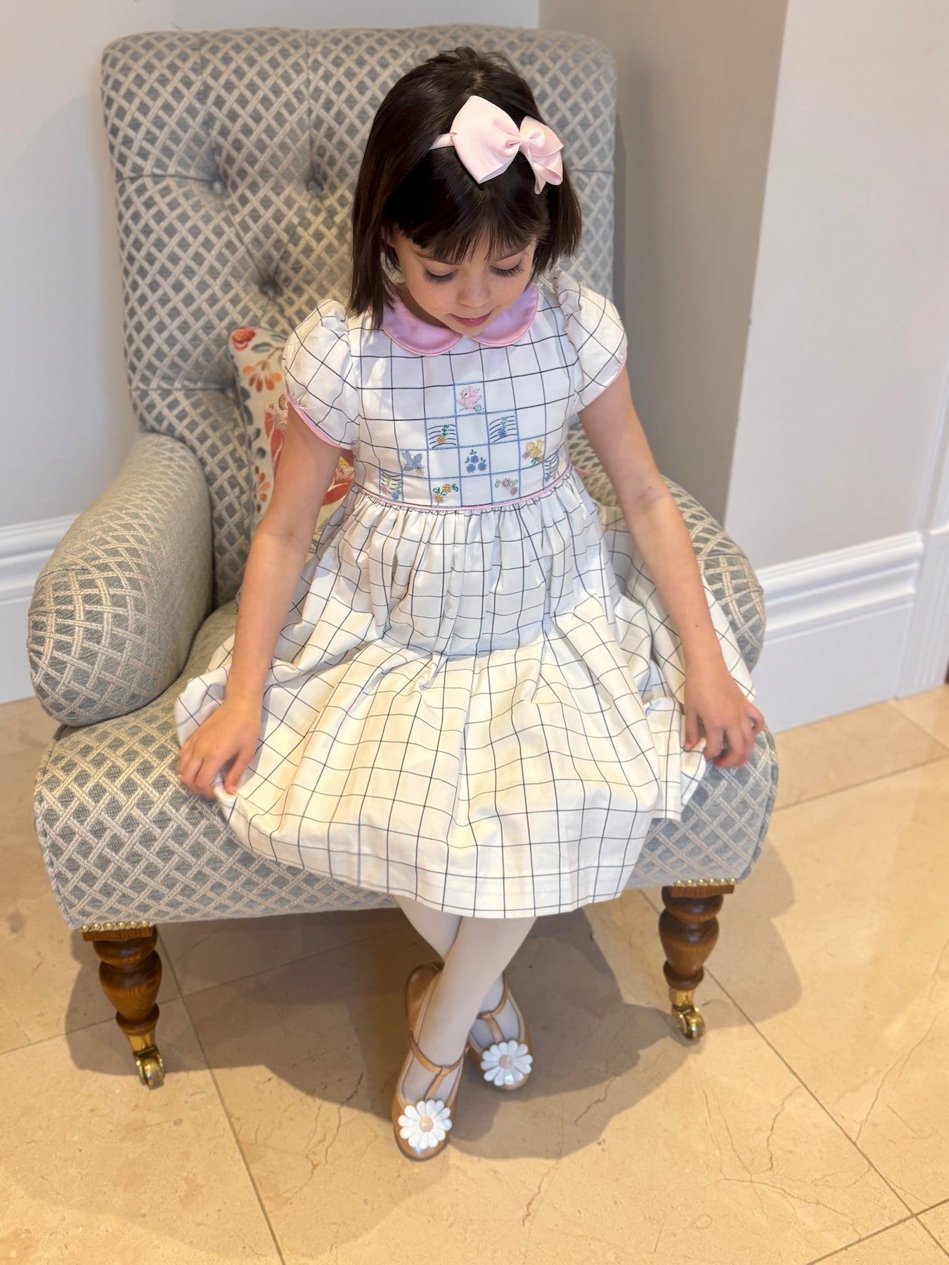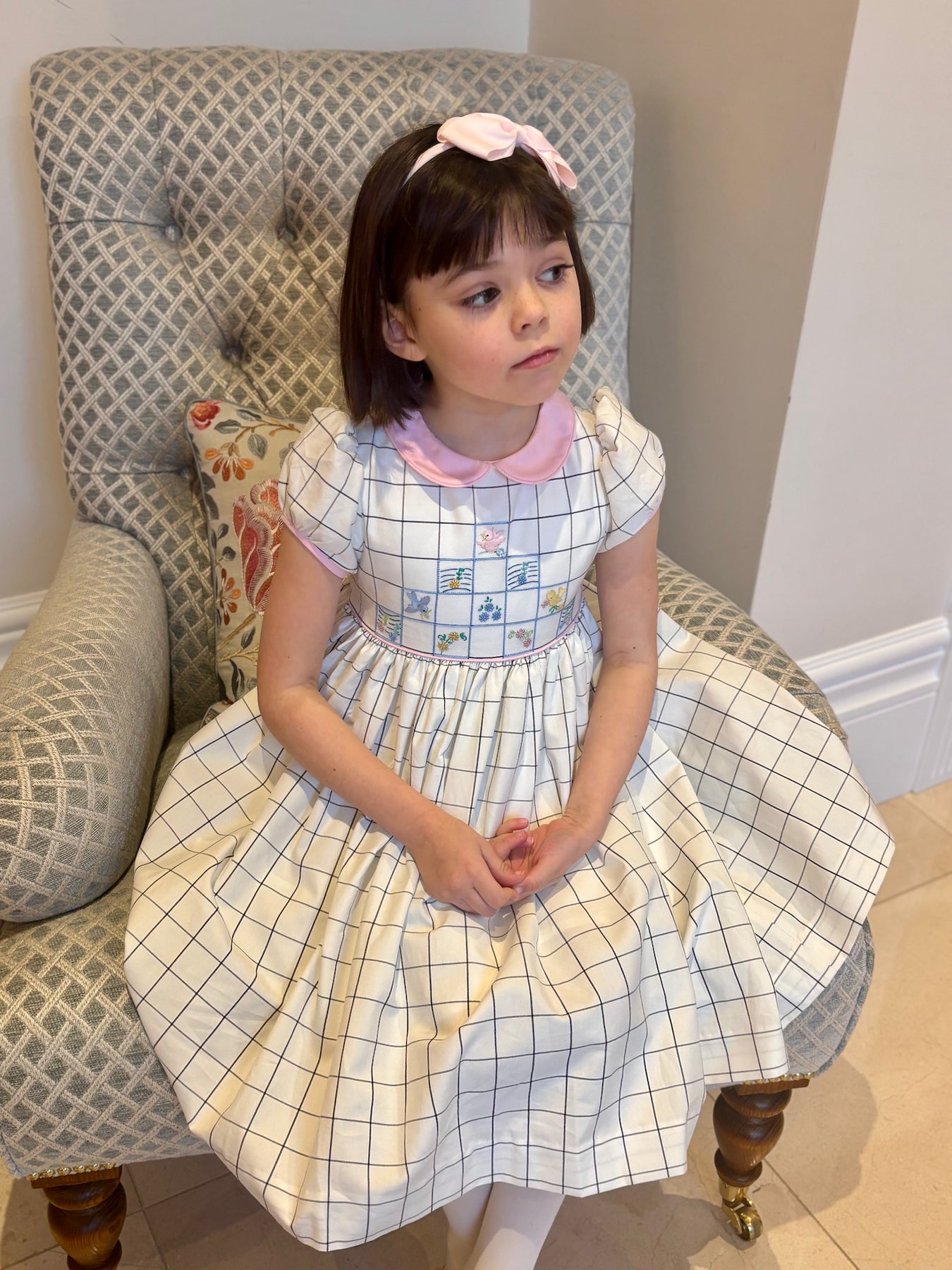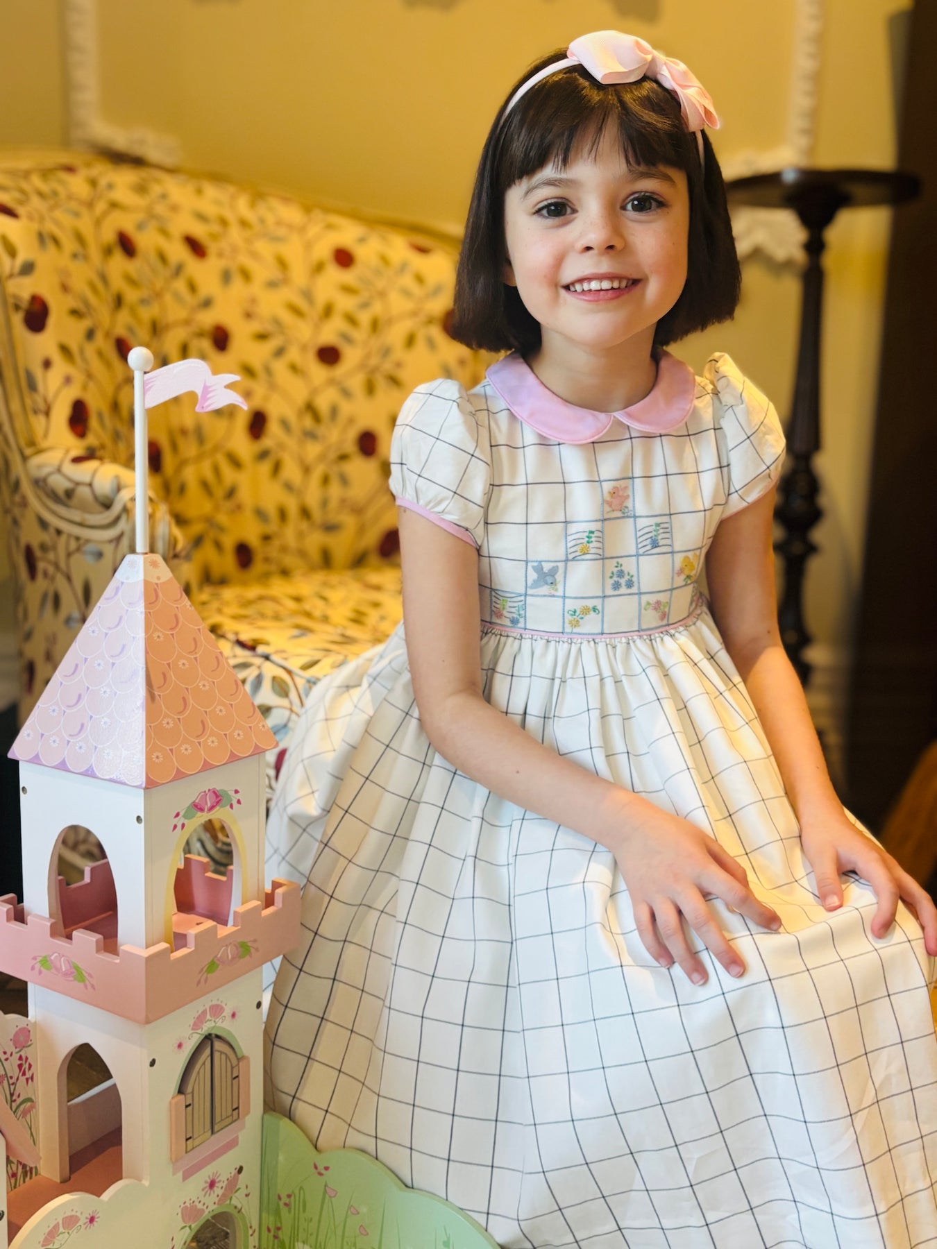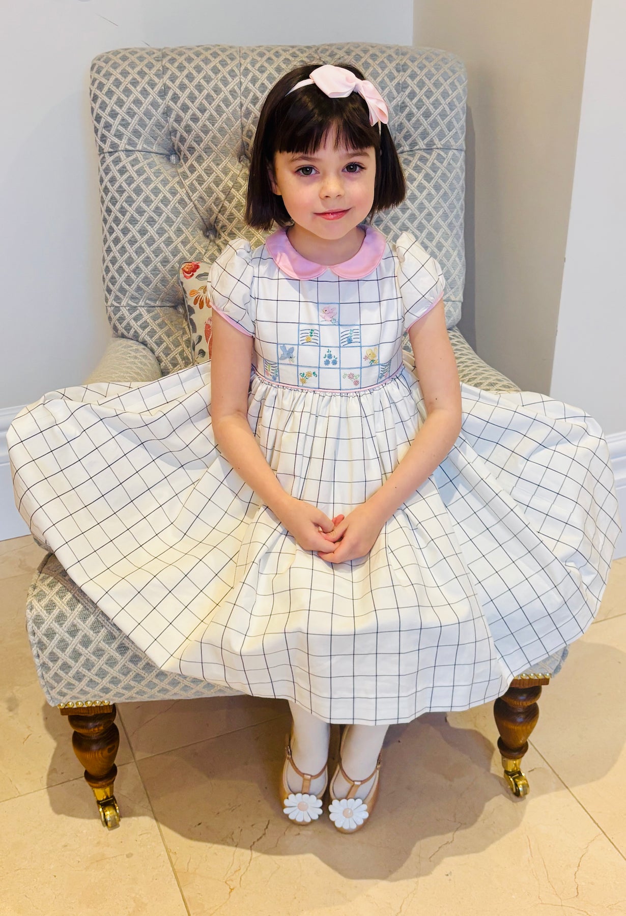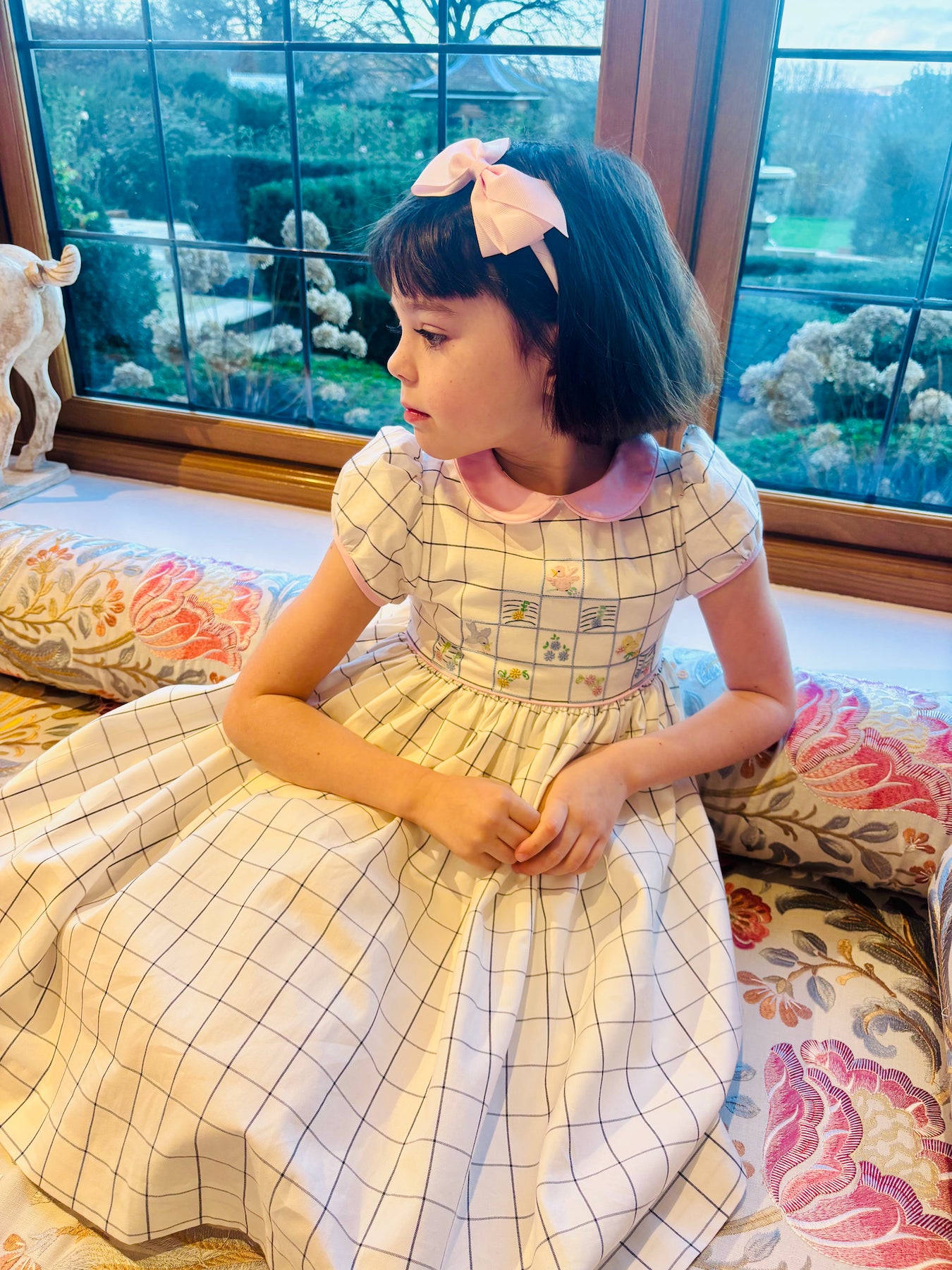 The classic pink Peter Pan collar adds a sweet finishing touch, complemented by matching self covered buttons, as well as trim along the puffed sleeves and waist. The gathered skirt maintains the same sophisticated windowpane pattern, creating fluid movement with every step. A generous sash ties at the back in a luxurious bow.
