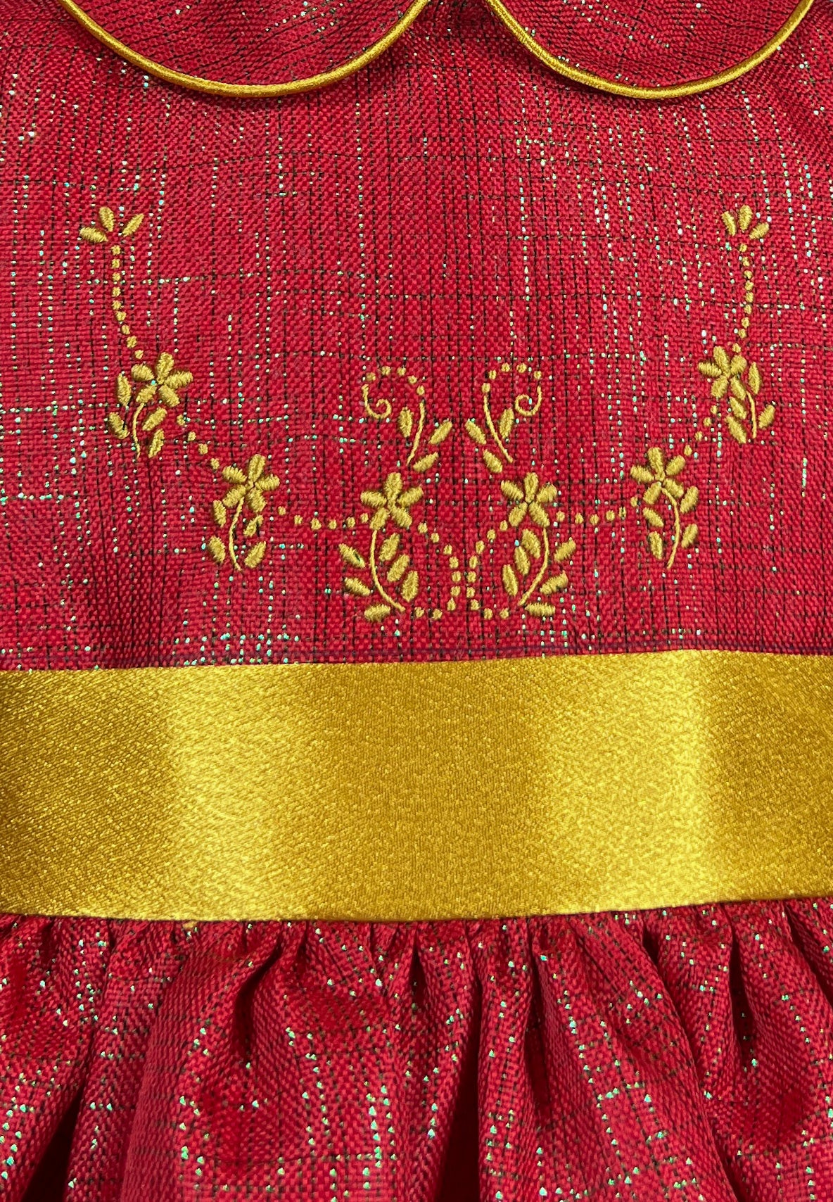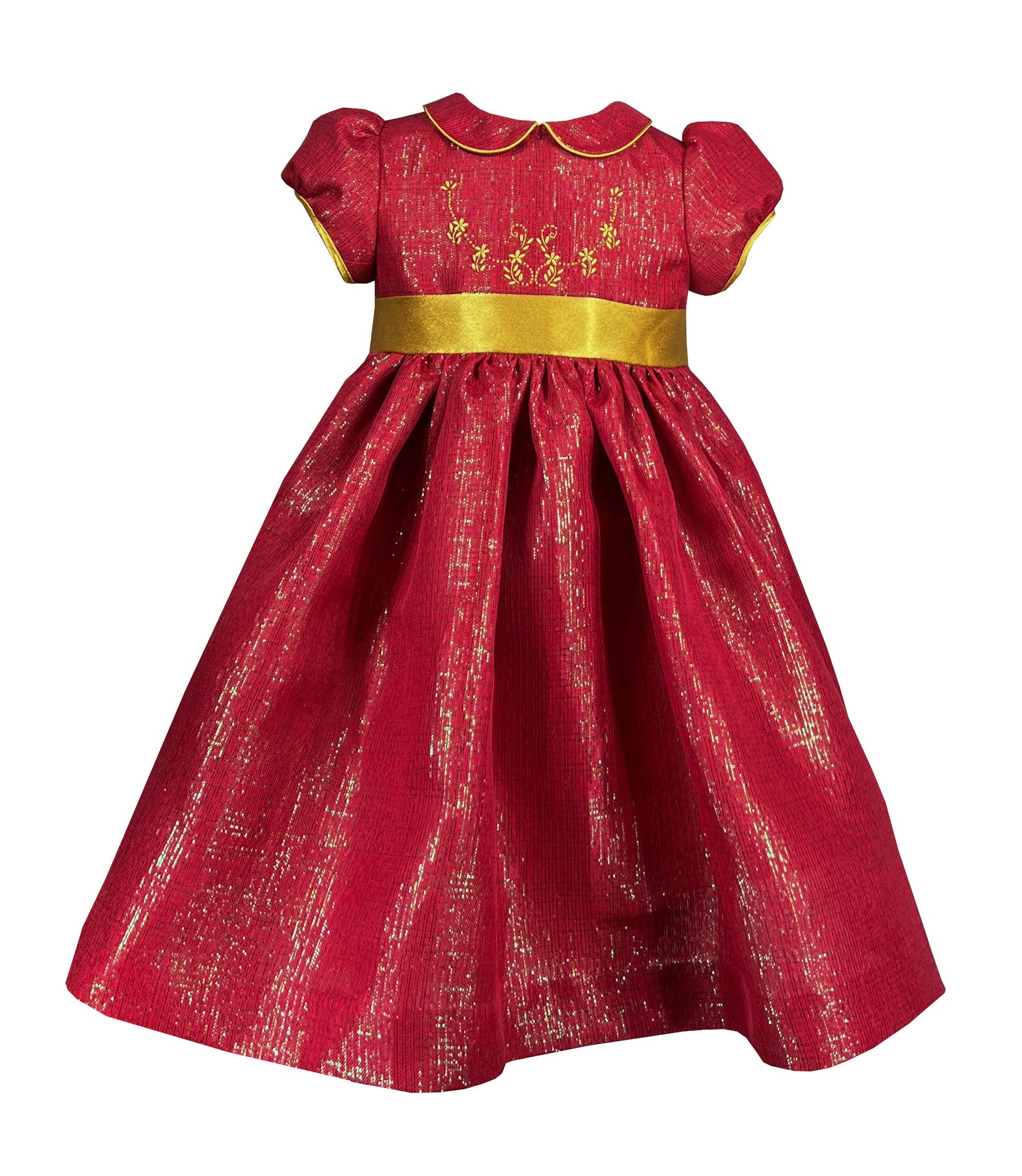 Composition : Crimson fabric blend with golden metallic threading. Golden satin sash with butterfly bow. This dress requires no steaming or ironing.