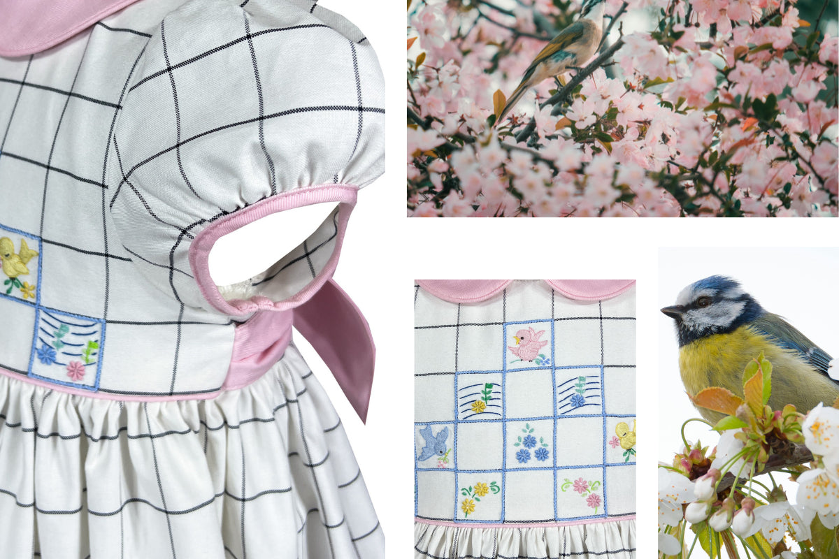 This enchanting dress features delicate hand embroidery depicting cheerful birds and blooming florals arranged in charming windowpane squares. The white base showcases an elegant grey check, while each embroidered vignette framed by sky blue stitching tells its own story: a pink cockatoo perched among blossoms, blue birds carrying branches, sweet yellow sunshine songbirds, and an array of pink and blue wildflowers shaped like music notes dancing across the bodice. Made by hand using traditional embroidery hoops and stitchings, each one a miniature work of art.