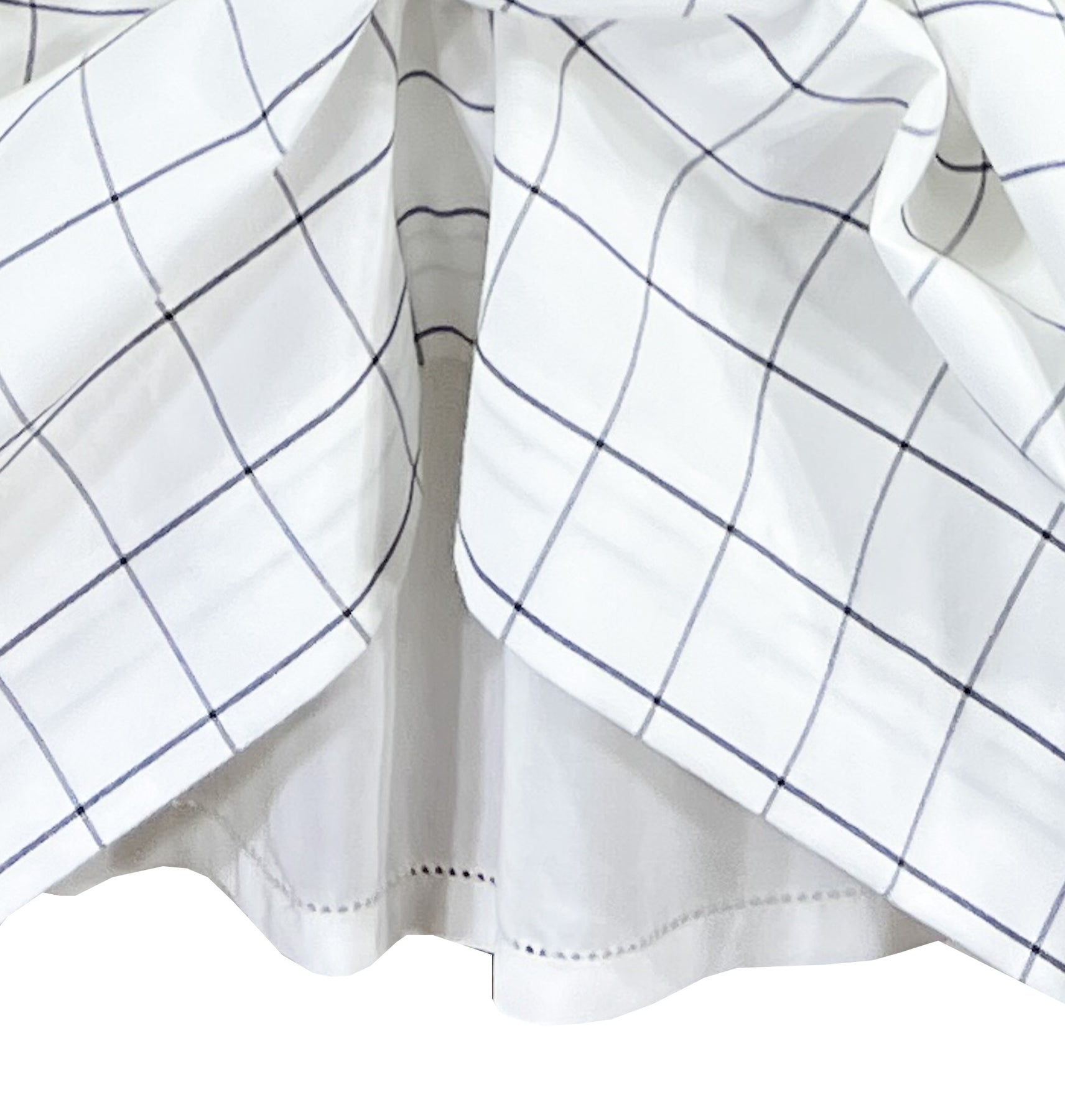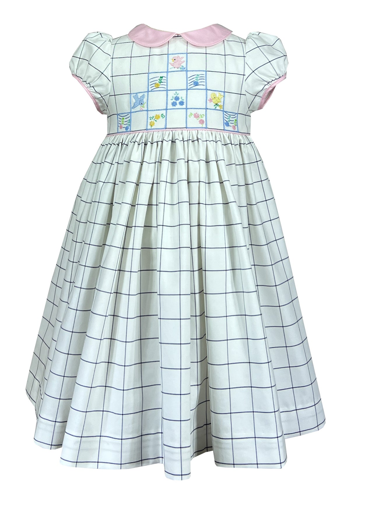 The classic pink Peter Pan collar adds a sweet finishing touch, complemented by matching self covered buttons, as well as trim along the puffed sleeves and waist. The gathered skirt maintains the same sophisticated windowpane pattern, creating fluid movement with every step. A generous sash ties at the back in a luxurious bow.