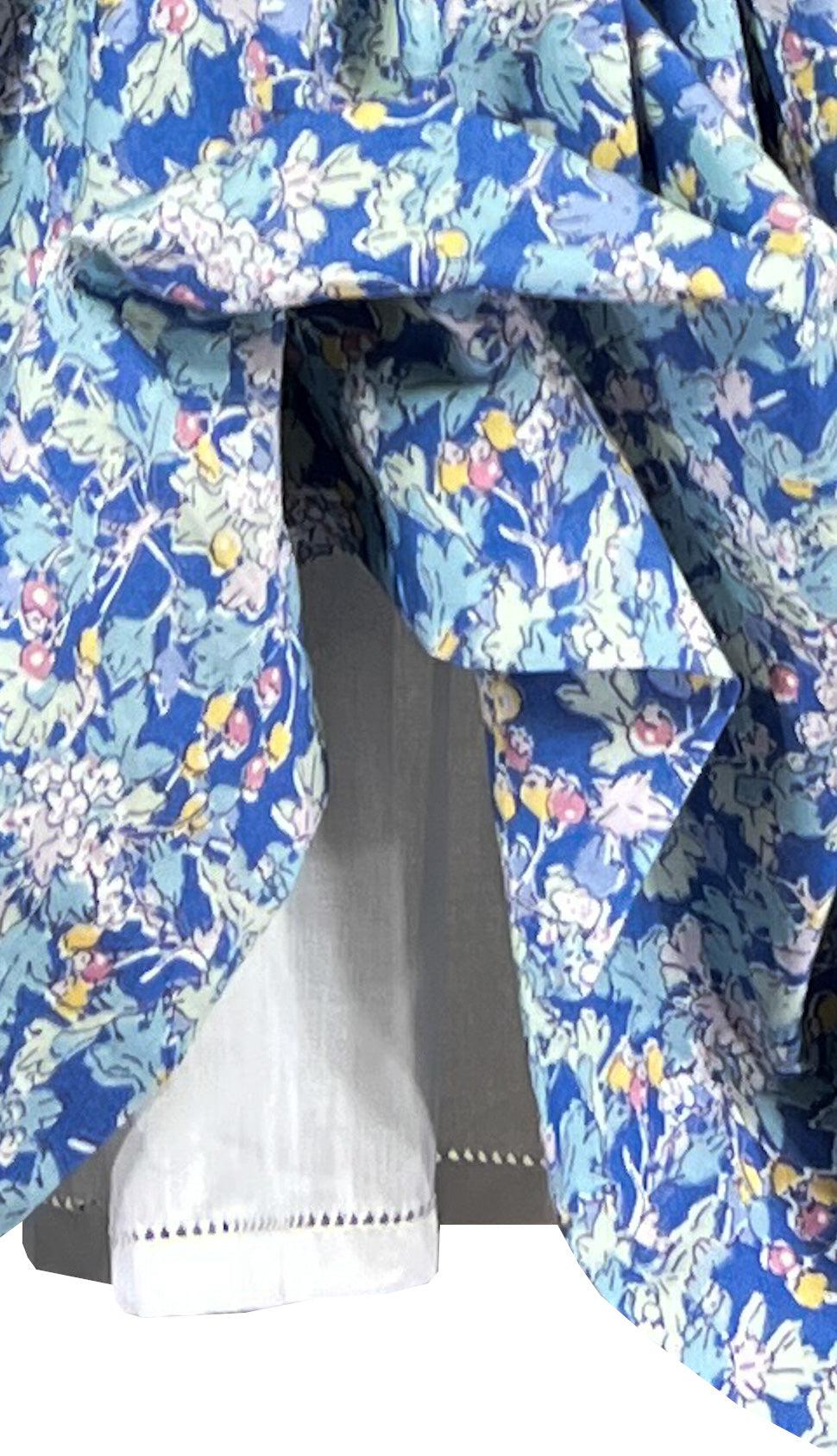 Inspired by Monet's legendary water lily paintings, the Nymphéas Garden dress captures the dreamy beauty of Giverny's most famous pond. Rich blue florals in varying shades from deep cobalt to soft powder blue bloom across the fabric alongside touches of coral pink, creating an impressionist masterpiece in wearable form.