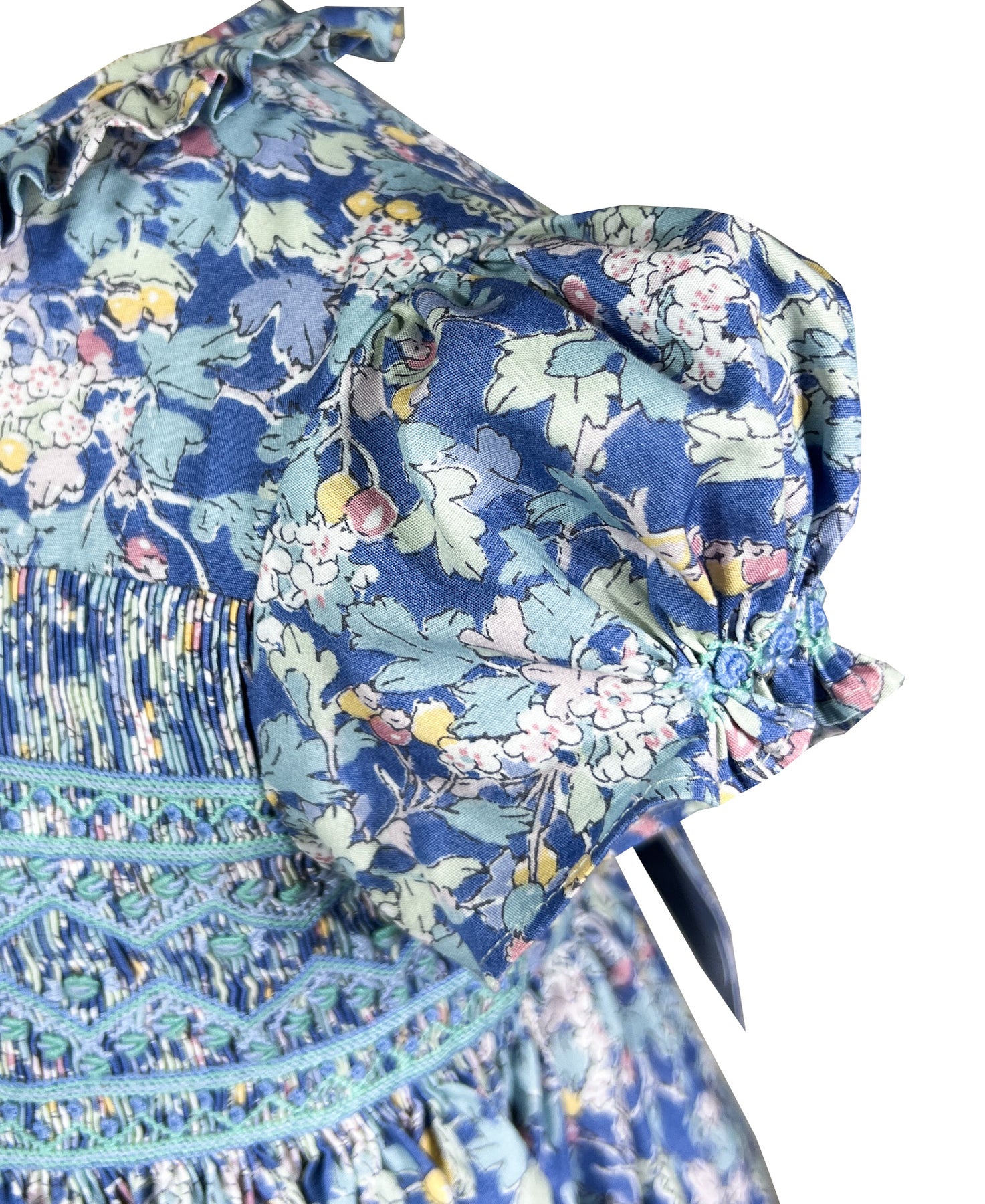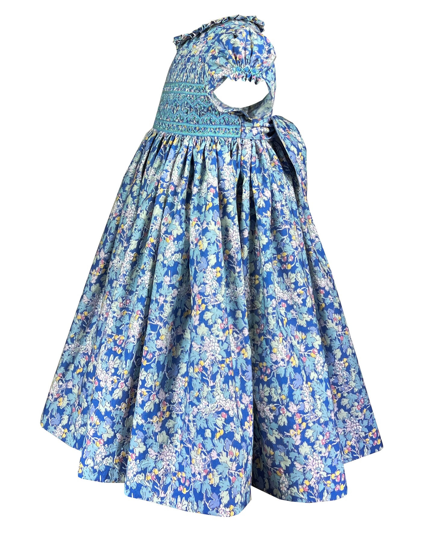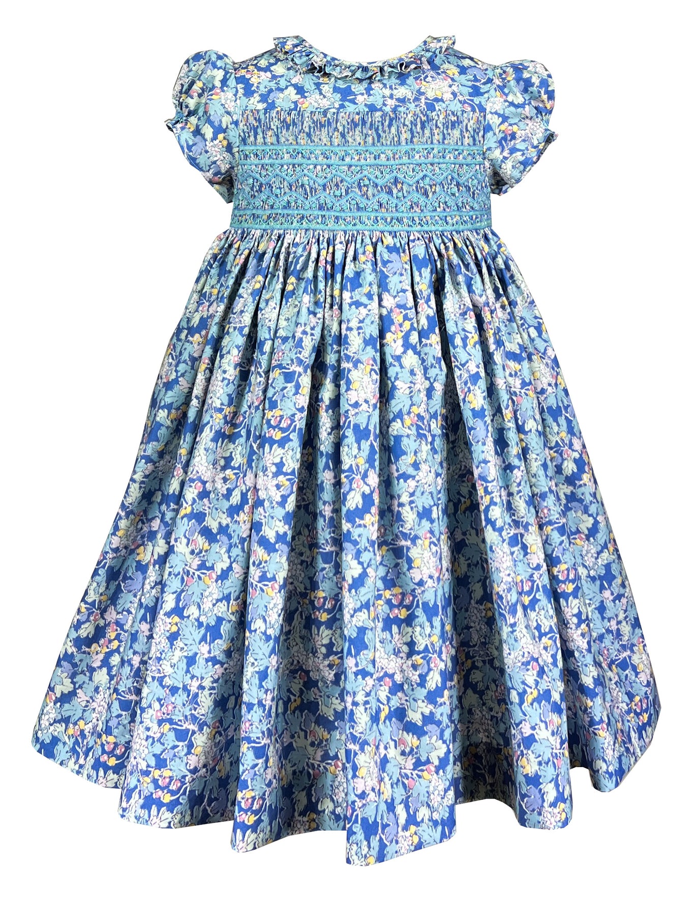 The rounded collar with delicate pleats frames the neckline beautifully, while short puffed sleeves with embroideries create a precious profile. The full gathered skirt flows gracefully from the hand-smocked bodice in luxurious soft and supple fabric that drapes beautifully with every movement, like petals floating on water.