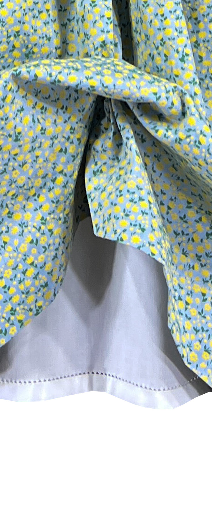 A vision of sunshine in the countryside captured in fabric, the Buttercup Meadow dress enchants in soft yellow and soft green. Tiny flowers scatter across the fabric as if dancing across an endless meadow, creating a joyful tapestry of nature's sweetest colors.