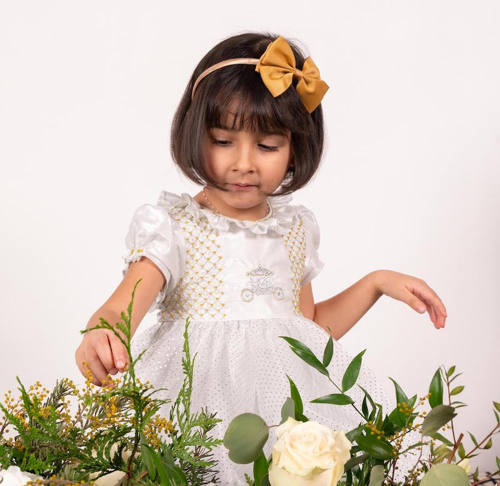 Its bodice, sleeves and butterfly bow sash are crafted in white cotton with subtle silver thread inserts creating a discreet, almost magical glow.