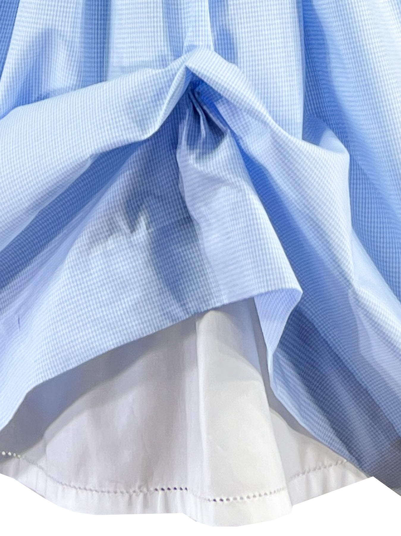 A celebration of morning's first light, the Dawn Blooms dress is crafted in mini checked blue and white satin cotton which recalls the freshness of early hours. At the chest center, a hand embroidered morning glory flower blooms in tone on tone stitching, a delicate tribute to nature's most ephemeral beauty. The threadwork captures the trumpet shaped petals with their characteristic ridges, the unfurling buds, and graceful stems, creating a subtle dimensional artwork that reveals itself upon closer inspection.