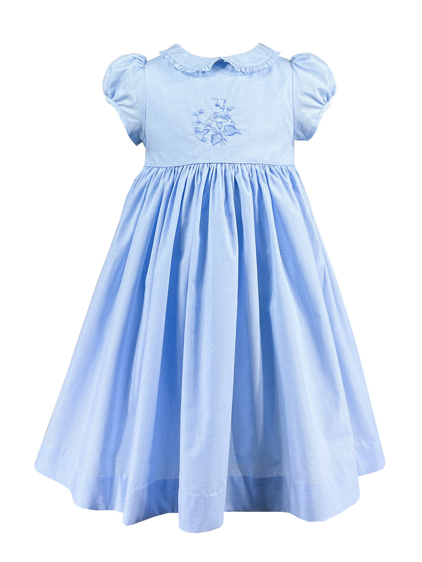 Morning glory embroidered dress in blue check, puffed sleeve gingham dress, vintage style girls clothing