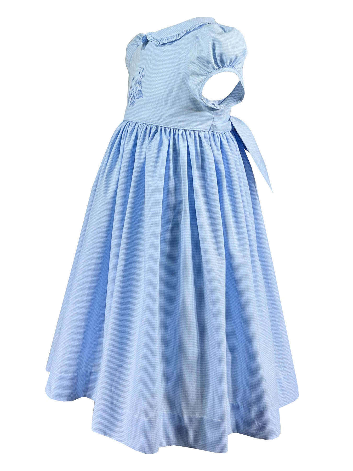 blue satin cotton checked dress with ruffle collar, hand embroidered girls dress, timeless design