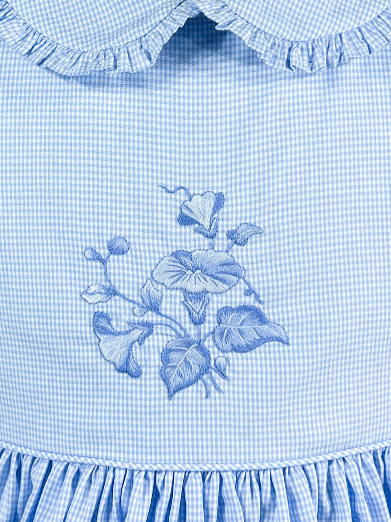 Blue gingham dress with embroidered morning glory, checked cotton girls dress, hand stitched details